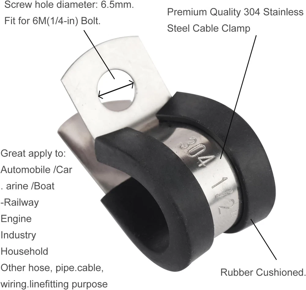 Store New Arrivals Add to Favorite View Feedback Contact 24 PCS 1/2 Inch Stainless Steel Cable Clamps, Rubber Cushioned Insulated Clamp, Insulated Clamp, Metal Clamp, Hose Clamp, Pipe Clamp, Tube Holder, Pipe or Wire Clamp Description Batteries Required? No Color Black Material Stainless Steel Item Weight 0.2 Kilograms Batteries Included? No Size 1/2 Inch Package Dimensions 6.57 x 5.71 x 0.94 inches Premium Material- The Stainless Steel Cable Clamps is made from 304 Premium Stainless steel material with quality rubber cushioned. Salt resistant, anti rust, anti-corrosion, waterproof, oil-proof. Clamps are sturdy, strong and reliable. The quality rubber insulation on the clamps holds up flawlessly. It is pliable which protect the tube well and keeps the clamp securely in place. Wide Application - Cable Clamps are marine grade. Perfect to apply in automotive, industrial, boat/marine, windshield, household etc. for wiring, cables, pipe, rack, line management and restoration. No matter in salt water/air environment. Stylish Design - The P-Style design makes the cable clamps stylish, flexible and innovative.Strong and reliable. Easy to twist, bend, manipulate when install. Compact Size- Cable clamp screw hole diameter: 6.5mm, fit for 6M( 1/4 inch) screw bolt to through them. Cable clamp inside diameter 1/2 inch. Fit for 1/2 inch (outside diameter) wiring, lines,hoses or cables to a panel or frame application. Durable & Reusable - The Stainless Steel Cable Clamps can be reused and recycle if you do not want them to stay on the original place thanks to the high quality material which makes them worked last for years. Premium Material- The Stainless Steel Cable Clamps is made from 304 Premium Stainless steel material with quality rubber cushioned. Salt resistant, anti rust, anti-corrosion, waterproof, oil-proof. Clamps are sturdy, strong and reliable. The quality rubber insulation on the clamps holds up flawlessly. It is pliable which protect the tube well and keeps the clamp securely in place. Wide Application - Cable Clamps are marine grade. Perfect to apply in automotive, industrial, boat/marine, windshield, household etc. for wiring, cables, pipe, rack, line management and restoration. No matter in salt water/air environment. Stylish Design - The P-Style design makes the cable clamps stylish, flexible and innovative.Strong and reliable. Easy to twist, bend, manipulate when install. Compact Size- Cable clamp screw hole diameter: 6.5mm, fit for 6M( 1/4 inch) screw bolt to through them. Cable clamp inside diameter 1/2 inch. Fit for 1/2 inch (outside diameter) wiring, lines,hoses or cables to a panel or frame application. Durable & Reusable - The Stainless Steel Cable Clamps can be reused and recycle if you do not want them to stay on the original place thanks to the high quality material which makes them worked last for years. ABOUT US We offer the best prices around on high quality products. Our E-store includes media such as books, movies, music and games while offering electronics, toys, sporting apparel, clothing, tools, general home, garden items and more. SHIPPING We are always working hard to ensure your package arrives as soon as possible. Please understand that some factors like weather, high postal traffic, and the performance of shipping companies are outside of our control. We offer free shipping to the lower 48 states and ship within 2 business days of payment, usually sooner. We do not accept P.O. Boxes. Please provide a physical address. RETURNS We offer a 30-Day Return Policy on items which you are not completely satisfied with. You have the option for a full-refund or an exchange of the item. No returns are available on items shipped outside of the USA. PAYMENT We accept PayPal. CONTACT US This page content is yet to come Please ad us to your favorite seller and visit again later Thank You CUSTOMER SATISFACTION We try our very best to make sure every customer is completely satisfied. If there's a problem, message us! We're happy to help.