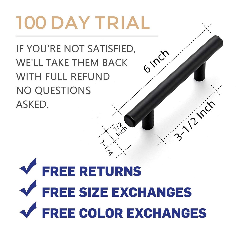 For over a decade, has always been committed to bringing the best home revitalization experience to our users for we deeply understand what does a beautiful and fashionable house mean to a whole family. The Euro-style cabinet handle finished with satin nickel provides an elegant modern flavor to your cabinet and even your whole room. Fashionable and durable design coordinates with many décor themes, and are proven to be functional and elegant through years of use. Stainless steel handles can be used anywhere in the house to revitalize your kitchen or bathroom and provide any furniture updates. 15 handles in a coordinating design and finish with mounting holes can also be applied in cabinet drawers. Decorative Cabinet Hardware Revitalization with cabinet pulls is perfect for accenting the décor and style of existing cabinets or furniture. Decoration with our cabinet handles provide you with great convenience to change look and feel of an entire room. Stainless Steel Cabinet Pulls Adds a Distinguished Look The cabinet bar pulls elaborately crafted and designed to beautify your house with their simplicity. Tough Durable Design The lightweight but durable cabinet pull is built to withstand over years of wear and tear. They have a nice weight to them and come individually wrapped to protect against any scratches. Sleek Appearance Quick and easy install Screws included Measurement:Hole centers(CC):3-1/2 inch(89mm), Total Length:6 inch(152), Diameter:1/2 inch(12mm) Projection:1-1/4 inch(32mm) Sturdy: 24 bar pulls made of stainless steel finished with classic matte black coordinates well with other appliances and accessoriess Versatile: These functional, elegant, and modern matte black pulls are widely with various cabinet styles, wardrobes, wine cabinets, chests, and cupboards. The Euro-style design enhances any room’s décor. Includes screws for easy installation If you're replacing your handle, measure and ensure the center to center hole spacing of the current handle is 3-1/2 inches. Installing new cabinet handles, drill holes with center to center spacing of 3-1/2 inches Customer Support: If you have any questions or issues, reach out to us. We’ll respond within 24 hours and do our best to resolve any issues