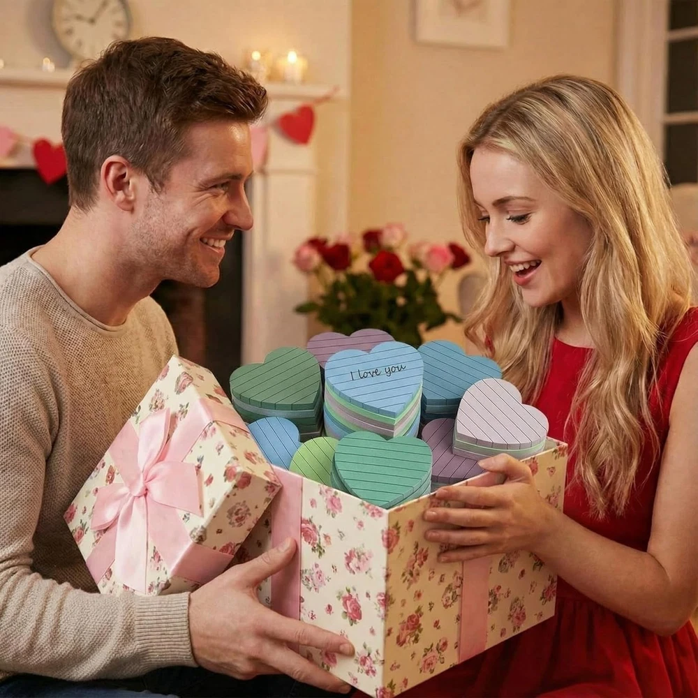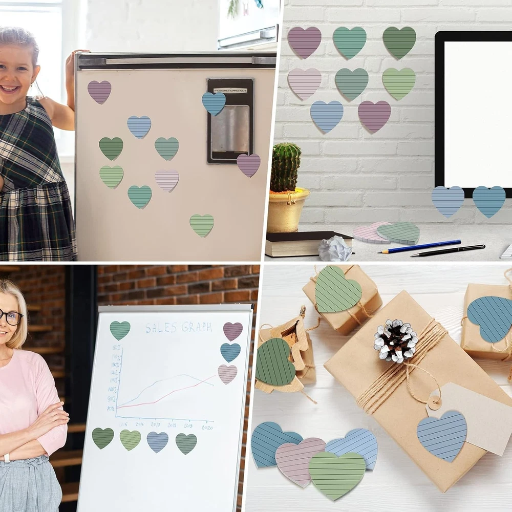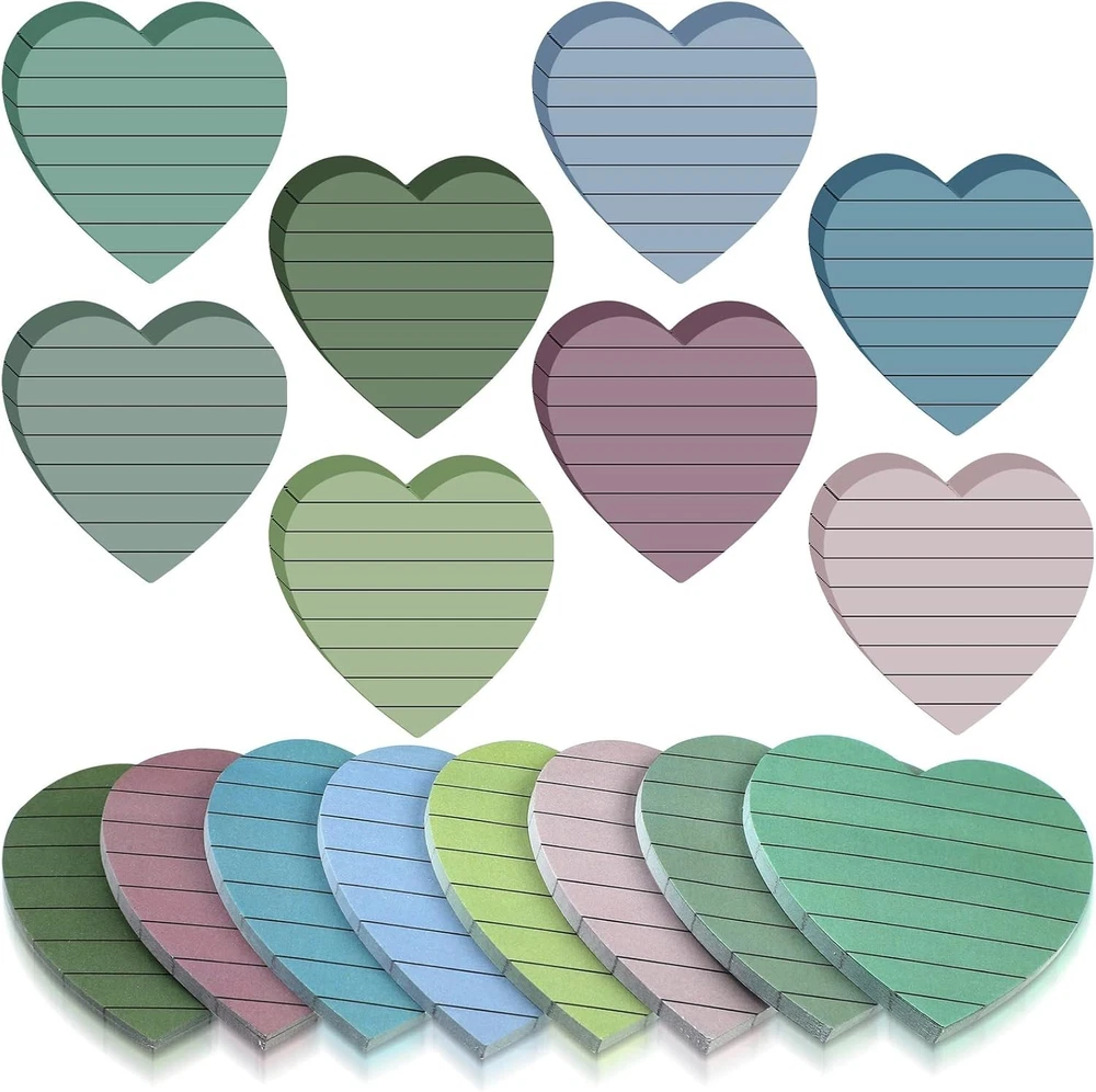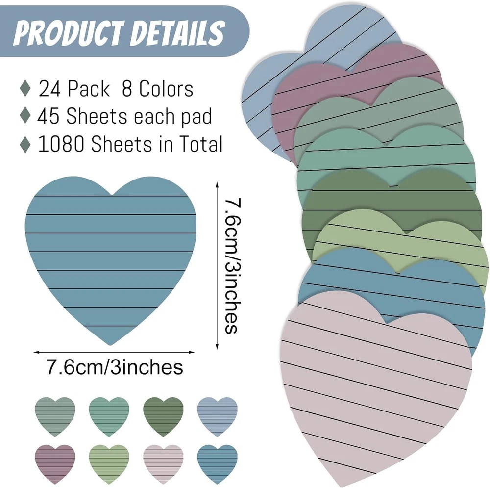 Teling 24 Pack Valentine's Day Sticky Notes Heart Lined Sticky Notes Self Adhesive Love Memo Pads for Valentines Party Exchange Gifts Office Home School 3x3 Inch(Bright Color,Classic) About this item Portable Size: you will receive a package including 24 pads heart sticky notes of the same shape but different in 8 colors, 3 pads of each color, and each pad of sticky notes is approx. 3 x 3 inches; And there are 45 sheets sticky notes in each pads, enough quantity to meet your daily needs Colorful Design: these cute notepads packs come in 8 colors, including blue, light blue, green, yellow, orange, rose red, pink and purple, bright memo pads making your message more noticeable to meet your daily needs Quality Paper Material: these Valentine's Day sticky paper pads are made of quality paper, with strong viscosity and smooth writing, without leaking ink; They can be applied for several times without leaving any residue, which can keep clean and tidy Strong Adhesive: the Valentines self sticky notes have strong adhesive to make sure not falling off; They can be pasted on the wall, blackboard, computer, desktop, refrigerator and almost all other smooth surfaces, and can be removed cleanly as well Wide Uses: the Valentine's Day lined sticky notes are suitable for Galentines day party favors, office and family to stick on refrigerator, desk and other wood and plastic surfaces for leaving messages, reminding, classifying, instructions, marking and more; Please note that the place to be applied needs to be dry and dustless