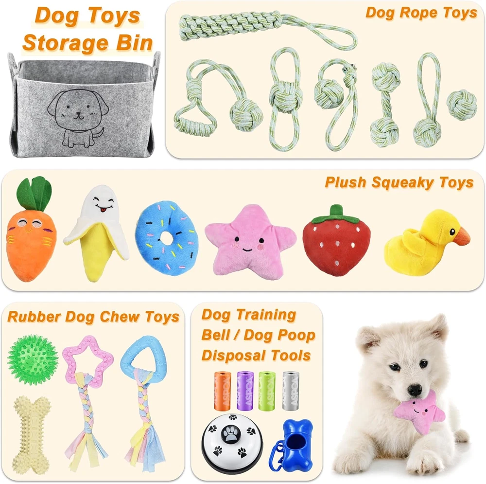[Great Value Dog Toy Set] 23PCS puppy toys and a square dog toys storage bin. List: 7 dog rope toys, 3 rubber chew toys, 1 small dog squeaky ball, 6 plush squeaky dog toys, 1 dog bell for training, 4 rolls dog poo bags, 1 poo bag dispenser and 1 square dog toys storage bin [One Set for Satisfying Multiple Needs] For puppy teething, teeth cleaning, interactive tossing and fetching games, tug of war, dog training, dog toys storage and cleaning up dog waste, etc. Save your time & Save your money & Satisfying you and your fur-friend [Organizational Solution for Home] Stow your dog's things together to avoid mess and loss; In addition to storing dog toys, the felt storage basket can also be used to hold dry dog treats, leashes, collars, toys, blankets, outfits, grooming supplies and more [Take Good Care of Puppy] Developing good habits starts with your puppy! Prevent future furniture tearing and oral problems by using these toys and training bells to help your dog de-stress and play while developing good, healthy habits [Warm Tips for This Dog Toy Set] Our dog chew toys are rigorously tested for quality and safety; Please note that these toys are not suitable for aggressive chewers, we recommend supervised play and timely replacement of broken ones Product Description Just Get It And Have Fun! LECHONG 24pack Small Dog Toys This dog toys bundle include 24 most popular small dog chew toys, rubber toys, rope toys and squeaky toys. A great value set. SQUEAKY DOG TOYS FOR SMALL DOGS those squeaky toys are perfect size for small dogs, and bi-bi sound is more attractive to dogs. Soft surface won't hurt dog teeth, three layers of thickened fabric for extra bite resistance FUN OUTDOOR GAME Those dog toys not only can provide hours of fun, but also can help dog clean their teeth. by chewing those toy, your dog's gums are massaged, making them more capable of maintaining a healthy mouth. DURABLE ADN TOUGH DOG RUBBER TOYS Come with some pink dog toys, made form natural rubber, safe for your dog to chew. and those rubber toys are made to last, can stand with dog's sharp teeth. But not recommend for aggressive chewers. Dog Toys Set for Starter Perfect Gift for Your Fur Friends If you just got a puppy, then this puppy playset is perfect for you. He includes the puppy's favorite toys and has 4 rolls of poop bags and a training ringer. Perfect for starter. What are the products included in this dog toys set? This dog toys set include 7 dog rope toys, 6 dog squeaky toys, 4 TPR rubber dog toys, 1 training bell, 4 roll poop bags, 1 poop bag holder and 1 toy storage box. What are the dimensions of this toy organizer bin? 11*8.6*7.8 inch (28*22*20 cm) What breed of dog is this playset for? This dog toys pack is suit for smalld dogs, like Chihuahua , Pomeranian Corgi .etc