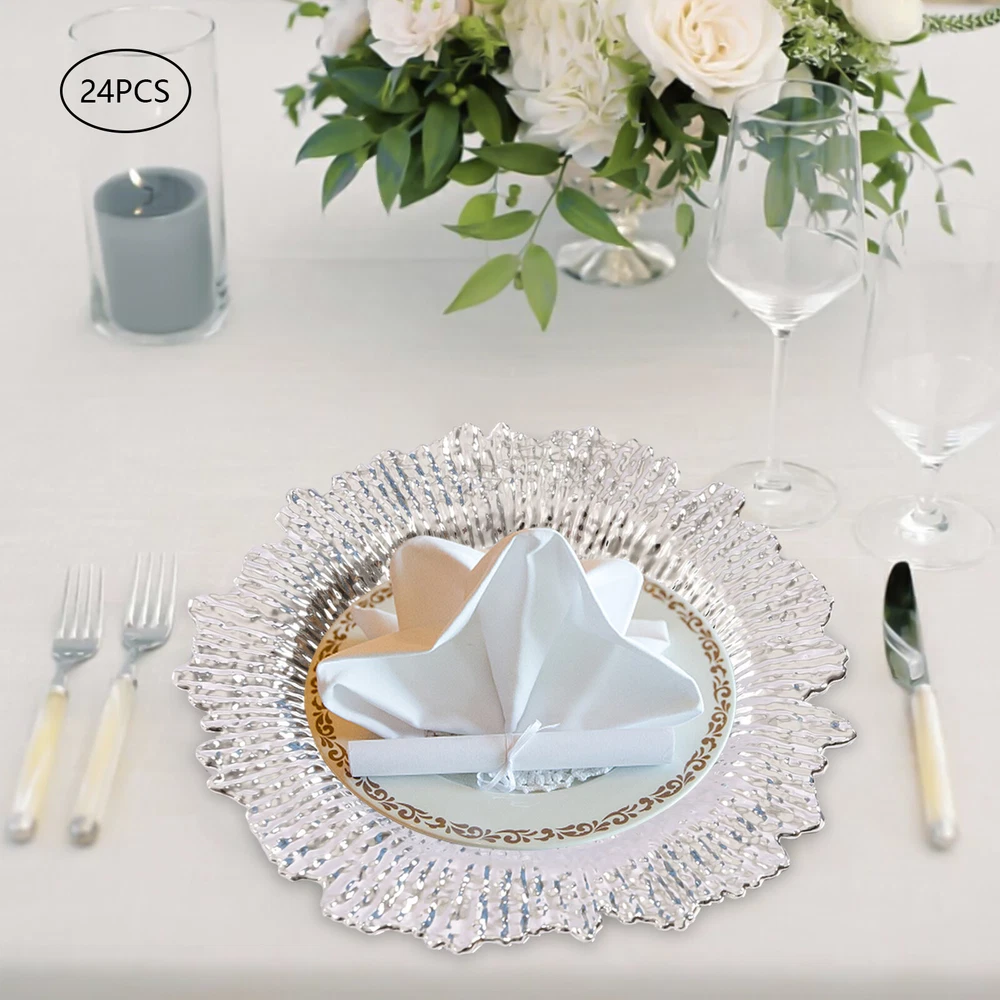 24 Pack Round Plastic Charger Plates Wedding Dinner Reef Plate Serving Plates Description 24 Pack Round Plastic Charger Plates Wedding Dinner Reef Plate Serving Plates Application It Fits Under Salad Plates, Soup Bowls and Entrée Plates less than 11inch in Diameter and Is Used in a Variety of Restaurants, at Wedding Banquets and Celebrations, As Well As in Your Home. Specification Material: Pp Surface Process: Plating Quantity: 24 Color: Silver Special Feature: Hard Occasion: Wedding Package Size: 33.5*33.5*15cm/13.19*13.19*5.91in Each Product Diameter: 33cm/13in Gross Weight: 4.6kg/10.14lbs Net Weight: 4.2kg/9.26lbs Package Included 24*Charger Plates Description How Should We Show Our Respect to Our Visitors? a Great Table Layout Can Do That. Use These Elegant Charger Plates As a Frame for Your Main Course! They Can Hold Dinner Plates and Bowls While Taking the Look of Your Table to the Next Level. It Easily Adds an Elegant and Chic Touch to Your Table, Transforming a Simple Table Setting into a Stylish One. Your Guests Are Sure to Be Impressed by Your Careful Layout. Key Features High-quality Material : the Set Is Made of Stronger, Thicker and Wear-resistant Pp, so It Is Not Only Durable but Also Very Environment-friendly. Spill-proof Function : 13 Inches in Diameter, These Charger Plates Fit Under Salad Plates, Soup Bowls and Main Course Dinner Plates to Prevent Your Table from Being Spilled. Luxurious Decoration : It Easily Adds an Elegant and Chic Touch to Your Table with Its Textured Coral Reef Pattern and Classic Round Shape, Transforming a Simple Table Setting into a Stylish One. Complete Set : This Is a Set That Includes 24 Charger Plates, so You Can Meet the Needs of a Whole Table for a Large Family at Once. Easy to Clean : Each Charger Plate Has Been Carefully Plated. This Treatment Makes the Surface Smooth and Easy to Clean and Maintain by Simply Washing It Under a Hot Water Rinse. Space-saving : These Charging Plates Can Be Stacked for Storage After Use, Maximizing Space Usage. Lightweight : This Set Is Approximately 10.14lbs, Allowing You to Easily Pick up and Move It to Where You Want to Place It. Guaranteed Customer Service: We Aim to Provide Quality Products and Services. If You Have Any Problems, Please Feel Free to Contact Us. We Will Reply and Solve the Problem for You As Soon As Possible. Details Coral Reef Texture : It Features a Clear and Even Coral Reef Texture That Not Only Highlights Its Vivid Appearance but Also Prevents Your Tableware from Sliding Around. Petal Rim : Each Charger Plate Features an Irregular Petal Rim Design That Is Not Only More Beautiful but Also Non-sharp to Prevent Scratching Hands. Notes 1. Please Note That These Plates Are Not Suitable for Cleaning in the Microwave or Dishwasher. 2. Please Allow the Slight Color Difference Caused by the Shooting Light and 1-3cm Error Due to Manua l Measurement, and Make Sure You Do Not Mind Before You Place the Order. tu1 Payment Delivery details Terms of sales About us Contact us Payment We accept ebay payment 。 Fees such as import duties, taxes are not included in the item price or shipping costs. These charges are the buyer's responsibility. Delivery details Shipping: 2-9 working days to: USA Terms of sales We maintain high standards of excellence and strive for hundred percent customer satisfaction. Feedback is very important to us. We hope that you contact us immediately before you give neutral or negative feedback, so that we can address your concerns. It is impossible to address issues if we do not know about them! About us Your satis faction is our ultimate goal. We work hard to earn your trust and future business. Our certified technicians have tested each item before shipping. The unit comes with 1 year limited warranty on all manufacturing defects. a) If you receive a defective item, you may return it or ask for a discount. Please contact us within 14 days after you receive the package. b) What you returned must be intact and in its original packaging as re? u. Customer is responsible for shipping costs of the returned item. c) We will cover the cost of shipping back t with the shipping rate indicated in the registration page. We will send you a new unit or refund the full payment you paid. Thank you. Contact us Business Hour Business Hour: Monday To Friday: 8:30 AM to 5:00 PM (Beijing China time) Due to time zones, our reply to your questions may not be immediately. But within above working time, we will reply your email within 24 hours. If it's non-workdays, please kindly be patient and wait till Monday. Please contact us with ebay message. Please feel free to contact us if you have any questions. Monday To Friday: 8:30 AM to 5:00 PM (Beijing China time) Due to time zones, our reply to your questions may not be immediately. But within above working time, we will reply your email within 24 hours. If it's non-workdays, please kindly be patient and wait till Monday. Please contact us with ebay message. Please feel free to contact us if you have any questions. Feature 2 Special Fashion Design shipping notice Can not ship to Puerto Rico,Alaska/Hawaii Transportation does not include canarias Materials sourced from China Feature 4 Trouble-free Installation Brand TBvechi Type Dinner Plate Material pp Surface Process Plating Unit Quantity 24 Color Silver Special Feature Special Feature: Hard Occasion Bridal Shower Shape Round Style Modern MPN Does not apply Features Coral Reef Texture Number of Items in Set 24 EAN Does not apply UPC Does not apply ISBN Does not apply