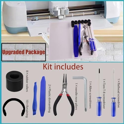 Compatibility Specifically designed for Cricut Maker and Maker 3, our rollers ensure a perfect fit for both beginners and experienced crafters. Please note that this product is not compatible with Cricut Maker 2. 24 Packs Comprehensive Set 8 Rubber Rollers for Cricut Maker 3 10 Retaining Clip Rings 3 Screwdrivers (Allen, Torx-T8, and Flathead) 1 Needle Nose Pliers 2 Plastic Dismantling Tools Revolutionary Removal Tools The Rubber Roller Resolution set comes with two hard plastic removal tools that facilitate fast and seamless replacement of rubber rollers. These tools are a game-changer for working within tight spaces and intricate details. Easy Installation The Rubber Roller Resolution kit includes all the necessary tools along with detailed electronic installation instructions for your convenience. The specialized tools and straightforward design enable quick and efficient installation. High Quality Our Rubber Roller Replacements are made from premium rubber material, surpassing standard rollers in durability. This greatly reduces the need for frequent replacements, allowing you to focus on your creative projects without interruptions.
