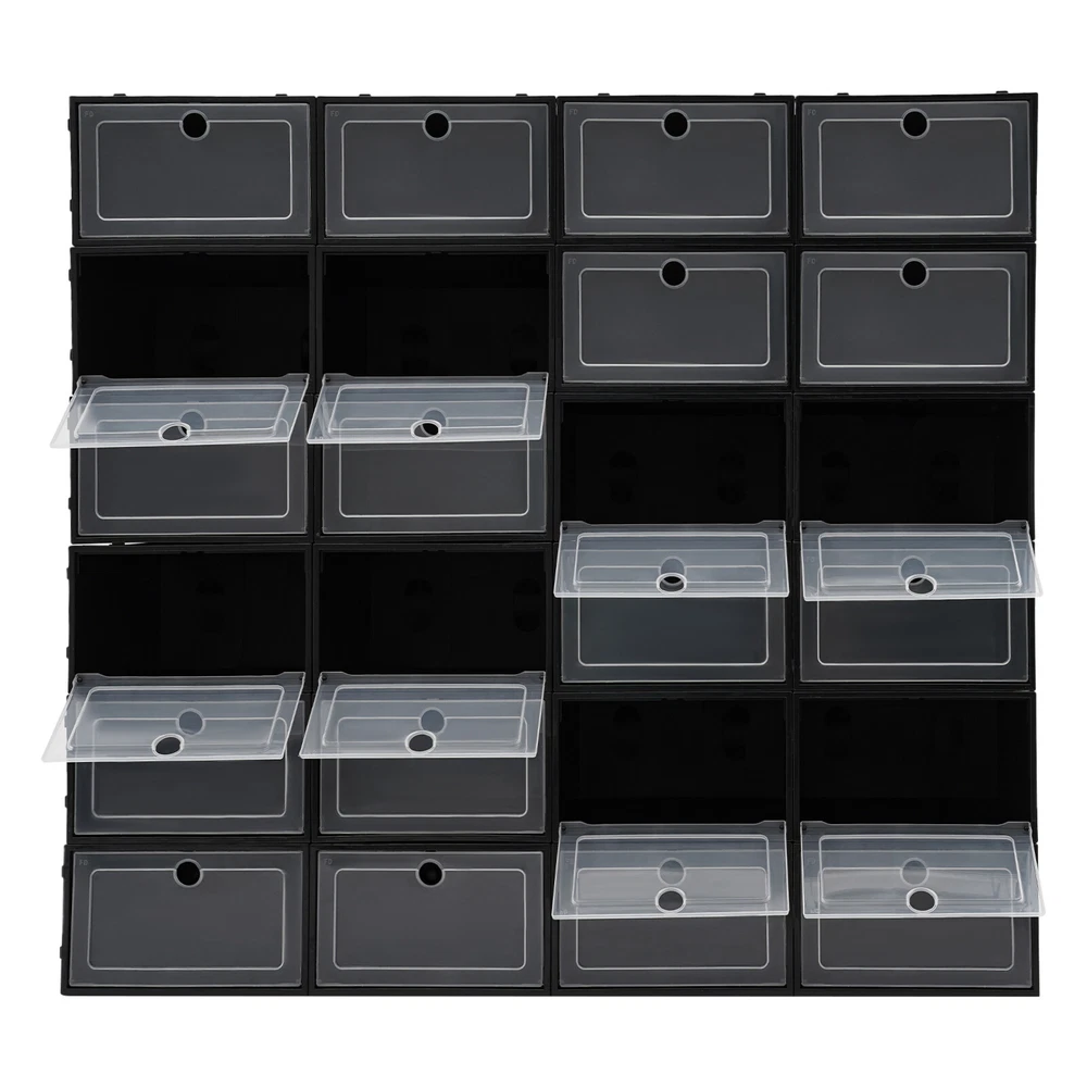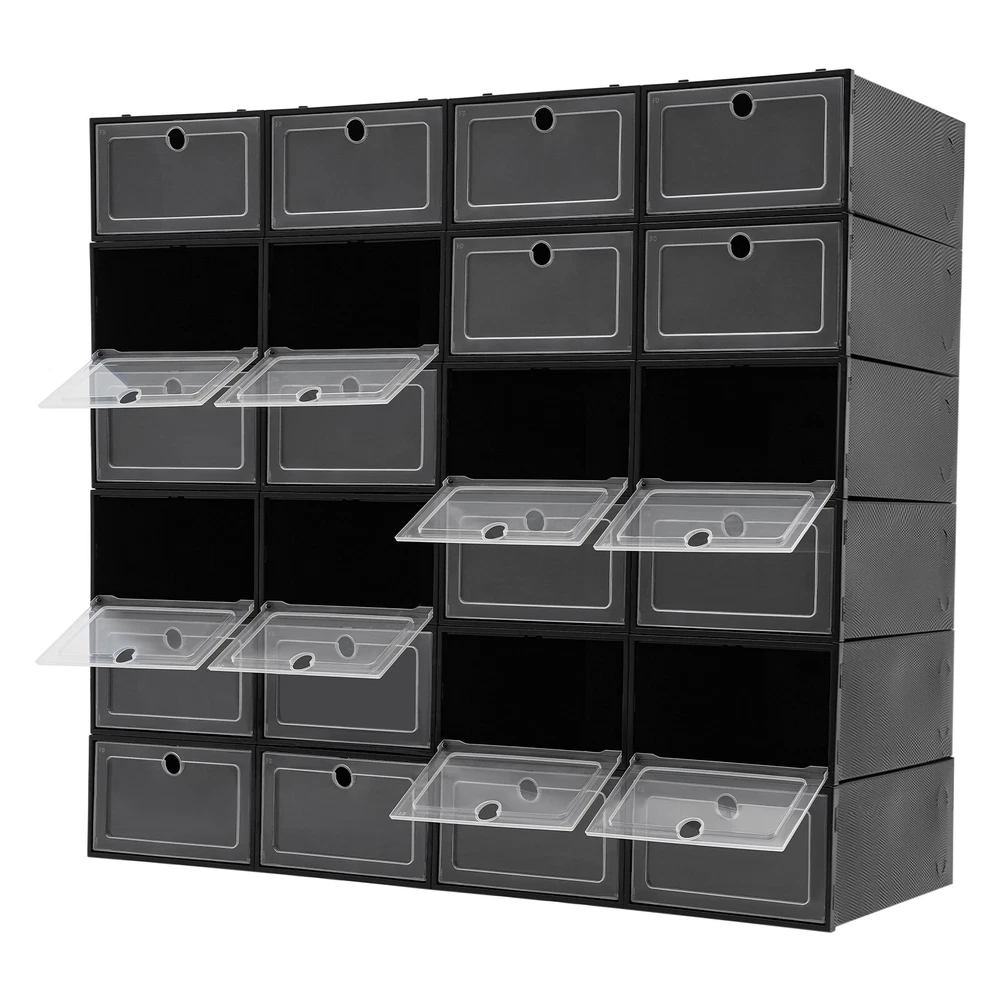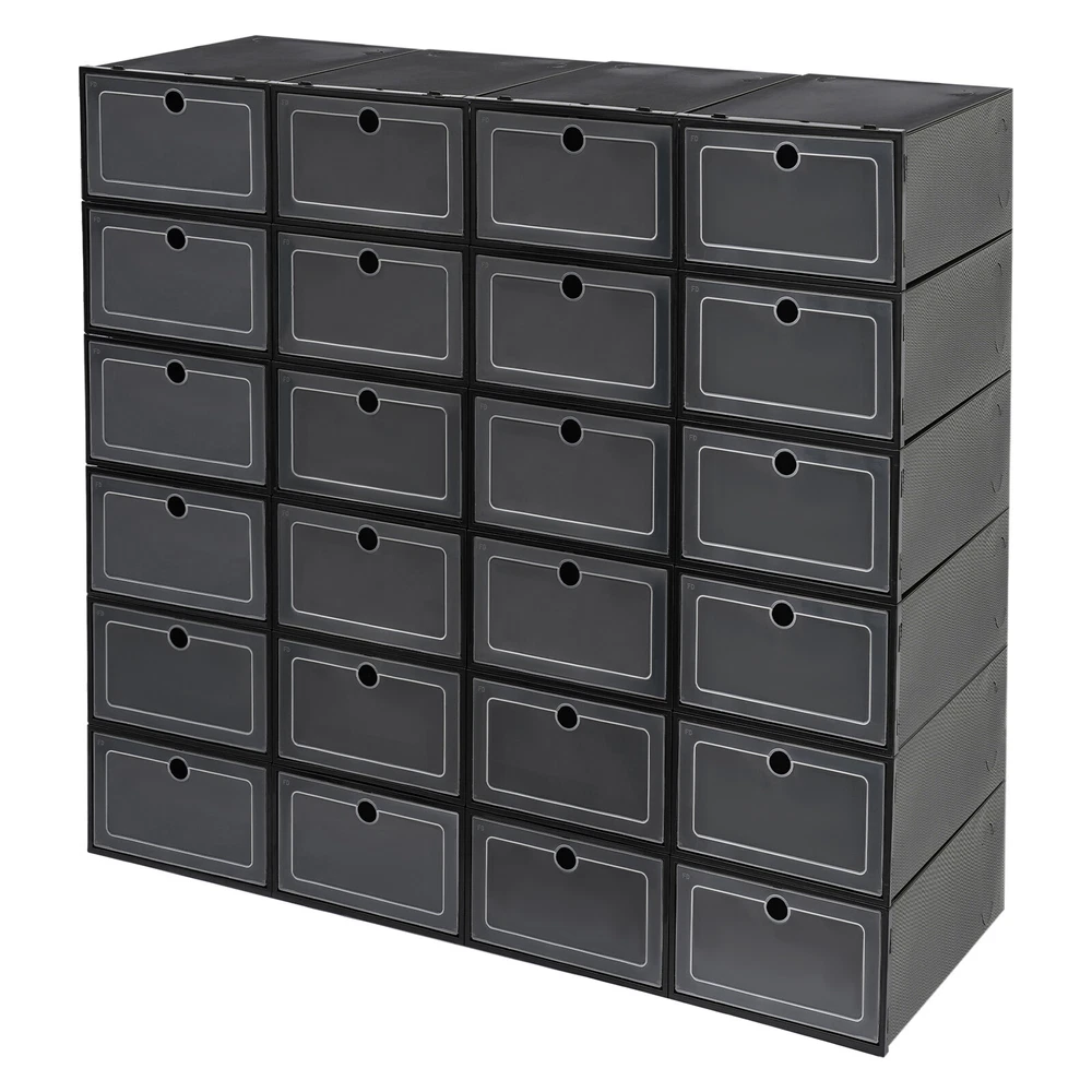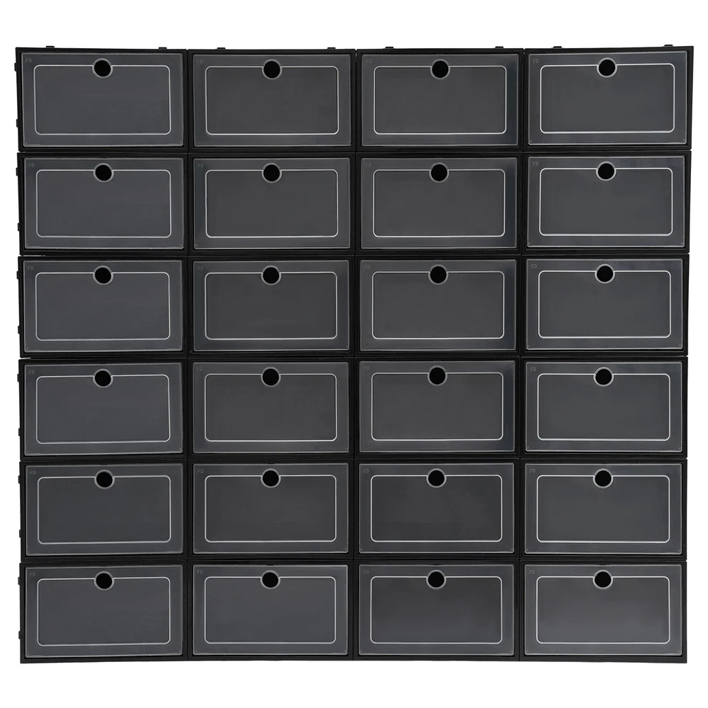 24 Pack Shoe Storage Boxes, Stackable Shoe Boxes, Shoe Storage Organizer NEW Description This stackable 24-piece shoe box set provides a neat shoe storage solution for your daily life. Each comes with a transparent flip lid that can save you time in finding shoes. The snap connection ensures simple installation while improving the stability of stacking and allowing you to combine them according to your living spaces, making shoe storage more convenient and efficient. Key Features Selected Materials: This product is made of high-quality PP and HIPS materials, showing excellent wear resistance , corrosion resistance , and tear resistance , keeping it practical for long-term use. Good Appearance: The mysterious black appearance with smooth lines and a simple shape makes it a wonderful and harmonious decorative piece that is pleasing to your eye. Stackable Design: The products can be freely stacked and matched in combinations, allowing them to be flexibly placed in various types of large and small rooms. 24 Pieces One Set: This set provides sufficient quantities of shoe boxes, meeting your daily shoe storage needs and applying to most types of shoes. Foldable Design: The product can be folded for storage when detached, which greatly saves you storage space when not in use. Easy to Clean: If your shoe box is dirty, you can wipe off the stain with a wet towel or just rinse it with water directly. Ideal Gift: The good appearance and practical function make it an ideal gift for your friends, families, and colleagues. Buy with Confidence: We stand behind all our guests and look forward to assisting you with your purchase. It is our pleasure to answer your confusion and questions. The end of the story between us is not "we sell and you buy". Details Smooth Edges: They can protect your hands from getting scratched during installation and daily use. Clear Flip Lid: It keeps dust from entering so that the items inside will remain clean. The clear design allows you to see the shoes inside at a glance so that you can quickly find the pair of shoes you want to wear. The round hole in the lid allows you to open the shoe box conveniently. Application The products are suitable for use in homes, cloakrooms, shoe stores, and more for storing sneakers, flats, slippers, sandals, casual shoes, and other shoes. Specifications Color: Black Hole Shape: Round Material: PP, HIPS Process: Injection Mold, Extrusion Molding Mount Type: Free Standing Assembly Required: Yes Applicable Shoe's Type: Flat Shoes(Within 44(Chinese Size)), Sports Shoes(Within 37(Chinese Size)) Product Size: 33*23*14cm/12.99*9.06*5.51in Package Size: 47*37*12.5cm/18.5*14.57*4.92in Gross Weight: 4.9kg/10.8lbs Net Weight: 4.5kg/9.92lbs Package Included 24* Shoe Boxes 1* English Manual Notes 1. Please check the size carefully before ordering. Shoes are not included in this package. 2. Please allow the slight color difference caused by the shooting light and 1-3cm error due to manual measurement, and make sure you do not mind before you order. Features ❤Stable performance, Long service life❤ Feature ❤Great value with warranty❤ Item Height 5.51in Item Length 12.99in Item Width 9.06in Type Hanging Shoe Organizer Color Black Hole Shape Round Material PP, HIPS Process Injection Mold, Extrusion Molding Mount Type Free Standing Assembly Required Yes Brand Unbranded
