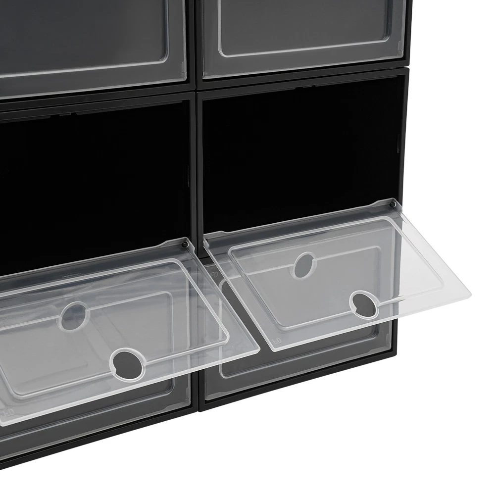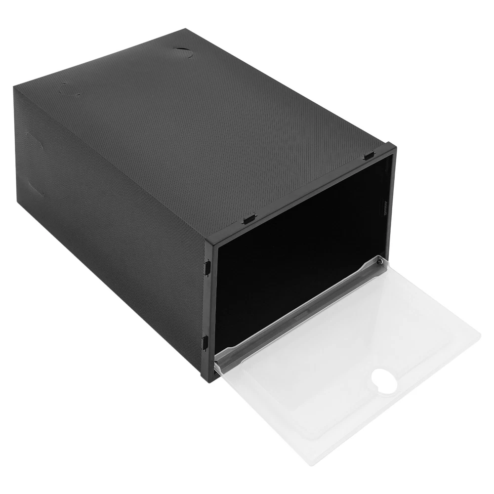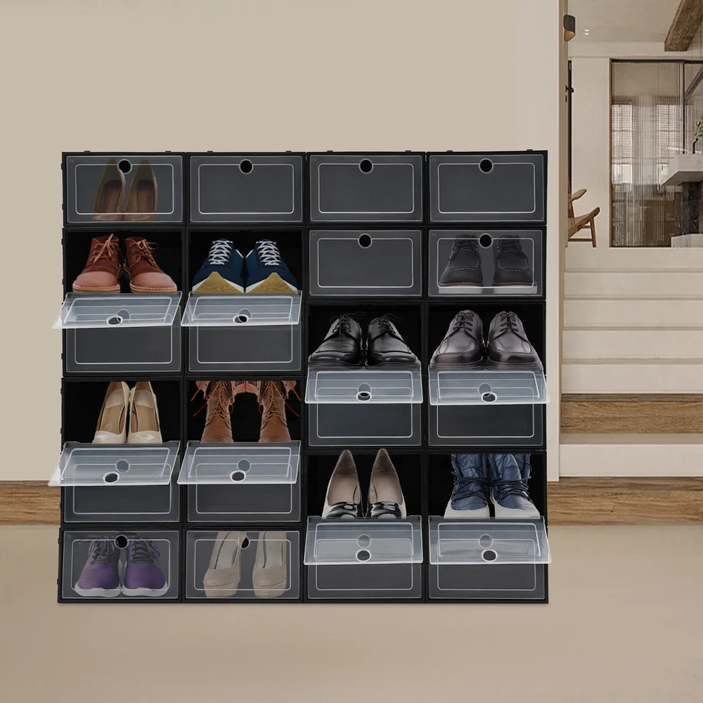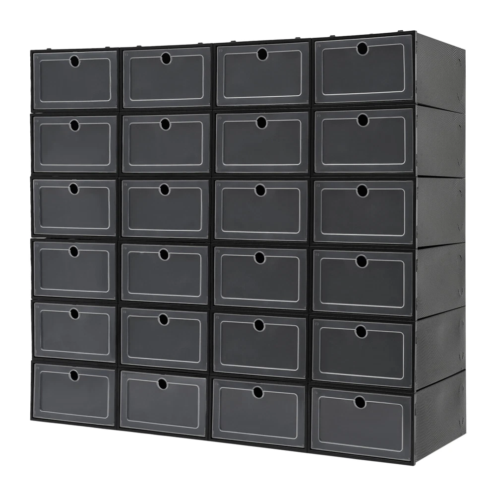 24 Pack Shoe Storage Boxes, Stackable Shoe Boxes, Shoe Storage Organizer NEW Description This stackable 24-piece shoe box set provides a neat shoe storage solution for your daily life. Each comes with a transparent flip lid that can save you time in finding shoes. The snap connection ensures simple installation while improving the stability of stacking and allowing you to combine them according to your living spaces, making shoe storage more convenient and efficient. Key Features Selected Materials: This product is made of high-quality PP and HIPS materials, showing excellent wear resistance , corrosion resistance , and tear resistance , keeping it practical for long-term use. Good Appearance: The mysterious black appearance with smooth lines and a simple shape makes it a wonderful and harmonious decorative piece that is pleasing to your eye. Stackable Design: The products can be freely stacked and matched in combinations, allowing them to be flexibly placed in various types of large and small rooms. 24 Pieces One Set: This set provides sufficient quantities of shoe boxes, meeting your daily shoe storage needs and applying to most types of shoes. Foldable Design: The product can be folded for storage when detached, which greatly saves you storage space when not in use. Easy to Clean: If your shoe box is dirty, you can wipe off the stain with a wet towel or just rinse it with water directly. Ideal Gift: The good appearance and practical function make it an ideal gift for your friends, families, and colleagues. Buy with Confidence: We stand behind all our guests and look forward to assisting you with your purchase. It is our pleasure to answer your confusion and questions. The end of the story between us is not "we sell and you buy". Details Smooth Edges: They can protect your hands from getting scratched during installation and daily use. Clear Flip Lid: It keeps dust from entering so that the items inside will remain clean. The clear design allows you to see the shoes inside at a glance so that you can quickly find the pair of shoes you want to wear. The round hole in the lid allows you to open the shoe box conveniently. Application The products are suitable for use in homes, cloakrooms, shoe stores, and more for storing sneakers, flats, slippers, sandals, casual shoes, and other shoes. Specifications Color: Black Hole Shape: Round Material: PP, HIPS Process: Injection Mold, Extrusion Molding Mount Type: Free Standing Assembly Required: Yes Applicable Shoe's Type: Flat Shoes(Within 44(Chinese Size)), Sports Shoes(Within 37(Chinese Size)) Product Size: 33*23*14cm/12.99*9.06*5.51in Package Size: 47*37*12.5cm/18.5*14.57*4.92in Gross Weight: 4.9kg/10.8lbs Net Weight: 4.5kg/9.92lbs Package Included 24* Shoe Boxes 1* English Manual Notes 1. Please check the size carefully before ordering. Shoes are not included in this package. 2. Please allow the slight color difference caused by the shooting light and 1-3cm error due to manual measurement, and make sure you do not mind before you order. Features ❤Stable performance, Long service life❤ Feature ❤Great value with warranty❤ Item Height 5.51in Item Length 12.99in Item Width 9.06in Type Hanging Shoe Organizer Color Black Hole Shape Round Material PP, HIPS Process Injection Mold, Extrusion Molding Mount Type Free Standing Assembly Required Yes Brand Unbranded