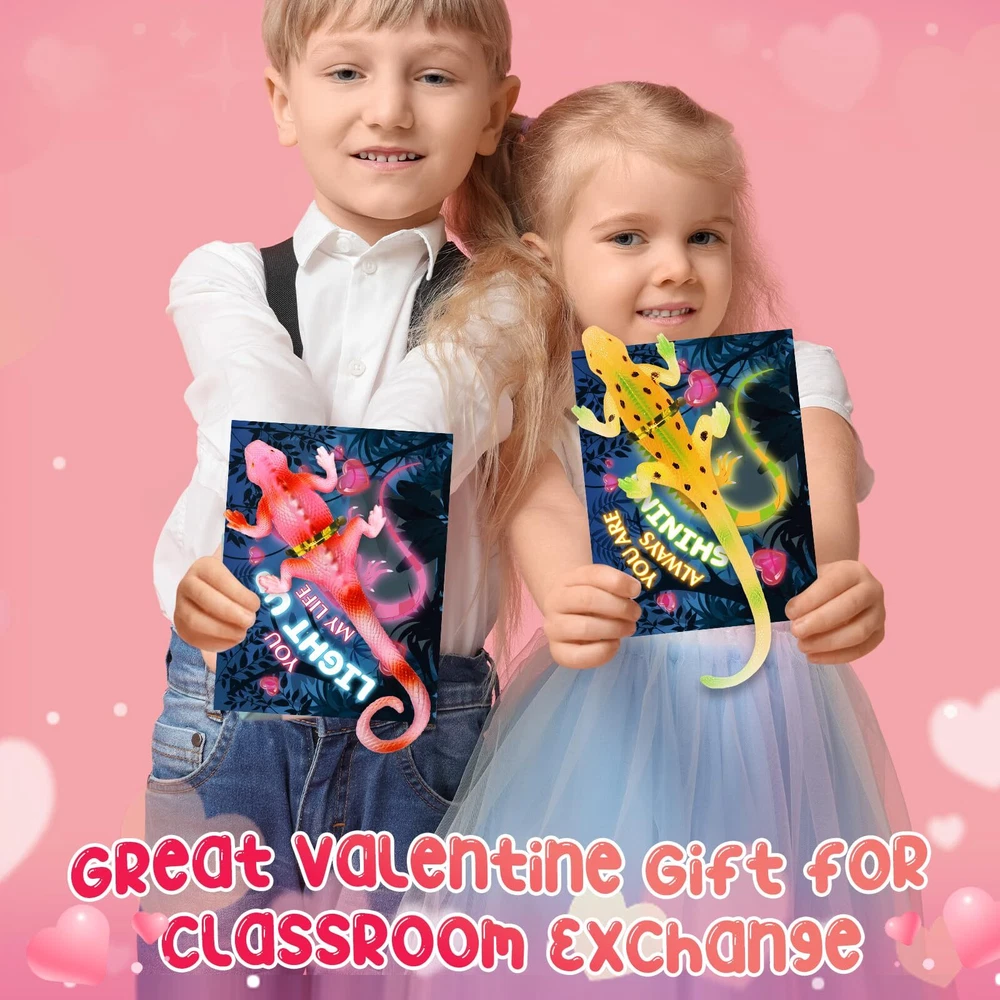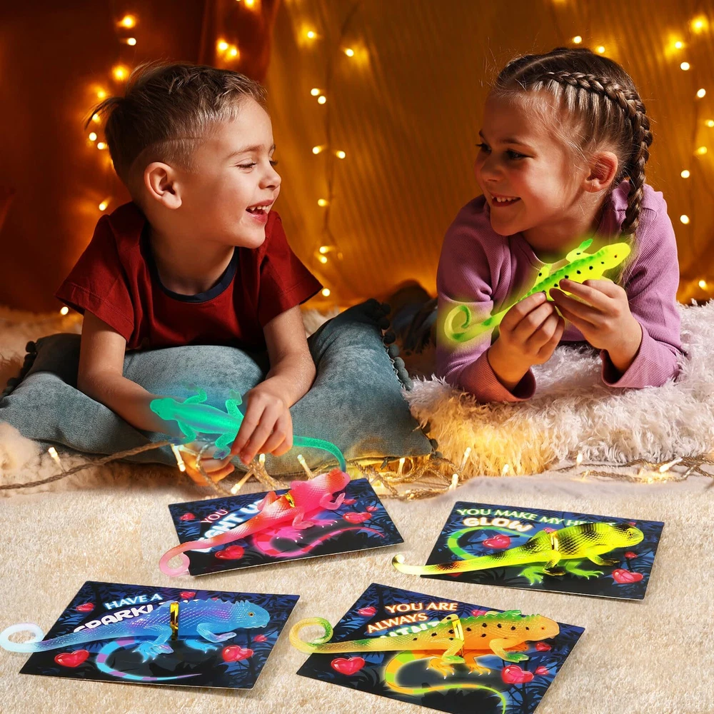 SUPER VALUE PACK! Our Valentine's Day Card Gift Set for kids includes 24 glow in the dark lizards and 24 Valentine's day cards in 4 fun designs. Enough quantity and good combinations can meet the needs in Valentine's parties and school classroom exchange gifts. Kids can share with friends or classmates and have fun together. A great valentine idea for classroom valentine parties. IDEAL VALENTINE'S DAY GIFT. Our Valentine's Cards Party Favors Set provides fun and entertainment for your kids. Valentine's greeting cards with toy lizards are perfect for kids classroom exchanges, preschool or elementary school Valentines parties, Valentine's event, or any Valentine's game prize, love notes, party favor supplies and more! Ideal Valentine's day gift for boys and girls. UNIQUE VALENTINE'S DAY CARDS. Each valentine's day card has a valentine punchline, making the cards more attractive. Valentine's day cards are thick, double-sided printed, and designed in lizard pattern which will be popular among kids. A perfect greeting card to your kids who like something special. MAGICAL TOY LIZARDS. These lizards are made of high quality and special TPR material which could glow in the dark when they have absorb light. Put it under the sun or light for a while and see the magic in dark. The kids will shout and jump for joy. Greet Valentine's toy Bulk for kids. EXCHANGE GIFT AND SHARE LOVE. Giving out the valentines cards is a fun way to encourage kids' social skill development and teach kids to share, love and make friends. A great chance to express love to families, friends and classmates.