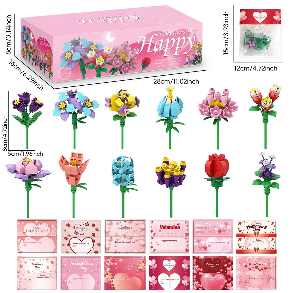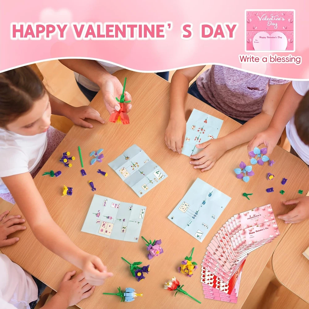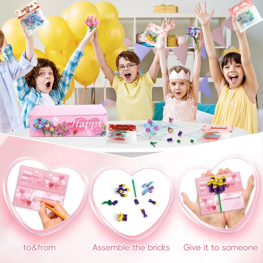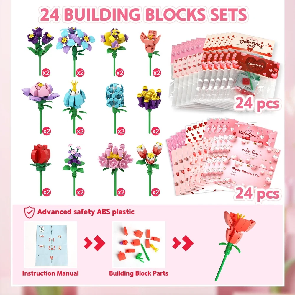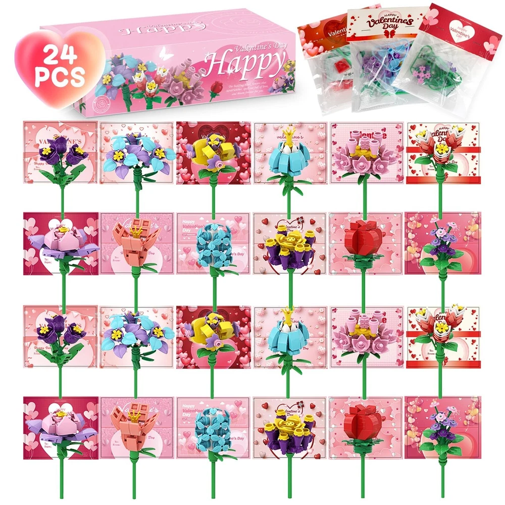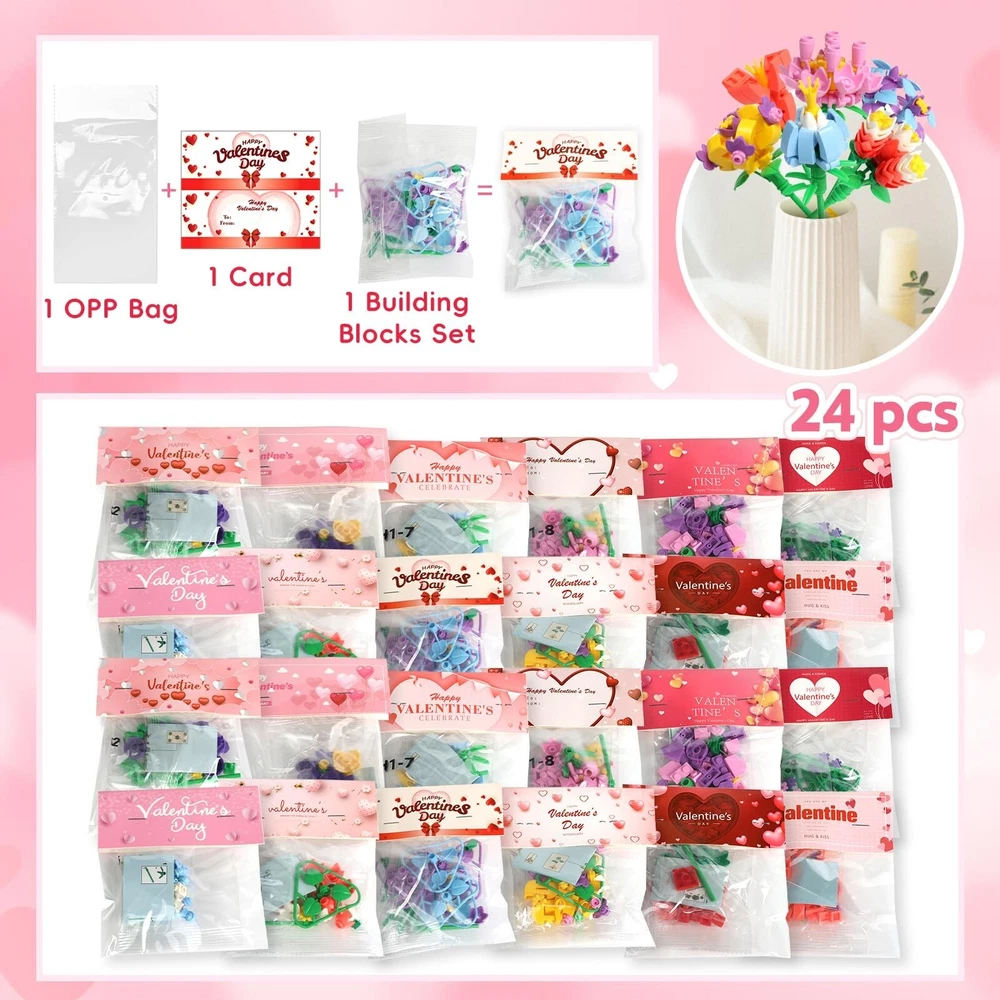 24 Pack Valentine's Flower Building Blocks Party Favors Ideal for Kids Classroom Exchange School Gifts Cards for Boys and Girls Product Details Product Dimensions: 11 x 6 x 3 inches Item Weight: 1.08 pounds Country of Origin: China Manufacturer recommended age: 3 years and up Manufacturer: WANHON 24 Pack Valentine's Flower Building Blocks Party Favors Ideal for Kids Classroom Exchange School Gifts Cards for Boys and Girls Durable and Safe: Our bouquet flower blocks made of original ABS material, 100% Safe, Non-toxic and durable plastic kits which is safe for kids. But contains small parts, be careful to prevent swallow for kids under 3 years old. Unique Design: There are 6 different designs of flower included. This flower bouquet blocks will never wilt and fade, better than real flowers. And each flower comes with a Valentine card, the card header is also a valentines gift card. 6 styles of flower bouquet kits are perfect for kids Valentines classroom exchange gift. .Clear Instructions: Each of 24 bouquet building blocks set have separate package, each un- assembled blocks come with separate instructions to show you how to assemble, kids can easily set up by themselves. Perfect Gifts: This flower building block kids Valentine party favors set brings joy to many occasions, suitable for kid's Valentine's Day, especially for classroom exchange gift, Valentine's party favors, classroom 1.prizes. Exchanging these novel valentine gift cards, share your love and gratitude to classmates, friends and families, the one who receive the gift cards must be surprised and happy.