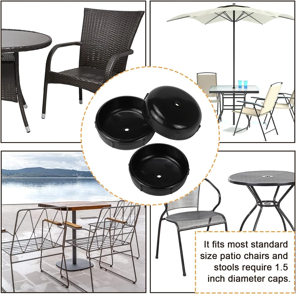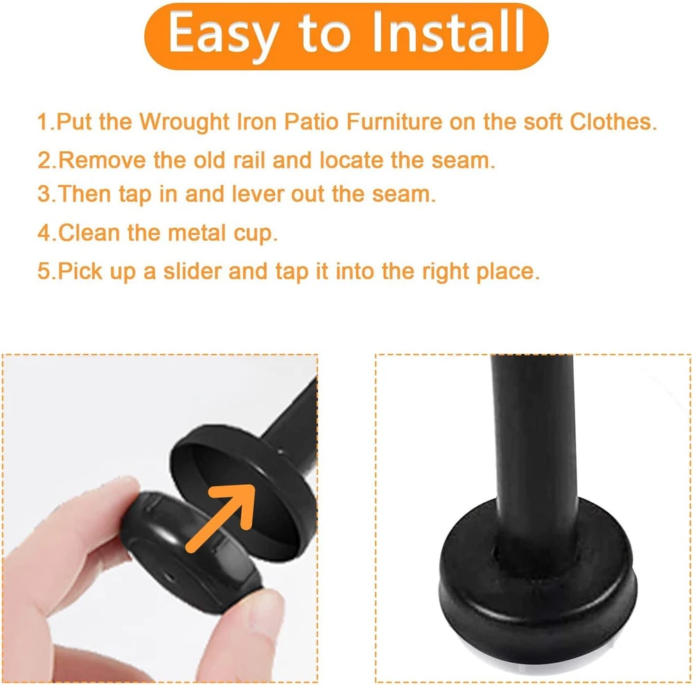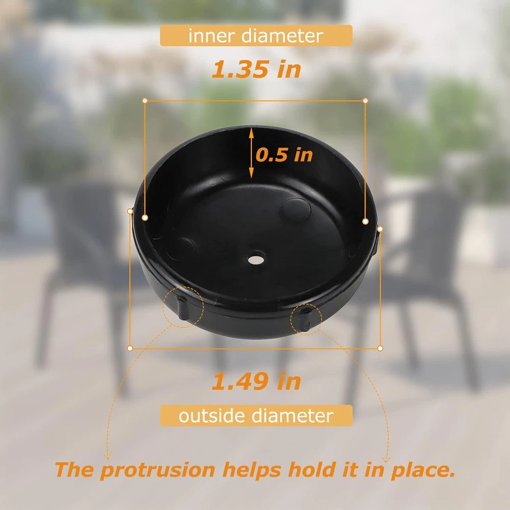 đȘ ăPACKAGE INCLUDESă24 Outdoor patio furniture chair glides cap replacement pieces. Be made of high-quality outdoor-ready plastic. đȘ ăITEM SPECIFICATIONăChair glides cap approx 1-1/2" in diameter, thickness 0.08", and 0.5" height, flexible plastic and clear. đȘ ăTIPSăPatio furniture leg cap size reference 1-1/2" (1.5 inches) is to the size of the âcupâ (inside diameter) on the bottom of the chair or foot area where the glide should be installed. These glides fit very snugly into a cup size. đȘ ăINSTALLATIONă1) Use a flat-head screwdriver to pry out the broken old cap. 2) Clean the position of the glides. 3) Align the new caps with the opening and tap it with rubber mallet. Or you can hold them in place with one hand and using a crescent wrench with he other. Product Description Durable & Wear-resisting Material: Polypropylene Color Name: Black Item Specification: Chair glides cap approx 1-1/2" in diameter, thickness 0.08", and 0.5" height. (Please measure your outdoor wrought iron chair or table leg inside diameter before purchasing) Functions These glides caps will reduce the friction between the patio furniture and ground effectively, protect the surface in from scratching. These chair glides caps help prevent moisture from accumulating, which may cause your wrought iron table or chair to rust. In a word, this glide protector provides a smoother movement of furniture, allowing patio furniture to slide over the surface of your patio, reduce the noise of moving the patio chair and protects the surface of the terrace from damage, avoid scratches, and effectively protect the furniture. 1.5 Inch Patio Furniture Seating Glides/Feet/Caps for Wrought Iron Outdoor Furniture Reasonable Hole Design This patio end caps designed with the holes, which fits the legs of most patio chairs and stools (1.5 inches), and prevents moisture from accumulating, which may cause your wrought iron tables or chairs to rust. Reasons of Your Better Choice Better Durability Clasp Design Convenience & Protectiveness Safety Outdoor Furniture End Glides/ Feet /Caps While you can relax and recuperate in a warm and comfortable living environment after a busy day, which let your hearts have a parked Harbor. Advantages Reduce scratches Lower noise Protect hands Dust proof If you are not satisfied with the furniture glides or have any issues, please free to talk with us anytime, and you will get a satisfactory answer and solution within 24 hours. Friendly Tips Replacement wrought iron chair glides for outdoor patio furniture feet are made to fit into the "cup" area of your outdoor furniture legs with a âinsideâ diameter of 1-1/2". Use a rubber hammer or mallet to install the caps, no adhesives required. Detailed Installations Put the wrought iron patio furniture on the soft clothes. Remove the old rail and locate the seam. Then tap in and lever out the seam. Clean the metal cup. Pick up a slider and tap it into the right place. If you aren't sure how to replace it, check YouTube where are easy to follow instructions on there. Measure your âinsideâ diameter before ordering to make sure you purchase the correct size. Please carefully see product images for correct application.