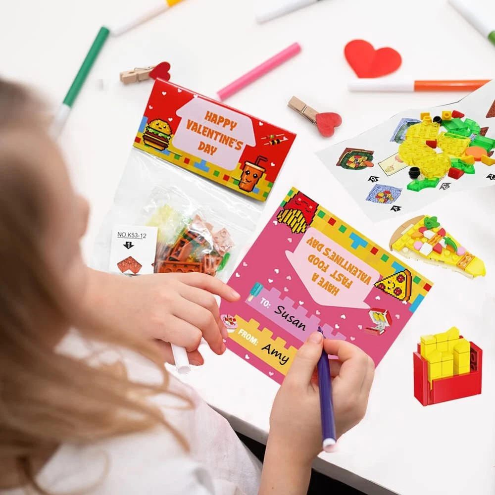 24 Packs Valentines Day Cards with Fast Food Building Blocks, Valentines Food Cars Set for Kids Valentines Day Gifts, Valentines Classroom Exchange, Valentines Party Favors, Valentines Greeting Cards Funny Fast Food Block Set: Our Valentines day party favor set includes 24 packs of building blocks. 12 different kinds of food, Burger, Chicken nuggets, Cola, Hot dog, Pizza, Cake, Kebab, Roast chicken, Fries, Ice stick, Ice cream, Pudding. High Quality: The fast food building blocks are made of high quality environmental ABS plastic material, 100% Safe and Non-toxic. But contains small parts, be careful to prevent swallow for kids under 3 years old. Unique Design: There are 12 different designs of fast food included. And each vehicles comes with a Valentine card, the card header is also a valentines gift card. Combine 12 different food together to build a fast food play car! Unlimited imaginative fun for your little builders. Creative & Fun: The fast food building blocks set for boys and girls is an excellent educational toy. It can also encourage children to widen their imagination and practice their creativity while keeping them away from other electronic gadgets. Perfect Gifts: This food building block kids Valentine party favors set brings joy to many occasions, suitable for kid's Valentine's Day, especially for classroom exchange gift, Valentine's party favors, classroom prizes. Exchanging these novel valentine gift cards, share your love and gratitude to classmates, friends and families, the one who receive the gift cards must be surprised and happy.