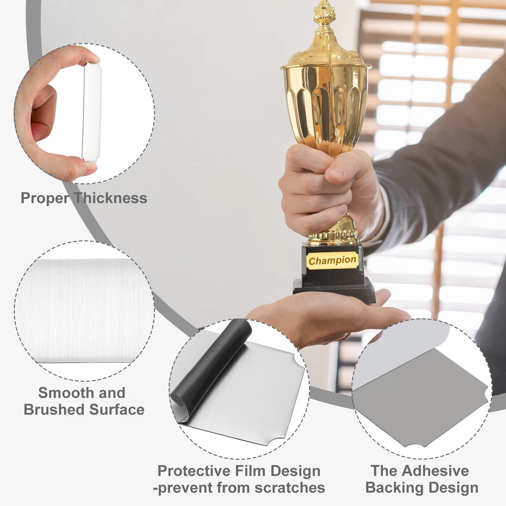 Document Our engraved nameplates are perfect for mounting on plaques, picture frames, sweaters, trophies, bags, display boxes, flag cases, and anything else.SpecificationMaterial: Stainless SteelColor: Silver ToneSize: 15.2 x 6.3 cm/6 x 2.5 Inch(L*W)Thickness: 0.4 mm/0.02 InchPacking List: 24 Pcs x Engraved NameplateAdvantageOur engraved nameplates are made of brushed stainless steel which is durable, stable, not easy to fade, rust, or break, and can be used for a long time. With a smooth surface, it will not scratch your skin.The right thickness makes the plate stronger and allows for deeper engraving. These elegant nameplates have a beautiful luster and a simple design. Suitable for various crafts to add brilliance.The protective film design can effectively prevent scratches. The adhesive backing design allows you to stick this nameplate anywhere without any tools and it can be firmly on the objects.InstructionPlace a metal workbench block underneath the blank stamping tags for better stamping.NOTE:1. There may be light scratches and blemishes due to shipping, but they can be polished.2. Only for laser engraving, not suitable for mechanical engraving.3. Please remove the protective film before use. 24 Pcs 6" x 2.5" Engraved Name Plate Picture Frame Label Art Tag, SiLver Tone Our engraved nameplates are perfect for mounting on plaques, picture frames, sweaters, trophies, bags, display boxes, flag cases, and anything else. Specification Material: Stainless Steel Color: Silver Tone Size: 15.2 x 6.3 cm/6 x 2.5 Inch(L*W) Thickness: 0.4 mm/0.02 Inch Packing List: 24 Pcs x Engraved Nameplate Advantage Our engraved nameplates are made of brushed stainless steel which is durable, stable, not easy to fade, rust, or break, and can be used for a long time. With a smooth surface, it will not scratch your skin. The right thickness makes the plate stronger and allows for deeper engraving. These elegant nameplates have a beautiful luster and a simple design. Suitable for various crafts to add brilliance. The protective film design can effectively prevent scratches. The adhesive backing design allows you to stick this nameplate anywhere without any tools and it can be firmly on the objects. Instruction Place a metal workbench block underneath the blank stamping tags for better stamping. NOTE: 1. There may be light scratches and blemishes due to shipping, but they can be polished. 2. Only for laser engraving, not suitable for mechanical engraving. 3. Please remove the protective film before use. Hot Item Payment 1.We accept eBay payment . 2.Payment must be received within 7 business days of auction closing. Shipping 1.We ship to your eBay or Paypal address. Please make sure your eBay and Paypal address is correct before you pay. 2.Items will be shipped within 1-3 business day when we received payment. 3.Delivery time depends on destination and other factors. Description Policy 24 Pcs 6" x 2.5" Engraved Name Plate Picture Frame Label Art Tag, SiLver Tone Our engraved nameplates are perfect for mounting on plaques, picture frames, sweaters, trophies, bags, display boxes, flag cases, and anything else. Specification Material: Stainless Steel Color: Silver Tone Size: 15.2 x 6.3 cm/6 x 2.5 Inch(L*W) Thickness: 0.4 mm/0.02 Inch Packing List: 24 Pcs x Engraved Nameplate Advantage Our engraved nameplates are made of brushed stainless steel which is durable, stable, not easy to fade, rust, or break, and can be used for a long time. With a smooth surface, it will not scratch your skin. The right thickness makes the plate stronger and allows for deeper engraving. These elegant nameplates have a beautiful luster and a simple design. Suitable for various crafts to add brilliance. The protective film design can effectively prevent scratches. The adhesive backing design allows you to stick this nameplate anywhere without any tools and it can be firmly on the objects. Instruction Place a metal workbench block underneath the blank stamping tags for better stamping. NOTE: 1. There may be light scratches and blemishes due to shipping, but they can be polished. 2. Only for laser engraving, not suitable for mechanical engraving. 3. Please remove the protective film before use. Hot Item Payment 1.We accept eBay payment . 2.Payment must be received within 7 business days of auction closing. Shipping 1.We ship to your eBay or Paypal address. Please make sure your eBay and Paypal address is correct before you pay. 2.Items will be shipped within 1-3 business day when we received payment. 3.Delivery time depends on destination and other factors.