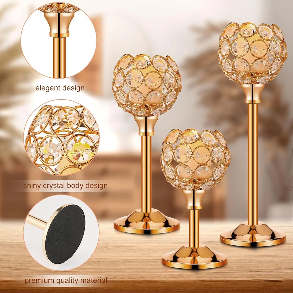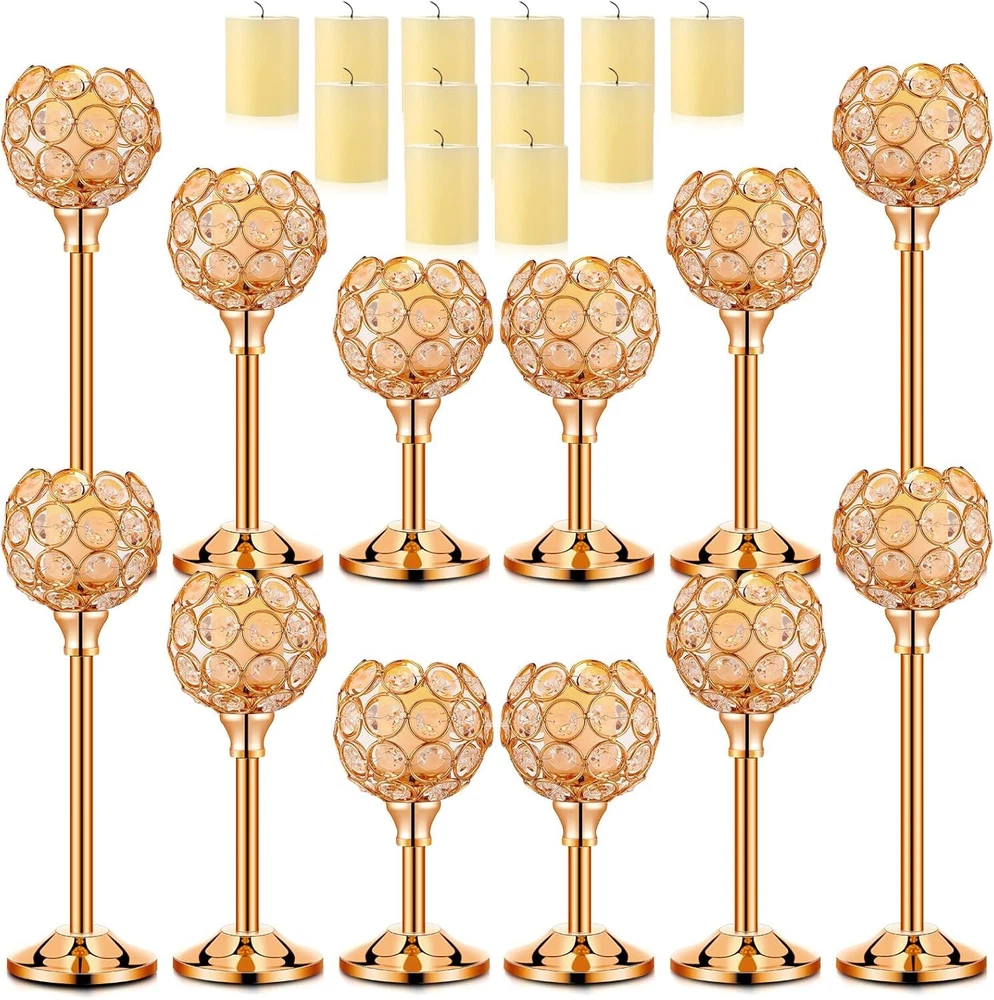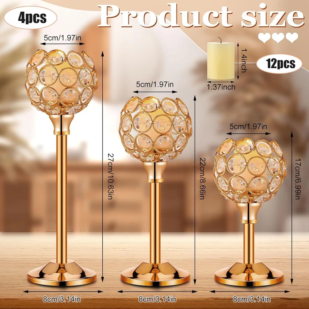 Product Description Features: Elegant and versatile design: Our candle holder decoration features an elegant and versatile design that can be incorporated into many home decoration styles. The mix of crystal beads and metal creates a timeless look that can enhance the ambiance of rooms. Whether you're looking to add a touch of glamour to your dining table or create a romantic atmosphere in your bedroom, this candle holder set is ideal for you. The warm white tea lights candles give off a cozy and inviting glow that will set the mood for many occasions. Durable and long lasting: Crafted with quality materials, our gold table decoration is built to last. The metal bowl shaped candle holder provides stability and durability, ensuring that your candle sticks will remain in ideal condition for years to come. The crystal beads are also of quality, making them resistant to wear and tear. The tea lights candles are easily replaceable, so the set can be applied repeatedly for various occasions. This set is the suitable combination of practical functionality and elegant design, making it an ideal addition to your home decoration. Specifications: Material: crystal bead and metal Color: gold, warm white Size: Candle holders: about 2 inches wide, 6.7/8.7/10.6 inches high tea lights candles: about 1.4 x 1.4 inches/ 3.6 x 3.5 cm Package includes: 12 x Gold crystal candle holders 12 x tea lights candles Notes: Manual measurement, please allow slight errors on size. The color may exist a slight difference due to different screen displays.