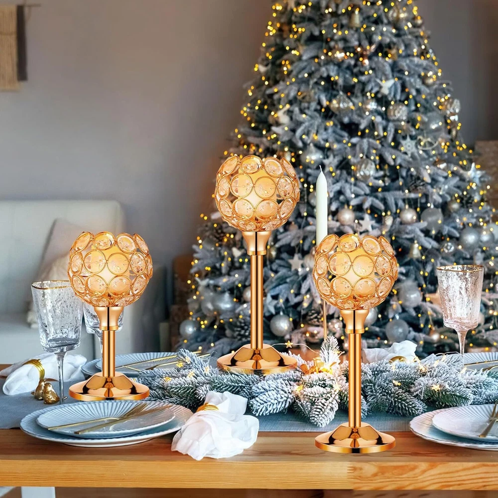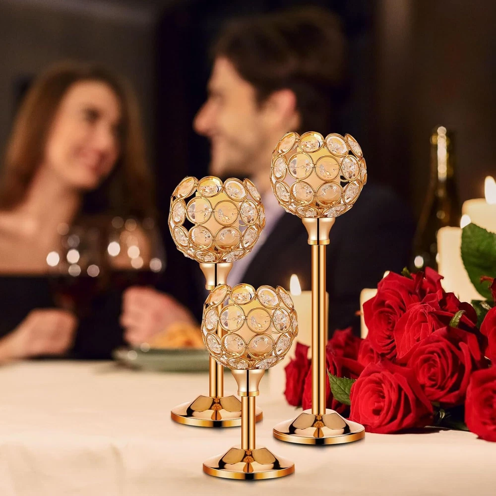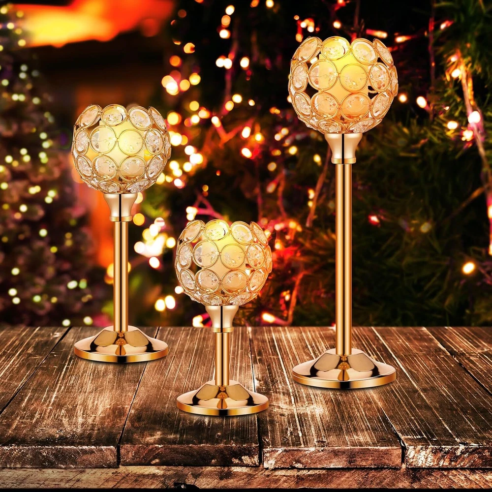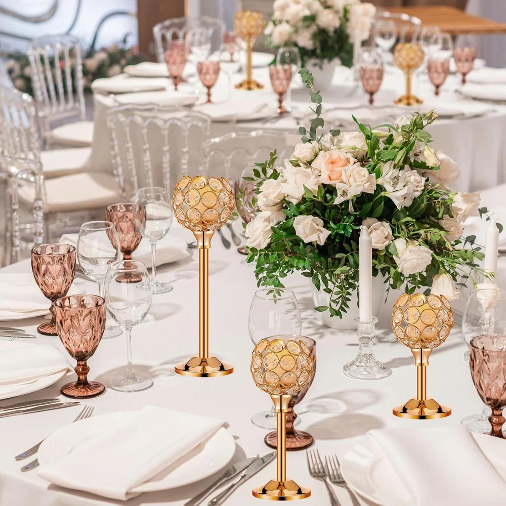 Product Description Features: Elegant and versatile design: Our candle holder decoration features an elegant and versatile design that can be incorporated into many home decoration styles. The mix of crystal beads and metal creates a timeless look that can enhance the ambiance of rooms. Whether you're looking to add a touch of glamour to your dining table or create a romantic atmosphere in your bedroom, this candle holder set is ideal for you. The warm white tea lights candles give off a cozy and inviting glow that will set the mood for many occasions. Durable and long lasting: Crafted with quality materials, our gold table decoration is built to last. The metal bowl shaped candle holder provides stability and durability, ensuring that your candle sticks will remain in ideal condition for years to come. The crystal beads are also of quality, making them resistant to wear and tear. The tea lights candles are easily replaceable, so the set can be applied repeatedly for various occasions. This set is the suitable combination of practical functionality and elegant design, making it an ideal addition to your home decoration. Specifications: Material: crystal bead and metal Color: gold, warm white Size: Candle holders: about 2 inches wide, 6.7/8.7/10.6 inches high tea lights candles: about 1.4 x 1.4 inches/ 3.6 x 3.5 cm Package includes: 12 x Gold crystal candle holders 12 x tea lights candles Notes: Manual measurement, please allow slight errors on size. The color may exist a slight difference due to different screen displays.