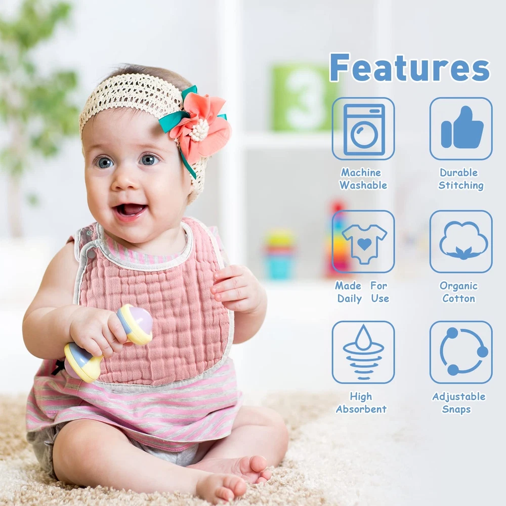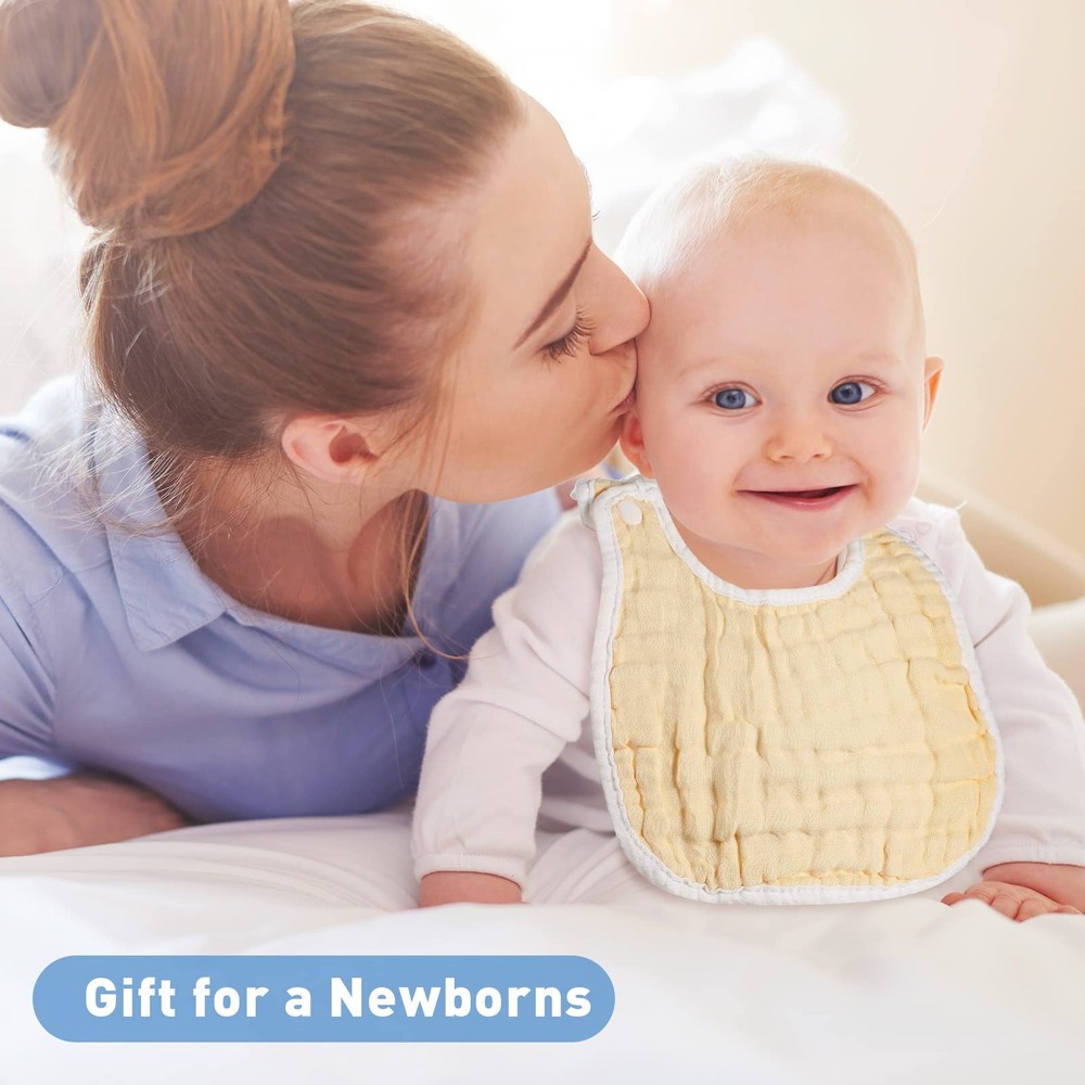 features: these drool bibs can serve as nice photo props for your babies, and they can wear these bibs to take a lot of pictures. the muslin cloth bibs newborn are suitable for feeding, teething, drooling or burping. specifications: material: cotton yarn color: blue, pink, green, gray, yellow and white size: about 11.81 x 7.87 inches, adjustable neck circumference range is about 11-12 inches package includes: 24 x baby bibs notes: manual measurement, please allow slight errors on size. the color may exist a slight difference due to different screen displays. Rich Quantity: you will get 24 pieces of baby drooling bibs with 6 different colors: blue, pink, green, gray, yellow and white, 4 for each color, these pastel colors make them easier to go well with your babies' clothes style; Sufficient quantity to meet your babies' needs for daily use and Soft and Breathable Material: the cotton baby bibs are made of cotton yarn, good absorption, 8 layers, soft and friendly, breathable and comfortable, which are gentle to the baby's skin, will become your favorite Adjustable and Adaptable: muslin baby bibs come with adjustable buttons to meet the needs of different growth stages; Measuring about 11.81 x 7.87 inches, they are suitable for babies aged 0-12 months, the adjustable neck circumference range is about 11-12 inches Easy to Clean: the muslin baby bibs are reusable and washable, and they can be washed by hand or lightly machine washed and hung up to air dry; They may shrink in the dryer; Use of our bibs must be supervised by parents to avoid your child pulling the bibs too hard and causing the button to come off Ideal Gift Choice: these adjustable baby bibs can be regarded as thoughtful gifts for your babies or people who have babies, such as siblings, cousins, neighbors, colleagues and so on; Also, they can be rolled up and placed in a bag or backpack for travelling or shopping