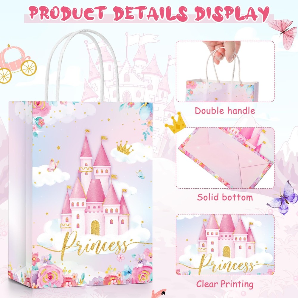 Feature: Leaving an unforgettable memory: The paper bags can nicely create cute and elegant decorations for your birthday party, allowing your guests to get some magical gifts from your fairy princess and prince birthday party and go home with a smile and fond memories. Wide application: Princess and prince party paper bags can be applied as Princess party gift bags, goody bags, treat bags, candy bags for girls and boys birthday party, baby shower party or any other princess or prince theme parties, etc. Specifications: Material: kraft paper Color: pink, blue, gold Size: about 8.3 x 5.9 x 3.15 inches/ 21 x 15 x 8 cm Package Includes: 12 x Princess castle party bags 12 x Prince castle party bags Notes: Please allow slight size errors due to manual measurement. Please allow slight color differences due to different displays. Abundant Quantity: the package comes with 24 pieces of princess and prince castle party favor bags with handles, they can give more choice for girls' party decorations and birthday parties; Enough quantity to meet your daily usage, and you can also share them with your friends to use Sweet Princess themed Party Design: our princess themed party gift bags are designed with 2 patterns of castle in pink and blue color; [Princess] and [Prince] words, classic and romantic, your little kids will have wonderful childhood memories Reliable Material: the princess carriage treat bags are quality kraft paper, which is sturdy and reliable, not easy to fade or break, reusable nautical candy bags can serve you for a long time Suitable Size: each princess crown candy bag measures approximately 8.3 x 5.9 x 3.15 inches/ 21 x 15 x 8 cm, Roomy enough for holding party favors or small gifts like chocolates, candy, gifts, cupcakes, cookies, snacks, and other party favor items Wide Occasions: princess and prince themed party bags are suitable for most birthday parties, gender reveal party, tea parties, bridal showers, weddings, family gatherings and any celebrations, leaving your guests unforgettable memories