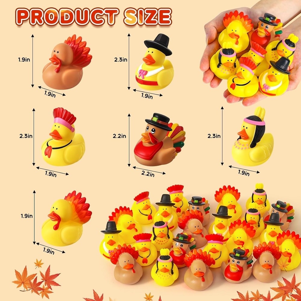 Free eBay listing template designed by dewiso.com 24 Pcs Thanksgiving Rubber Ducks, Thanksgiving Themed Ducks Bulk Turkey Ducks, Thanksgiving Party Favors Supplies for Kids Adults, Fall Duck Bathtub Bathing Toy for Holiday Autumn Table Centerpiece FREE AND FAST SHIPPING! Assortment Thanksgiving Design: Our Thanksgiving ducks feature 6 different styles inspired by Thanksgiving and harvest elements. There are Pilgrim Duck, Native American duck, Turkey duck in the Thanksgiving Rubber Ducks Set. These rubber ducks have an attractive appearance and capture the essence of the holiday season Super Value Thanksgiving Ducks Set: The Thanksgiving rubber ducks kit comes with 24 pieces, providing an ample supply for various purposes. The colors are predominantly yellow, a warm tone that complements the season's vitality. Their elegant and distinct styling will definitely leave an impression. The abundance of these rubber ducks caters to your every need Endless Fun: Our rubber ducks bath toy is exquisite and cute. Add these ducks to your bathtub and watch them float around. Make your kids' bath fun and interesting with these Thanksgiving bath toys. These rubber ducks are great for cruise ships. You can also put these Thanksgiving ducks in your car, in your community, or on a cruise ship to spread happiness Ideal Gifts: These fall rubber ducks are suitable for Thanksgiving celebrations, party favors, bathtub decorations, cake decorations, school prizes, families, relatives, roommate gifts, and Thanksgiving Day exchanges, Birthday Gifts, or even educational tools in classrooms. Our rubber ducks add a charming touch to any occasion. The gift receivers will surely cherish these cute and serviceable toys, adding fun to their Thanksgiving Safe Material: Thanksgiving rubber ducks are made of high-quality rubber and measure about 2 inches. This size is easy to grasp for both adults and children. Our ducks are great baby bath toys. It's reliable and also easy to clean, paired with orange, and yellow colors, hard to fade. Smooth and soft surface allows you to play with them casually Product We offer a 30-Day Return Policy on items which you are not completely satisfied with. You have the option for a full-refund or an exchange of the item. No returns are available on items shipped outside of the US . Shipping We offer Free Shipping to the US and ship within 2 business days of payment, usually sooner. We use UPS express shipping. That's why your products are usually delivered within 3 days . Contact We try our very best to make sure every customer is completely satisfied. If there's a problem , message us! We're happy to help. 24/7 live chat available.