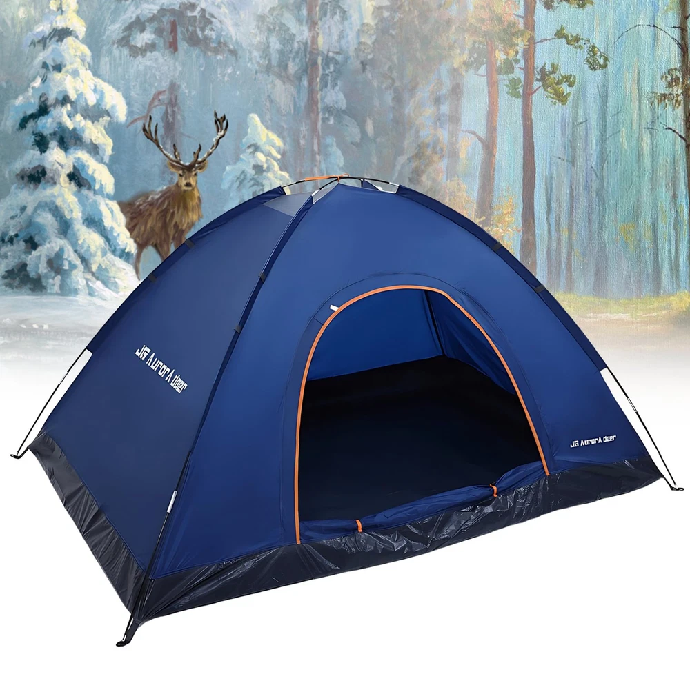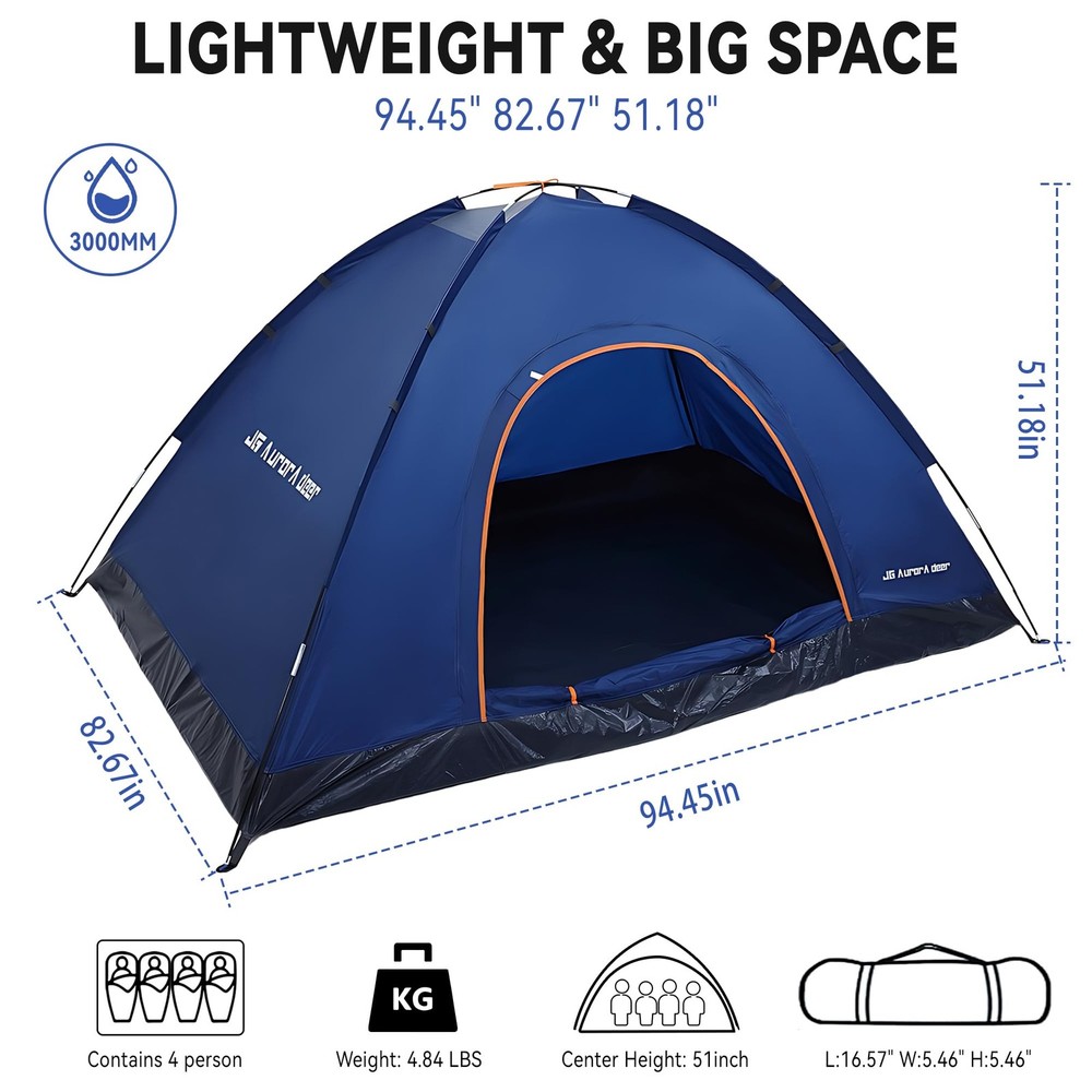 person Tent Waterproof & Windproof Family Tent Camping Tents Backpacking Tent for Portable Camping with Carry Bag LIGHTWEIGHT AND PORTABLE:Portable & Lightweight 3.-4 Person Tent: The backpacking tent is only 4.85 lb, Size:94.481*82.67*51.18 inches, Ideal tent for camping, backpacking, hiking, beaching, fishing, and weekend music festivals Durable and Portable:TentThe Windows and Door equipped with high-quality zippers can be closed tightly, which provides stronger resistance to harsh weather. Sturdy fiberglass poles combined with a wind-stable construction to ensure stability. SMART VENTILATION SYSTEM:The structural design of the camping tent allows air to circulate smoothly, ensuring a cool and pleasant environment inside the tent. QUICK AND EASY SETUP: Featuring an intelligent design, this 4-person tent can be set up in just 5 minutes. Ideal for both first-time campers and seasoned enthusiasts, its quick installation saves time and energy, enhancing your outdoor experience AFTER SALE SERVICE: 【IJG AURORA DEER 】The camping tent offers you a risk - free shopping experience. If you have any questions about the tent, please contact us. We will provide you with a satisfactory solution as soon as possible.