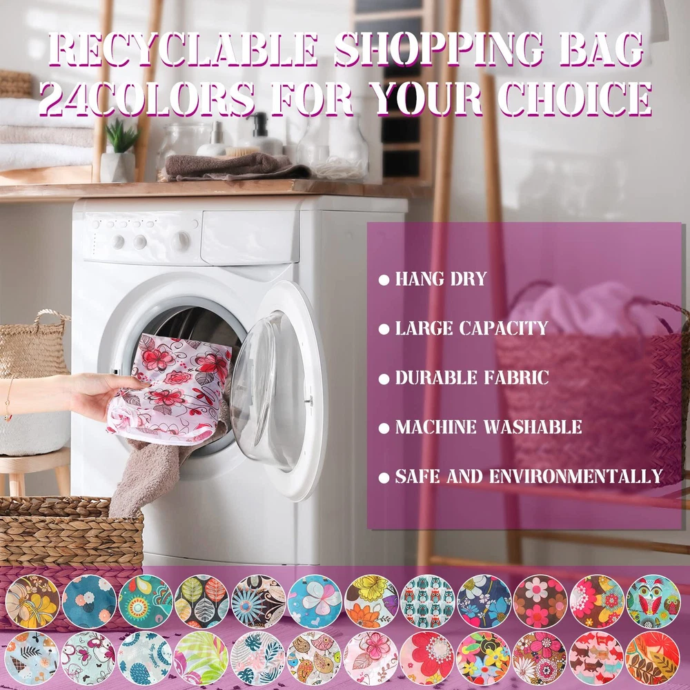 Description Features: Easy for storage: You can use these folded reusable bags to some items like dolls, which can also be applied for shopping, travelling as you like. Present supplies: The reusable shopping tote can be applied as presents for your mom, wife, sister, workmates or friends, they will be satisfied. Specifications: Material: polyester Color: as pictures shown Size: as pictures shown Package includes: 24 x Reusable grocery bags Notes: Manual measurement, please allow slight errors on size. The color may exist a slight difference due to different screen displays. Large Capacity: these reusable grocery bags have an open size of 46 x 40 cm/ 18.11 x 15.7 inches, lightweight and strong, with reinforced seams, exquisite workmanship, lightweight and sturdy, can hold more than 50 pounds of items, such as canned food, milk, fruit, etc.; The wide and long shoulder straps allow you to carry to reduce the burden, a nice helper for daily shopping Foldable Design: these reusable shopping bags can be put back into the tote bag when you don't need them, measure 14 x11/ 5.5 x 4.3 inches when folded; If you do not like to fold, this is a choice for you to easily put into backpacks, wallets, pockets, will not take up too much space Safe Material: these washable shopping bags are made of quality polyester material, clean and safe, machine washable and reusable, quick drying and lightweight,with strong stitching, which can replace plastic bags, convenient to use Beautiful Set: you will get 24 pieces of foldable tote bags in 10 different colors, bright colors to add color to your daily life, bring you a good mood, suitable for both men and women, the abundant quantity is enough for you and your family daily use and , different colors are easy for distinction, practical and beautiful Applicable Occasions: the shopping cart bags for groceries can meet your daily needs, also suitable for various event occasions, such as outdoor activities, birthday parties, picnics, travel, seaside and other outdoor activities, also nice for Christmas, Thanksgiving, Mother's Day and other holiday gifts for your friends and family, a practical gift