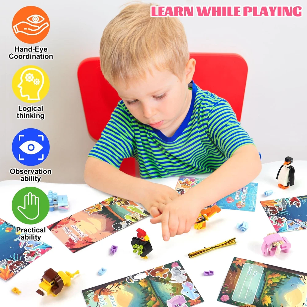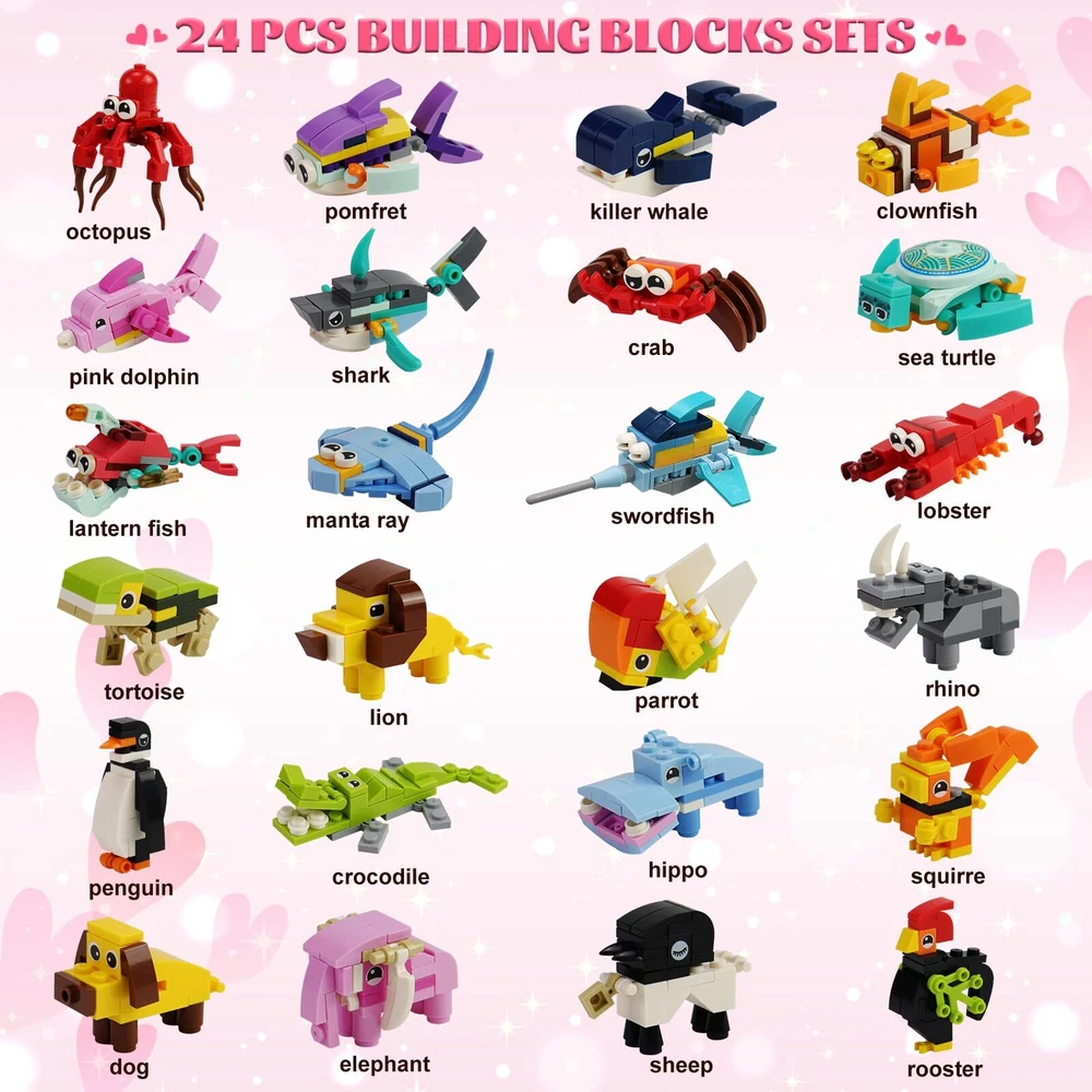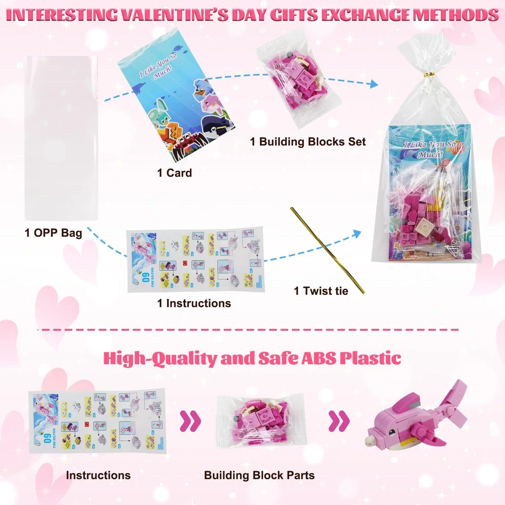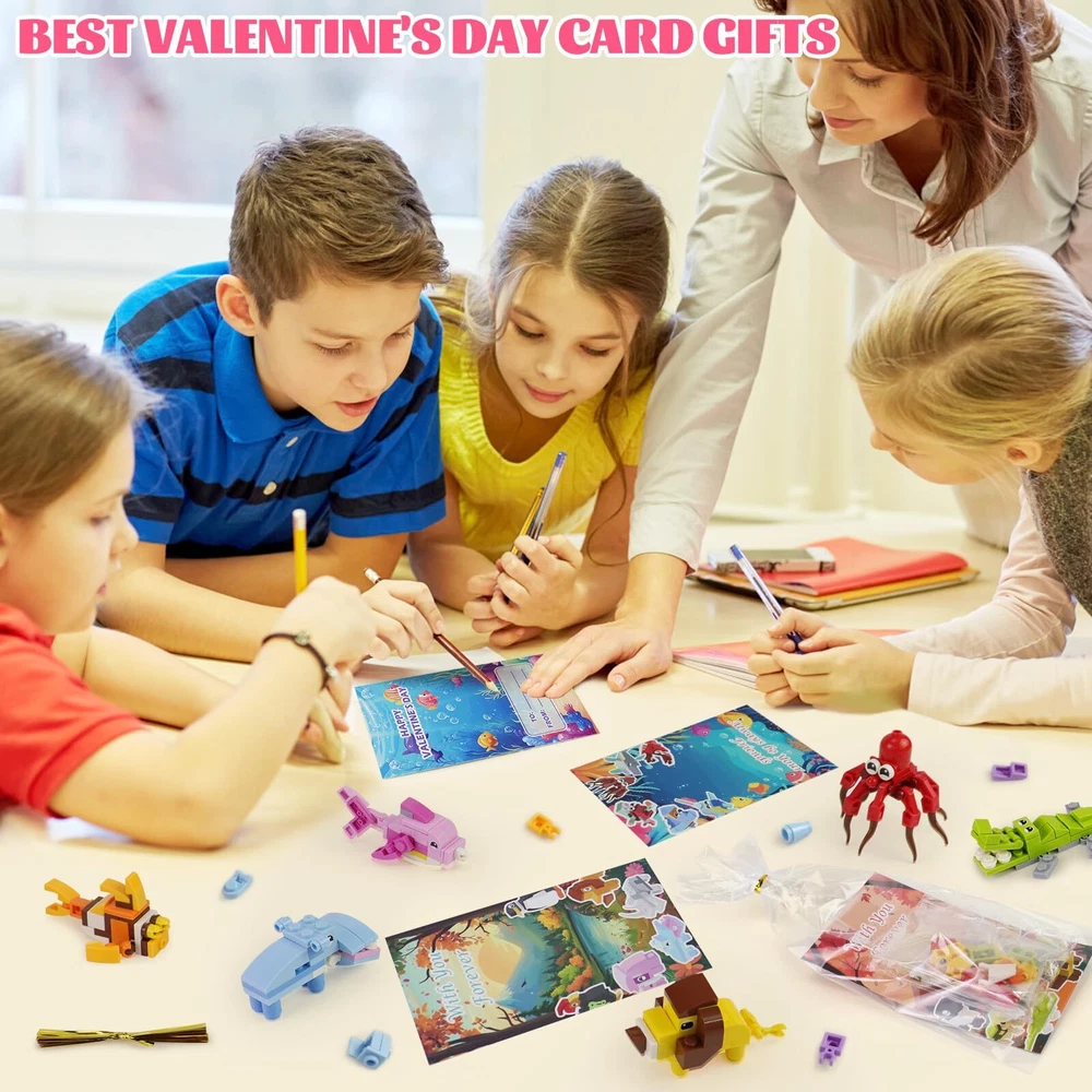 Value Valentine's Day Gifts for Kids Set: Our Valentine's Day cards set includes 24 packs of un-assembled building blocks with 12 animals & 12 sea creatures, 24 cute Valentine's Day cards, 24 clear OPP bags & 48 * twist ties (Two sizes, each with 24 pieces). Abundant in quantity and variety of styles, your kids can learn about different animals by setting up by themself. Safe & Reliable: The sea animal & dinosaur building blocks are made of high-quality environmental ABS plastic material, non-toxic and durable, with rounded edges & corners, and no burrs, which won't hurt children's hands. But contain small parts, be careful to prevent swallowing for kids under 3 years old. Interesting Gift Exchange Methods: kids need to write [To] [From] who & blessing on the card, pick 1 building blocks pack and 1 write-completed card together in the OPP bag, tie the OPP bag with a twist tie. Finally, give Valentine's Day gifts to classmates, or the card has pre-punched holes that can be threaded through the twist tie, tie the completed building blocks together on the card and give them to a friend. Puzzle Early Education Toys: The Mini Building blocks exercise kids’ thinking ability during the building process, which promoting the development of fine hand movements, build their color shape cognition, widen their creativity and imagination,develop their patience and hands-on ability, lots of fun. Kids can also complete the construction process with classmates, share the results with each other and enhance friendship. Valentines Day Gifts for Kids: These Valentines gift card packs are perfect for boys and girls, Valentine's Day, class events, gift exchanges, school classroom prizes, love notes, and any occasions. They will amaze all the children at the Valentine’s Day party and bring more fun to boys and girls.