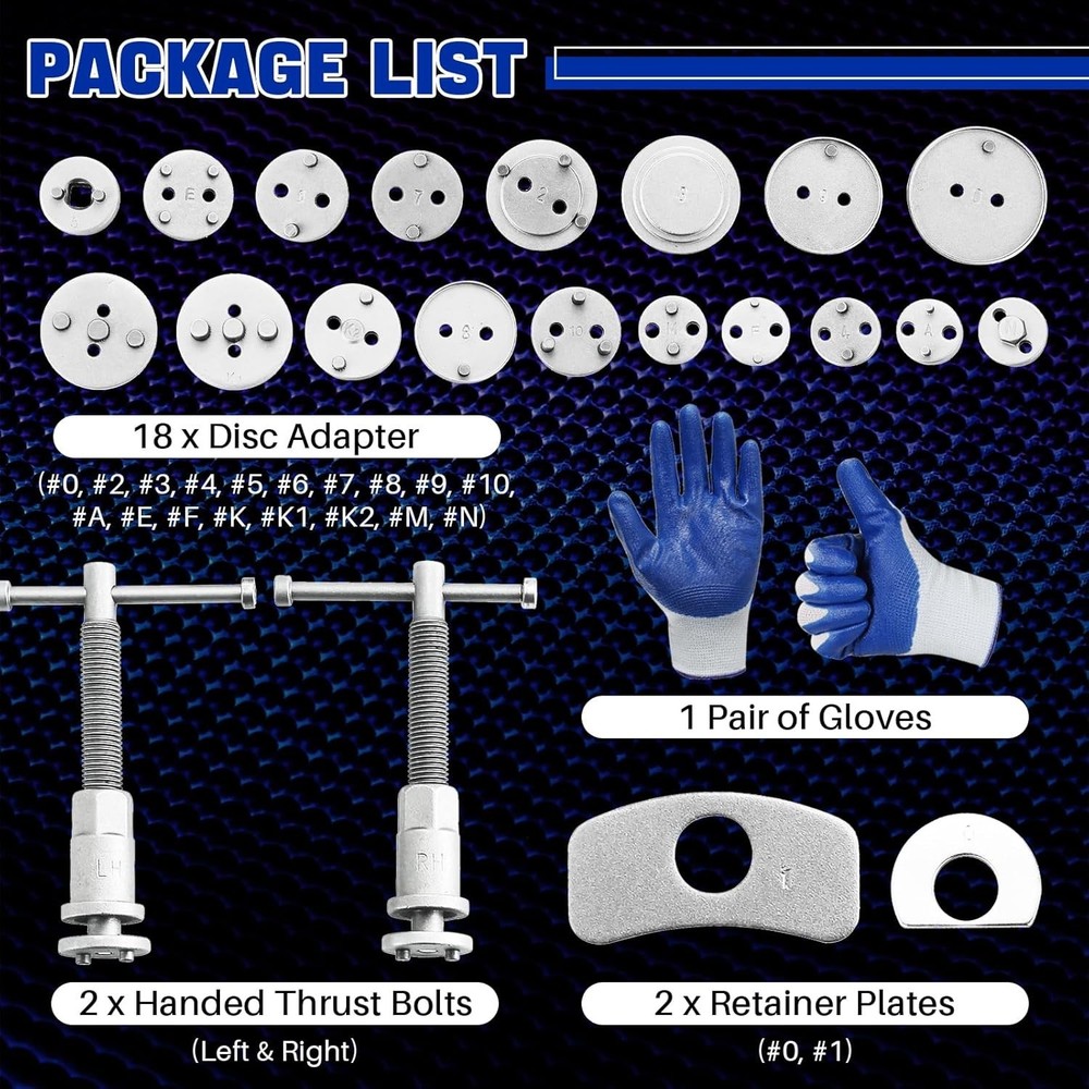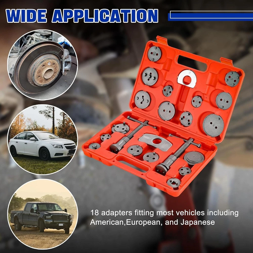 Kit 24 Piezas para Frenos - Compresor de Pistones y Herramientas Profesionales" 🚗 Descripción: "¿Necesitas hacer mantenimiento a tus frenos? Este kit profesional de 24 piezas incluye todo lo necesario para comprimir pistones de caliper y cambiar pastillas: ✔ Contenido premium 18 adaptadores universales 2 placas retenedoras magnéticas Tornillos de empuje (izq/der) Guantes y maletín organizador ✔ Beneficios clave ✅ Acero al carbono 45# antióxido ✅ Diseño magnético para mayor seguridad ✅ Compatible con autos europeos, asiáticos y americanos ✅ Incluye manual de uso ilustrado ⚠ Importante: Ideal para mecánicos y talleres. ¡Facilita el mantenimiento de frenos!" ⚙️ Puntos Clave (Bullet Points): 🔹 Material profesional - Acero endurecido para uso intensivo 🔹 Seguridad mejorada - Imanes evitan desprendimientos 🔹 Uso versátil - Para discos de diferentes marcas y modelos 🔹 Organización - Maletín resistente para guardado 🔎 Palabras Clave para Búsqueda: "kit compresor pistones frenos," "herramientas para calipers," "juego 24 piezas frenos," "adaptadores universales," "mantenimiento discos freno"