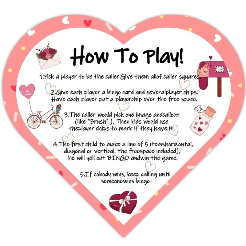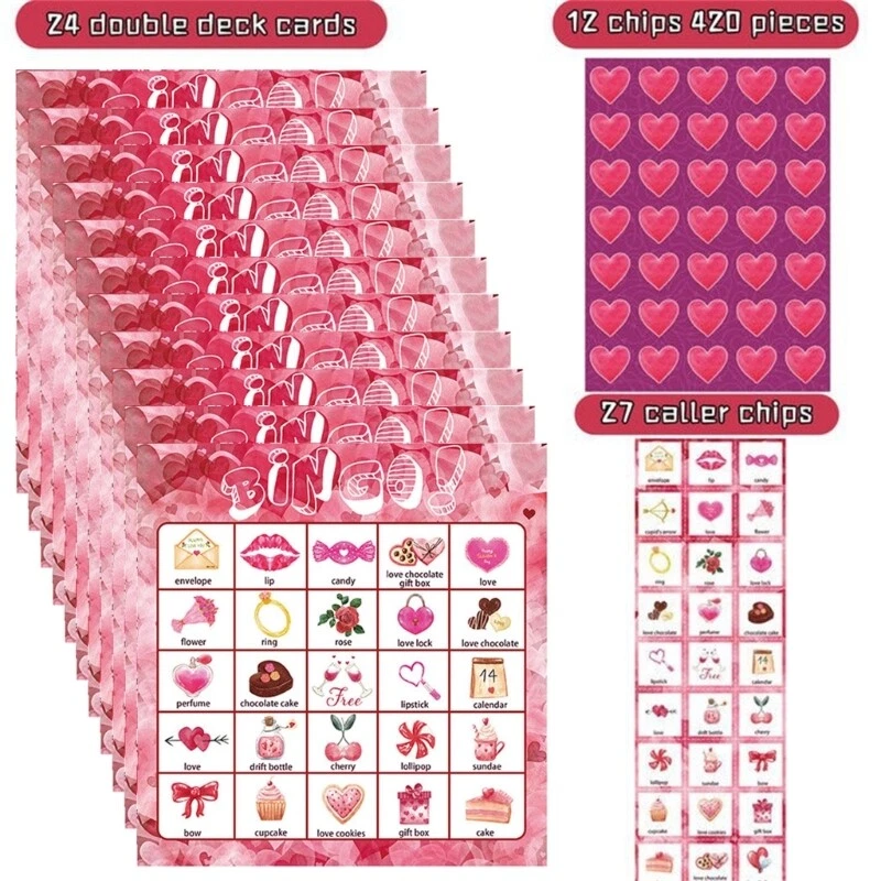 Features: Valentine bingo card party game includes 24 bingo player boards with 12sheet stickers, and 25 caller chips die cut bingo markers with through window. Reusable,quality material durable. easy to use.create hours of fun. Perfect for valentine children entertainment,excitement builds,valentines presents,valentine goodies and toy,party supplies,novelty gift toy,goodies bag fillers,valentines treats for kids,school classroom games, valentine party card games,classroom game,and family home activity. Wonderful gift,sweet warm gift for friend family and yourself. Safe to kids. Specifications: Material;Paper Package Includes: 1Set Valentines Day Bingo Game Cards note: Please allow 1-2cm errors due to manual measurement. Due to the differences betweeen different monitors,the picture may not reflect the actual color of the item.