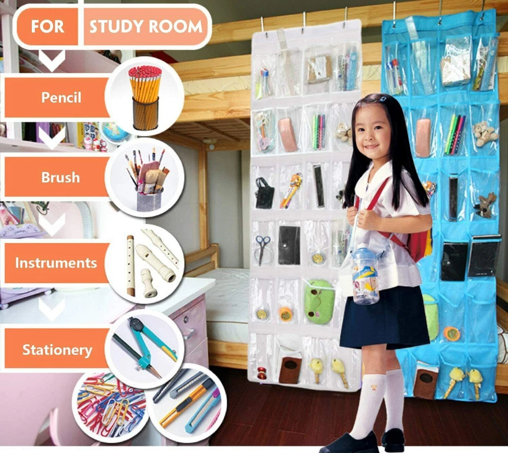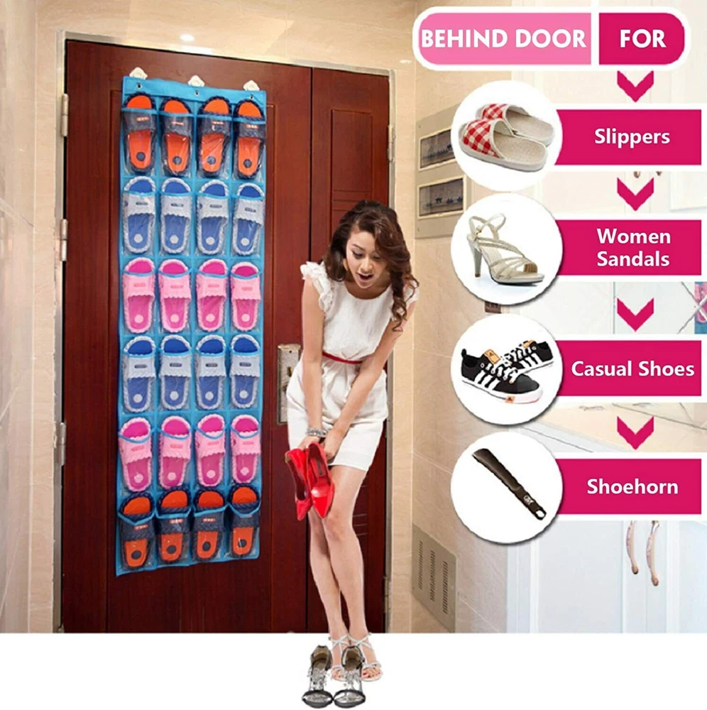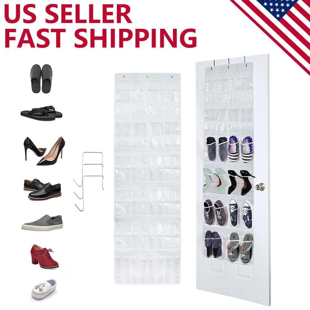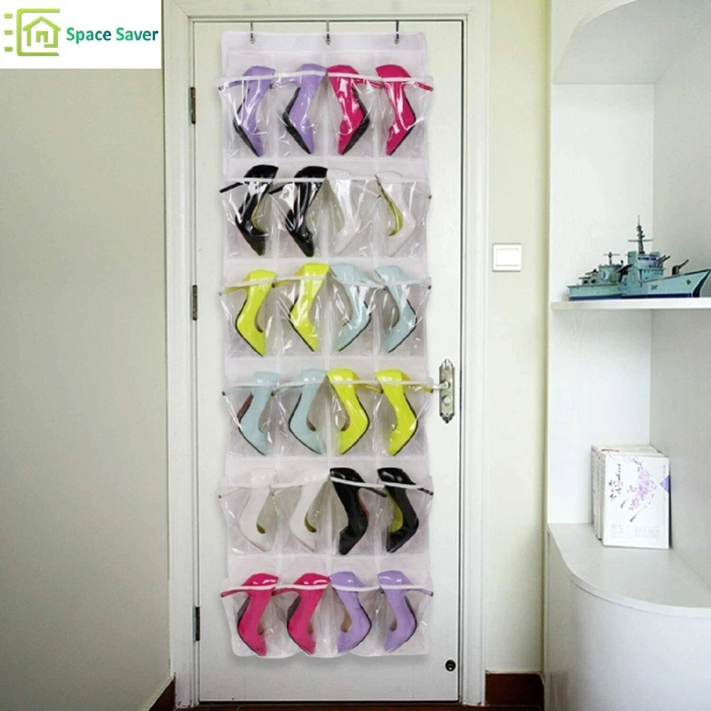 ๐Ÿ‘  ๐’๐ฉ๐š๐œ๐ž ๐’๐š๐ฏ๐ž๐ซ: You can toss out your smelly and space-holding shoe rack now and get a new crystal clear shoe organizer behind the door. Our foldable organizer is perfect for dorm room or small apartments, it will hold up to 12 pairs of shoes with 24 pockets , or any other small personal items as well. Easy hanging on and moving out, simply take the organizer off and fold into a smaller piece for easy storage. ๐Ÿ”‘ ๐Œ๐ฎ๐ฅ๐ญ๐ข๐ฉ๐ฎ๐ซ๐ฉ๐จ๐ฌ๐ž ๐Ž๐ซ๐ ๐š๐ง๐ข๐ณ๐ž๐ซ : Our organizer is not just for shoes! Hang them in your closet for cloths like socks, belts, ties; Hang it on the door and put keys, medicine, and foldable umbrellas in every single pocket; Store favorite snacks for yourself and kids, and then the door must be very attractive. ๐Ÿ‘ž ๐Œ๐š๐ฑ๐ข๐ฆ๐ฎ๐ง ๐๐ซ๐จ๐ญ๐ž๐œ๐ญ๐ข๐จ๐ง: Our door organizer is made with double stitching technique for every pocket, thick and durable, it will protect your expensive designer shoes, or high heels from accidental scratching, bump, or fall. Each organizer are equip with bronze grommets and non scratch hook to hold firmly on your door, without damaging the surface. ๐Ÿญ ๐„๐š๐ฌ๐ฒ ๐ญ๐จ ๐”๐ฌ๐ž: No assembly required. Simply unpack and slip in the metal hooks through the bronze grommets, and slide it over the door. ๐Ÿ”Ž ๐‚๐ซ๐ฒ๐ฌ๐ญ๐š๐ฅ ๐‚๐ฅ๐ž๐š๐ซ: Our crystal clear pockets allow you to find your matching shoes with ease, so you can start your busy day with a breeze. Dimensions: 64"H x 18.5" W. Pocket: 8"H x 4.3"W Over The Door Shoe Organizer Our over the door hanging 24 pocket organizer is the best way to keep your things organized, visible so as to take up a lot of space and make your room stay neat and tidy. Perfect fit on most closet doors so you can hide your personal items with ease. Large clear pockets with white background make it easy to see the contents easily. Clear Pocket Storage Organizer For Kitchen, Bathroom & Bedroom Store makeup, hair and bath products, medicine and first-aid items in the bathroom. Organize your spices, snacks, coffee and sauces in your kitchen pantry. Keep your office clean and orderly with all your folders, pens, pencils, paper, and art supplies off your desk. Great in the bedroom for storing shoes, toys, and accessories. Suitable for a Variety of Occasions: Behind Door Store your: slippers sandals casual shoes shoehorn Bathroom Hold your: shower gel facial cleanser cleaning supplies shower cap Study Room Place your: pencils paintbrush musical instruments stationery Our Advantages: Crystal Clear Easy to find what you need. Convenient to cleaning. Heavy Duty Made of sturdy metal and can be hanged on any standard door rod. The maximum capacity of this organizer is about 60 pounds. Large Capacity Each grid can hold a 1.25L bottle of Sprites.