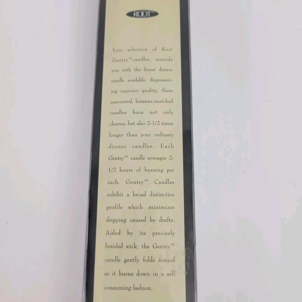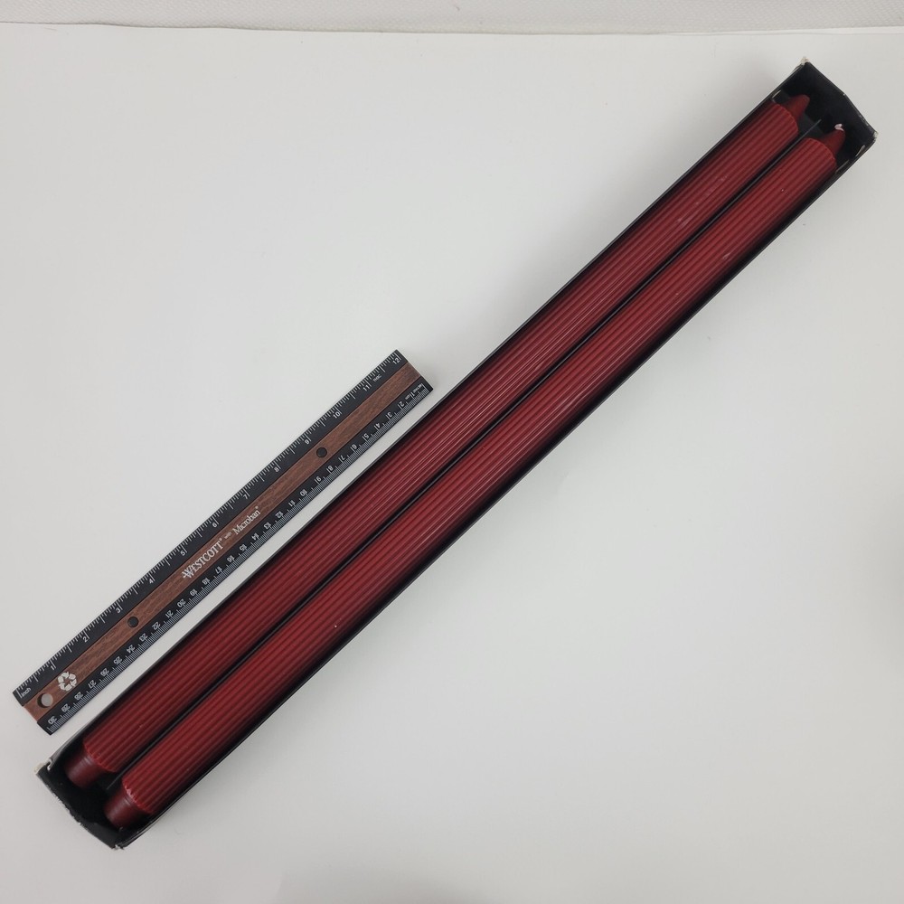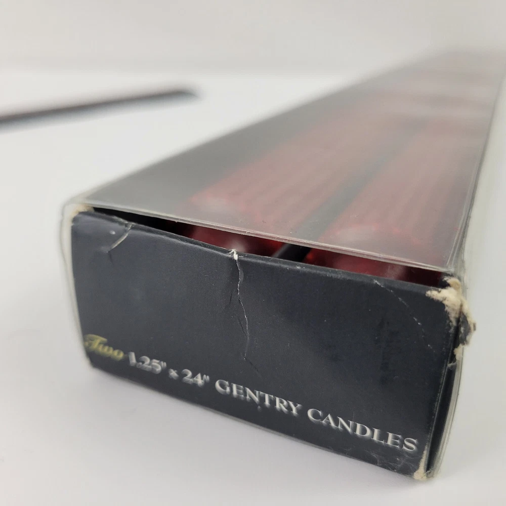 This pair of vintage candles is new in the original box. The box itself has a fair amount of handling wear, and there are a few minor dents to the ribs. Please see pictures for close ups of those spots. Each candle measures 24" x 1.25". Per the package, the burn time averages to 2.5 hours per inch. Note that at the time of listing, I have another pair of this size candles that are ivory. If you do want to purchase both, please let me know before paying so I can combine shipping for you.