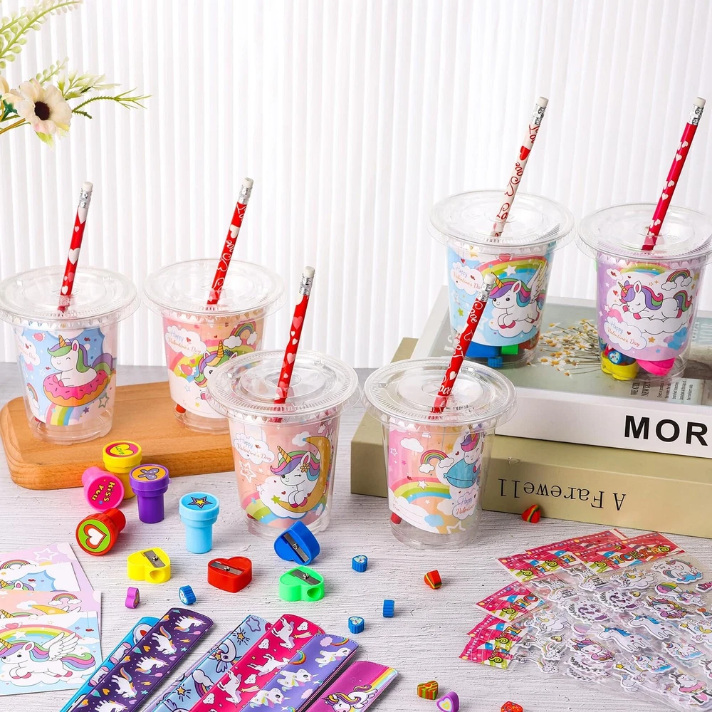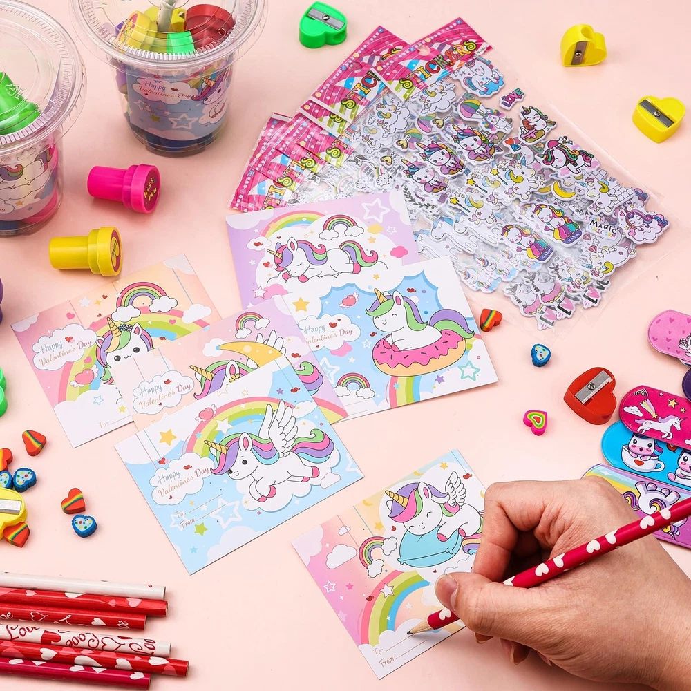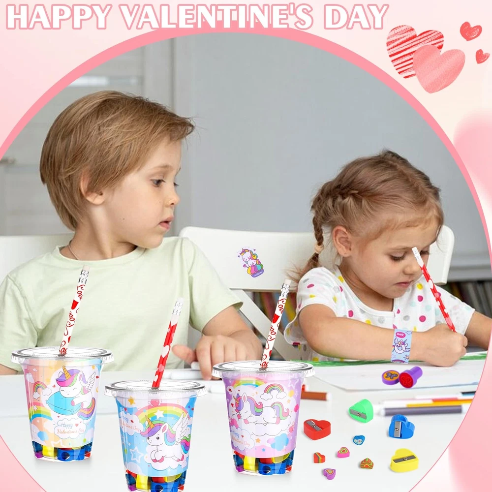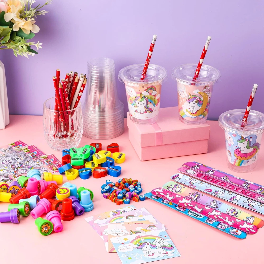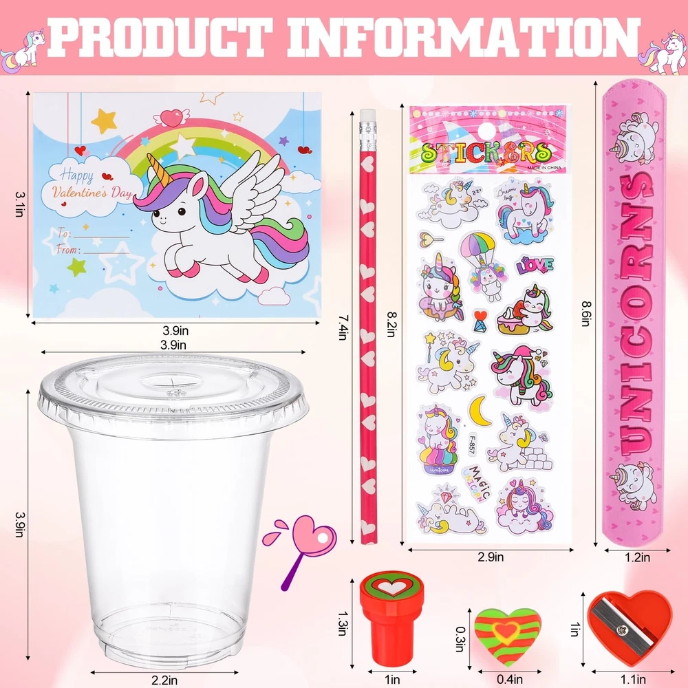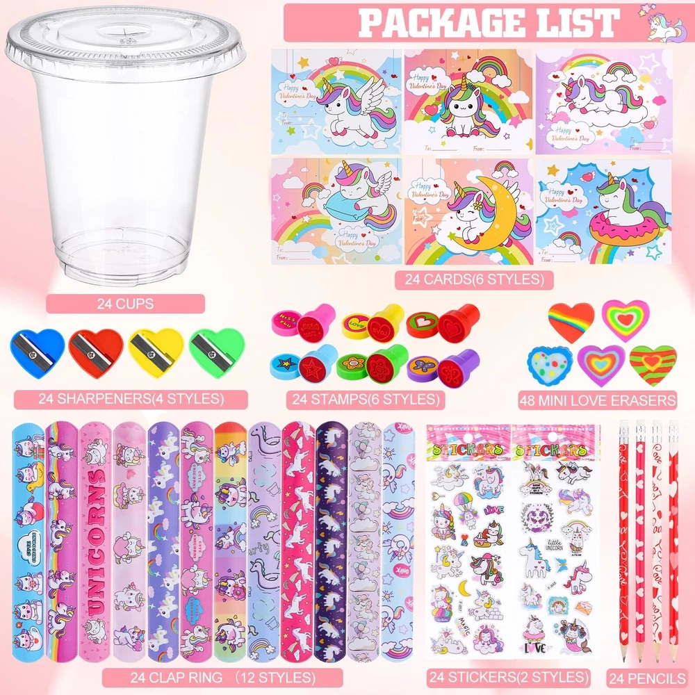 24 Sets Valentines Day Gifts for Kids-216 Pcs Valentine's Day Stationery Gift Include Cards Cups Stampers Slap Rings Pencils Eraser Sharpeners Stickers Valentine Day School Classroom Exchange Gift Product Details Style: Unicorn Brand: TLY MPN: valentine exchange gift UPC: Does not apply EAN: Does not apply Color: Red, Pink, White Material: Wood, Paper, Plastic, Metal Brand: TLY Unit Count: 216.0 Count Theme: Unicorn Item dimensions L x W x H: 3.86 x 3.86 x 4.06 inches Occasion: Valentine's Day Manufacturer: TLY Age Range (Description): over 3 years old Product Dimensions: 3.86 x 3.86 x 4.06 inches Item Weight: 2.35 pounds Country of Origin: China Manufacturer recommended age: 3 years and up Valentine Day Stationery Set: Valentine Day exchange gifts include 24 valentines day cups, 24 valentines day cards for kids school, 24 pencils, 24 snap rings, 48 heart erasers, 24 Valentine's Day stamps,24 sheets of stickers ,24 love pencil sharpeners. A total of 216 pieces, enough for gift exchange with classmates. Size: The valentine day plastic cups are about 3.9 x 3.9 inches/10 x 10 cm, can hold a variety of stationery, the card is about 3.9x 3.1 inches/10 x 8 cm, designed with 6 different styles of cards, suitable for gift exchange, mutual blessings. Unique Valentine Day Design: Valentine Day stationery exchange gifts integrate unicorns and Valentine Day elements, erasers, pencil sharpeners, stamps present "kiss you" "love", flowers, butterflies, hearts, stars, Valentine's Day theme cards are designed with cute text and unicorn patterns, matching the Valentine's Day stationery set, the classroom is full of sweet Valentine's Day atmosphere. Reliable Materials: The cups,stamps are made of plastic, pencil sharpeners are made of plastic and metal sheets, the valentines day cards are made of reliable paper materials, the pencils are made of high-quality wood and graphite, the erasers are made of rubber, and the snap rings are made of sturdy metal materials. All stationery can be used for a long time. Valentine's Day Themed Gift Exchange: This valentines day gifts can be used for school exchange, classroom exchange,teacher classroom prizes, party gift supplies, exchange gifts,Valentines Day party, Valentine Day goody bag filler, birthday party gift ,etc.