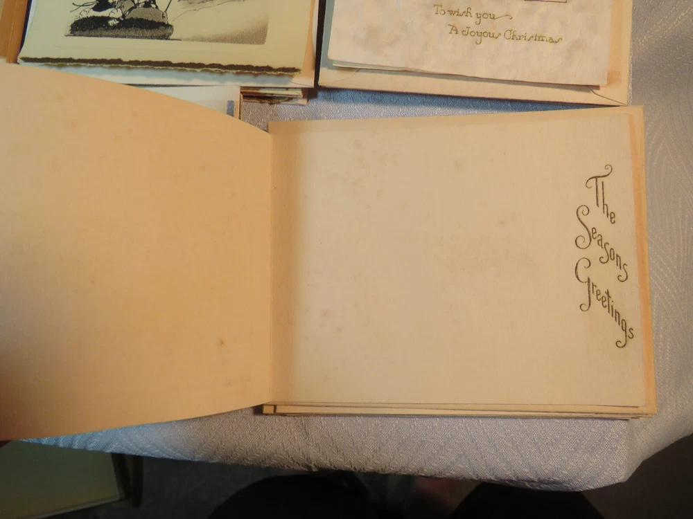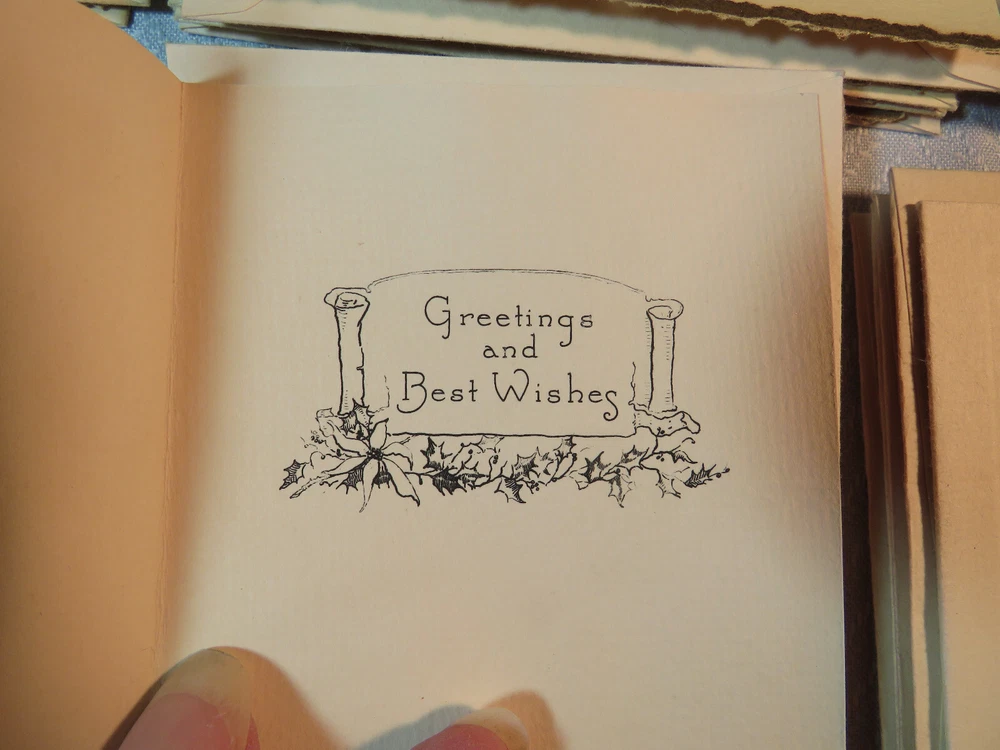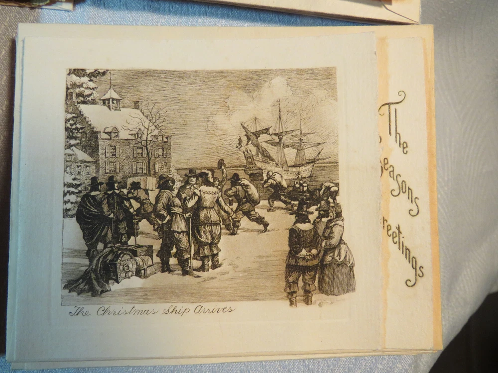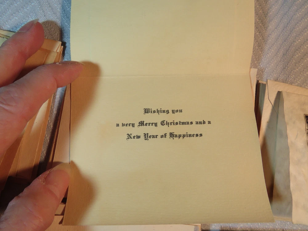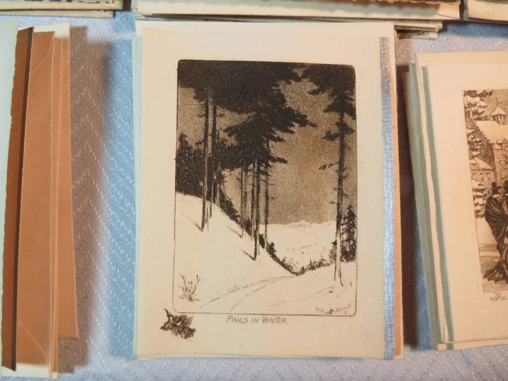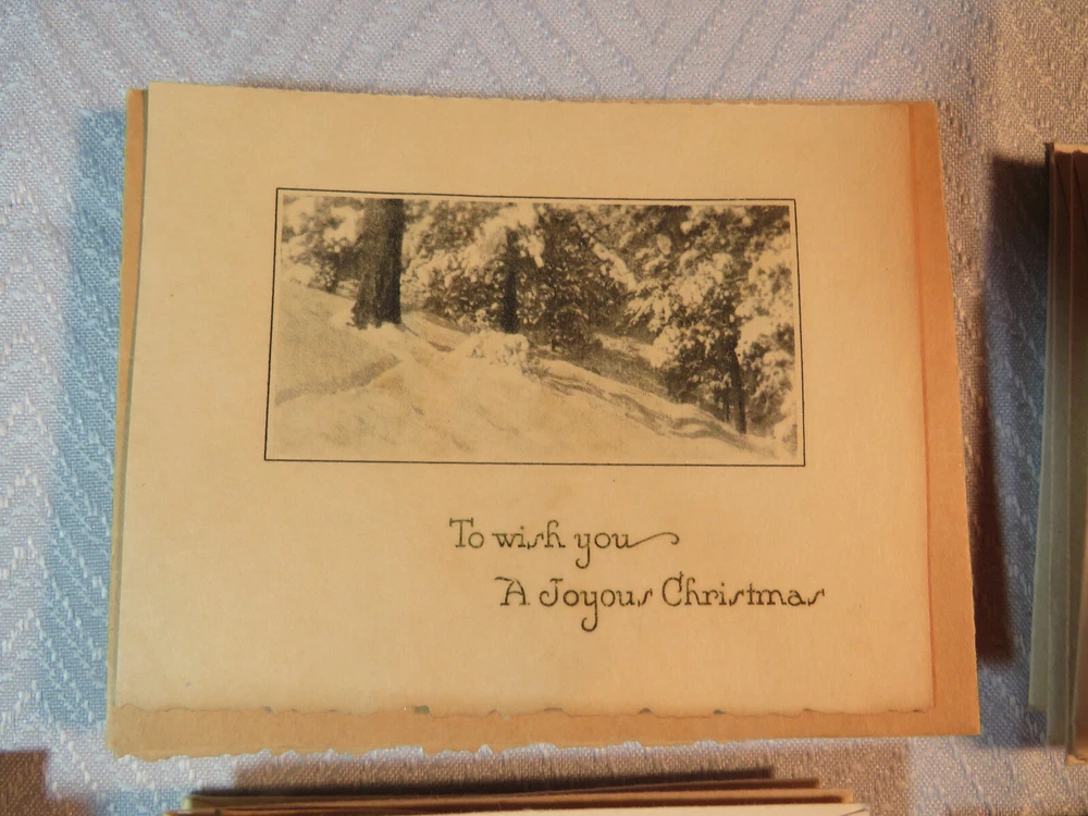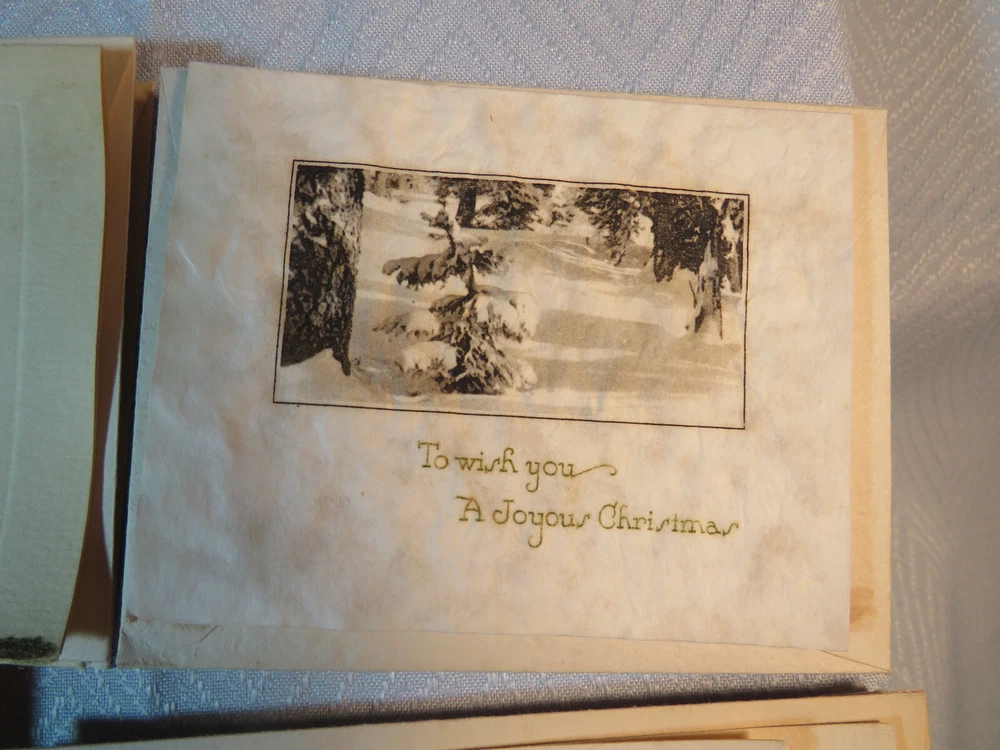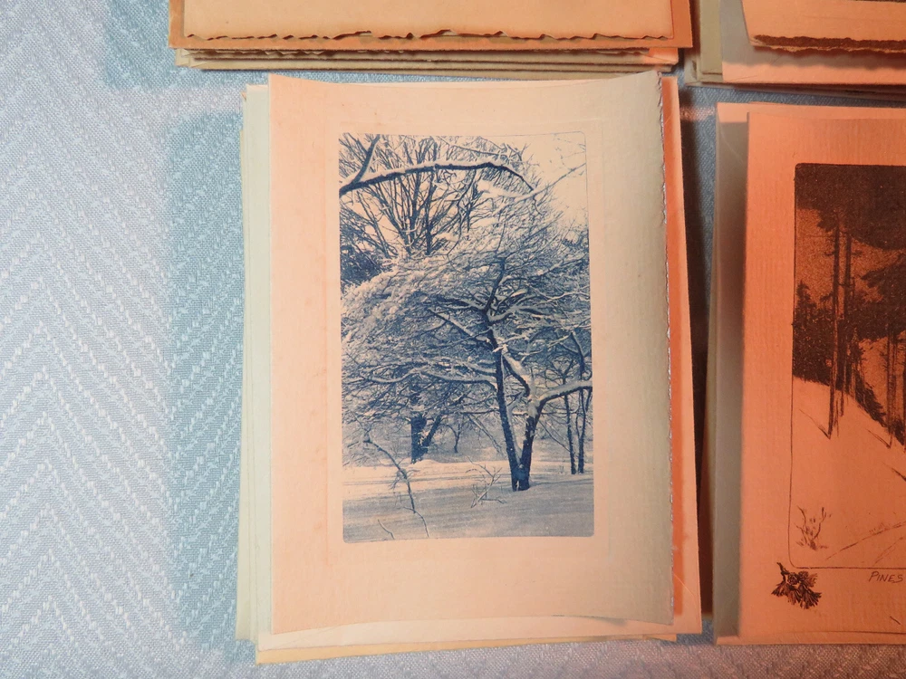 Lot of 24 vintage Christmas cards are from the 1920s to 1930s or so and are unused. There are 4 each of 6 different design cards, all with Christmas scenes, I think they are block prints, but not sure. The cards do not have any marks on them to show what company made them or where they were made. They all have the original envelopes. The cards are from the 1930s or so and are unused, but they do have some discoloration from age and the envelopes have dark areas where the glue has darkened the paper. A few cards are not flat, the horizontal edges are a bit curled.