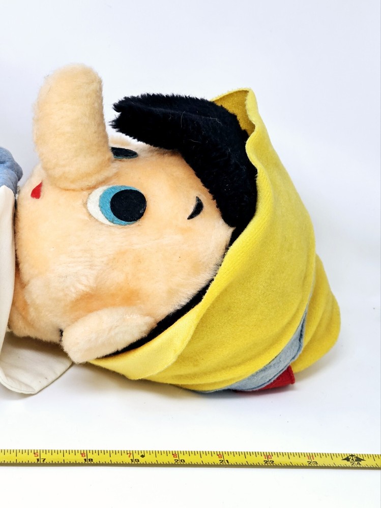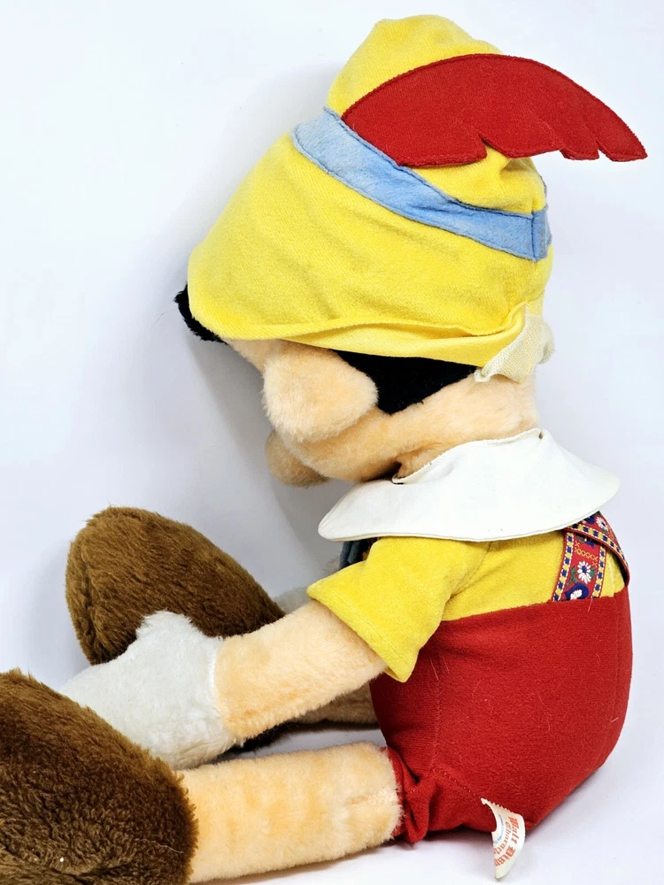 Large plush, shows some wear from the age. Eyes have some issues and small hole on right knee. Not sure about the back of head, but similar plush have the same thing. Please review pictures before purchasing to better understand the condition of the item. This is a 24" plush toy of the classic Disney character, Pinocchio. It features a cute and cuddly design that is perfect for Disney fans of all ages. The toy is made from high-quality materials and is based on the 1970s Disney movie, Pinocchio. It is a great addition to any collection of Disney memorabilia and is sure to bring joy and happiness to those who see it.