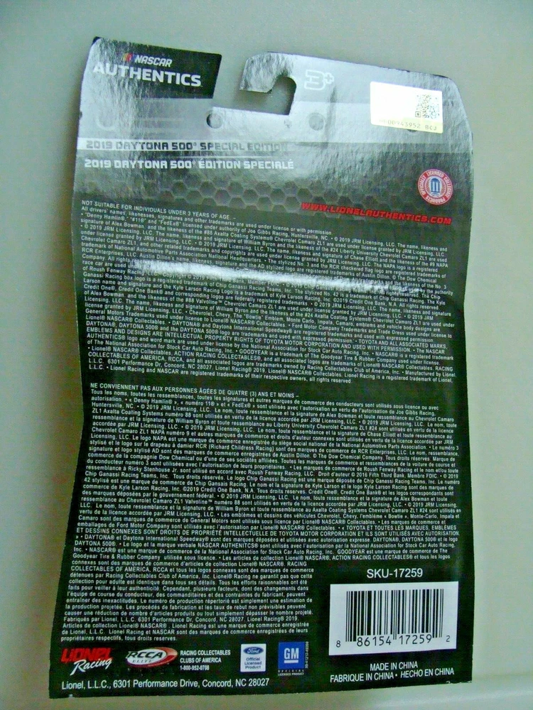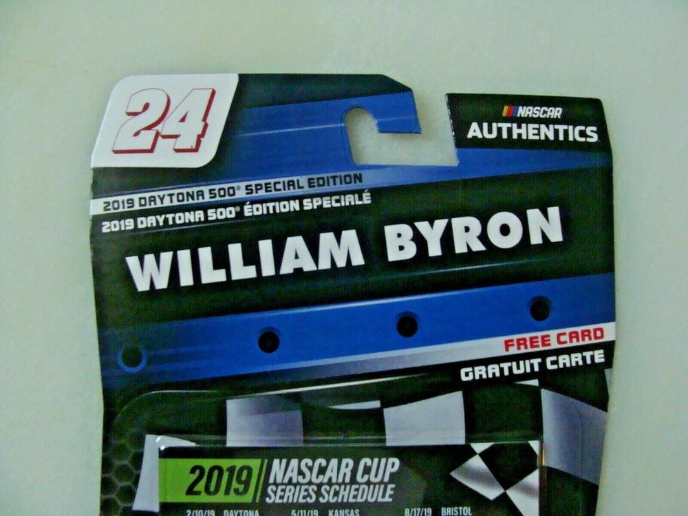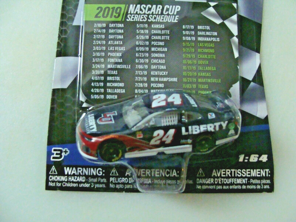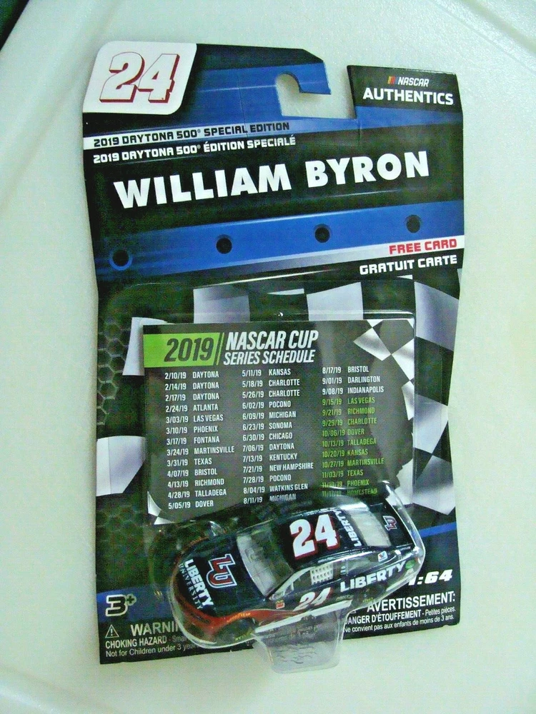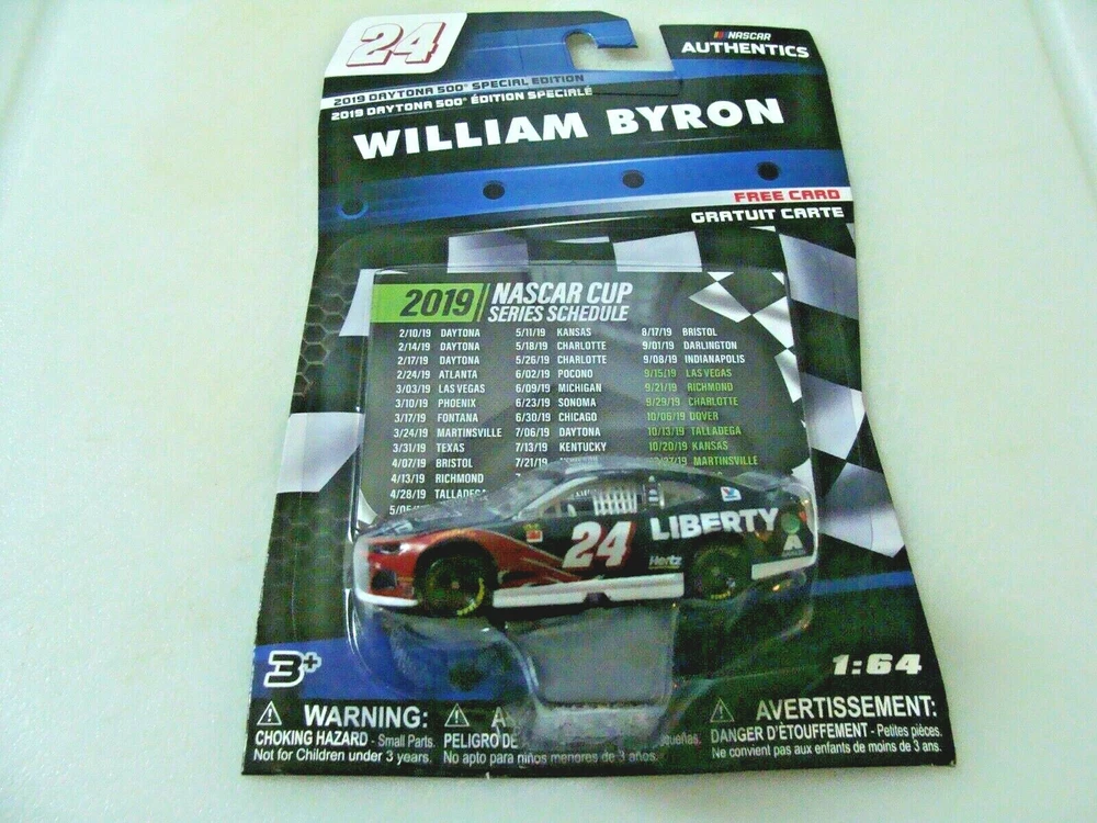 Special Edition 2019 Daytona Series - 1:64 diecast car from Nascar Authentics. Car on its original never opened blister bubble type package. Package in very good condition. Bubble is clear and dent free. You also receive a 2019 NASCAR Cup Series Schedule card with the 1:64 diecast car. LIBERTY UNIVERSITY Chevy Camaro. White #24 outlined in maroon on dark blue roof. LIBERTY lettered in white on roof rear. William Byron name above door windows. LU in maroon is on hood with LIBERTY University lettered in white beneath. Chevy bowtie on nose. Grill work and splitter has great detail. White valance. Maroon nose and front qtr. Diagonal dark blue returns at door panel. White #24 on door panel. LIBERTY in large white letters on uppr rear qtr. White lower side trim. AXALTA on lower rear qtr. Dark blue trunk deck has maroon LU. LIBERTY University in blue on white rear panel. Camaro on bumper. Great racy looking car........Clear windows. Gray net and interior. Goodyears on black rims. Winner to pay $6.55 S/H USPS. Canada S/H will be $17.90 USPS First Class Intl. PLEASE VIEW ALL PHOTOS........Thanks for looking & great luck with your bid........