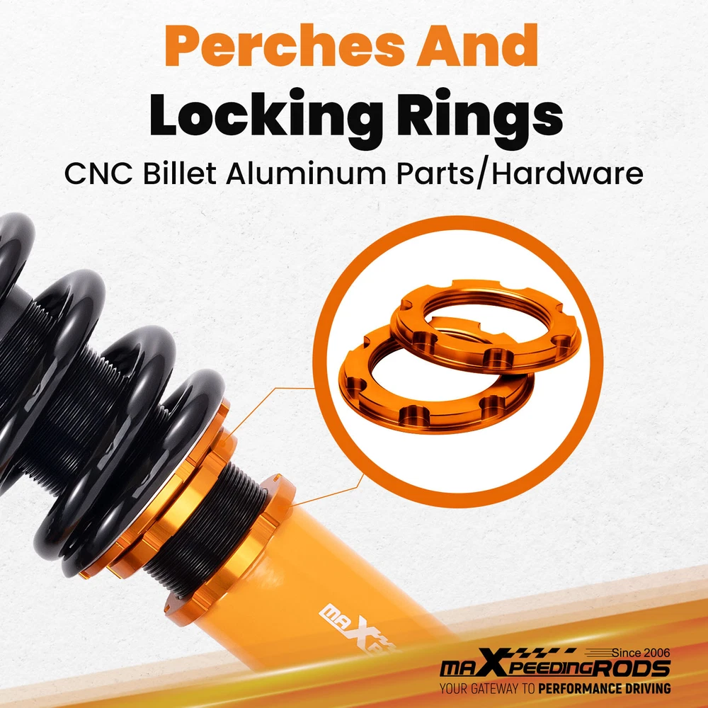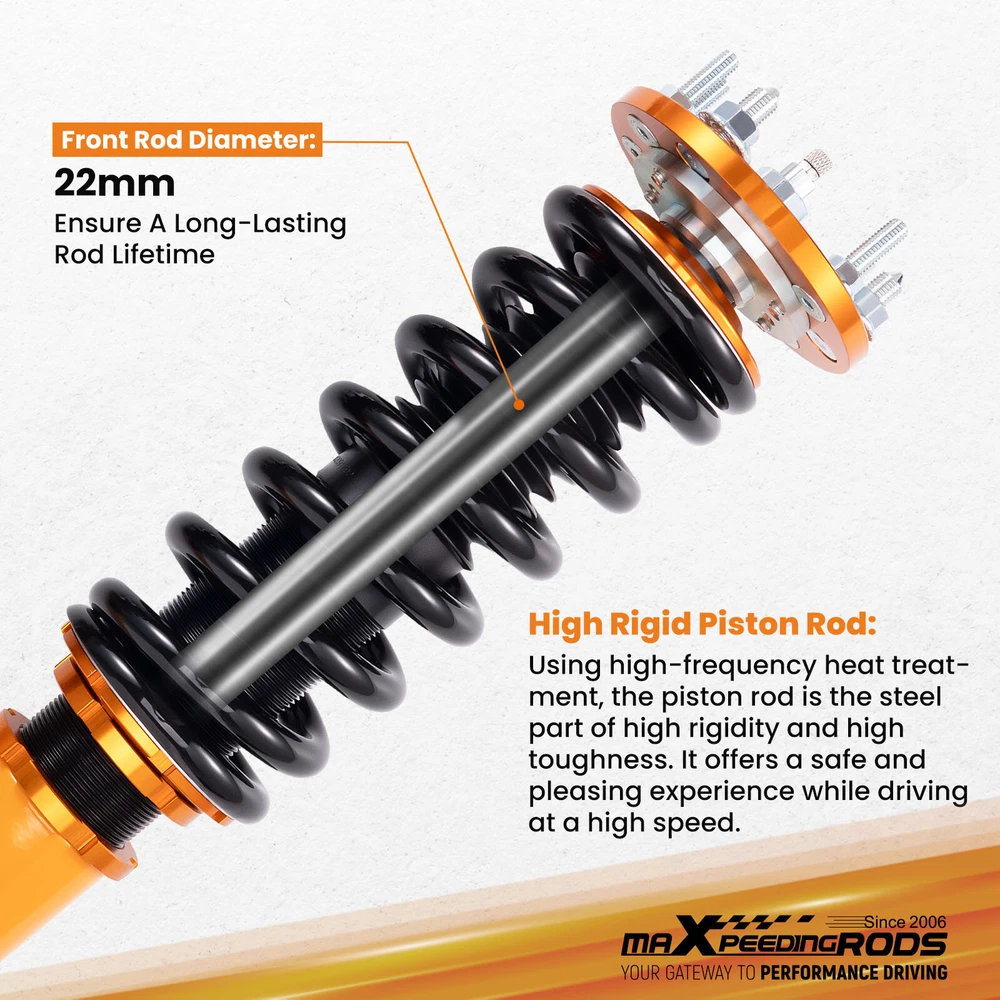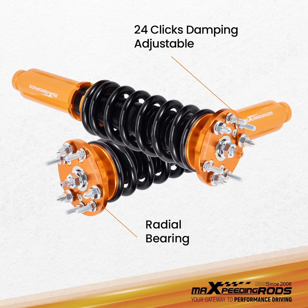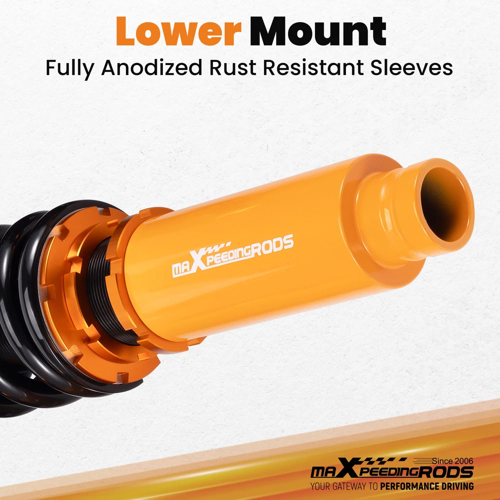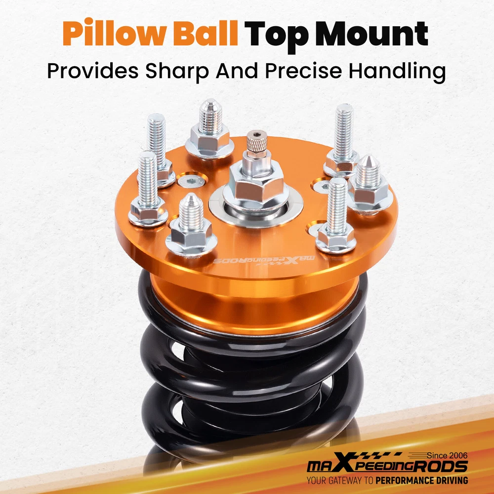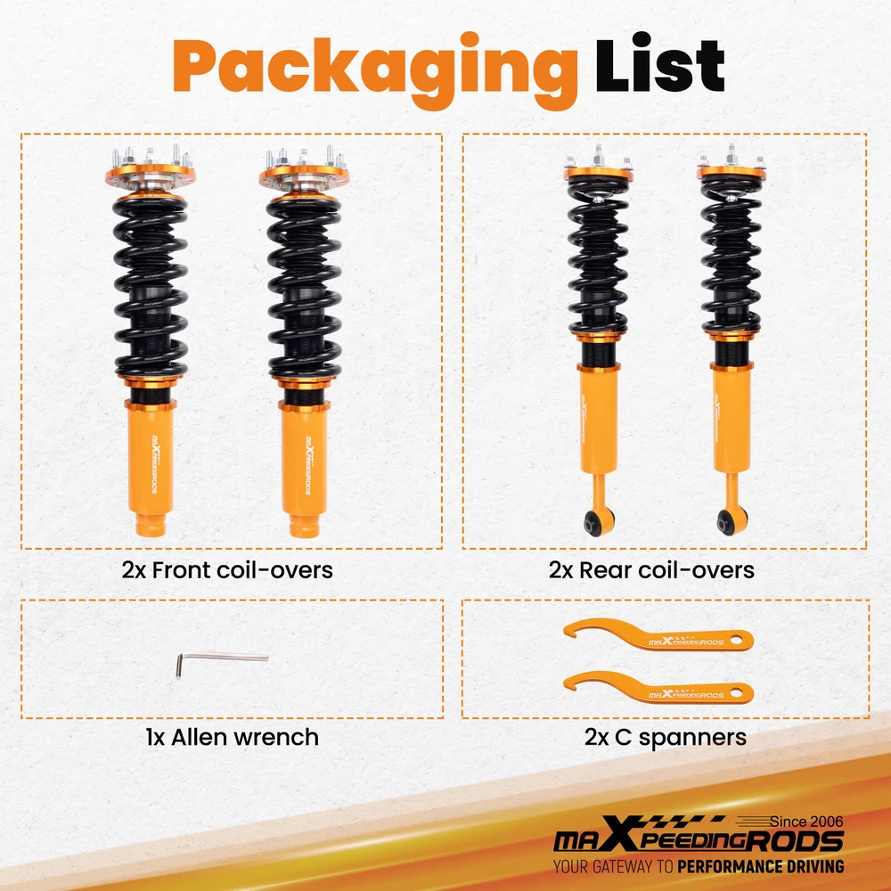 ZJPSS 24 Way Adjustable Coilovers Suspension Lowering Kit for HONDA ACCORD 2003-2007 Pillow Ball Mount Provides More Precise Feel From Suspension And Steering Pillow Ball Mount Provides More Precise Feel From Suspension And Steering Anodized Shock Body With Anti-Corrosion Coating Manufactured From High Quality T-6061 Billet Aluminum With Anodized Finish For Superior Strength And Corrosion Protection. Drops From 1 to 3 Inch From Factory Ride Height Full Threaded Absorber Tube Casing For Independent Height Adjustment. Durable Cold Wound Steel & Heat Treated Coils High Rigidity 55CrSi Steel Cold-bent Coil Springs - Over 600k Continuously Stress Test With 0.04% Distortion Rate. Pillow Ball Mount Provides More Precise Feel From Suspension And Steering Anodized Shock Body With Anti-Corrosion Coating Drops From 1 to 3 Inch From Factory Ride Height Durable Cold Wound Steel & Heat Treated Coils Specifications Adjustable damper Yes, 24 levels rebound damping adjustable Adjustable height Yes, Lowering 1-3 inch Front Spring length 230mm Rear Spring length 230mm Front spring length 10kg/mm(560 lbs/in) Rear spring length 6 kg/mm (336 lbs/in) Package Including 2 Front + 2 Rear Warranty 1 Year MaXpeedingrods coilovers offer excellent, versatile performance, durability and ride comfort over all road conditions. Featuring 24 levels of damping adjustment, the damper can be easily accessed and adjusted via a knob at the top of the damper mount. Simple adjustments can be made to tune to your desired style of driving and comfort level that you desire. This allows you to preset to soft damping for your daily drive and switch to hard damping for track days. Features - 24 Step to adjust soft / hard adjustment according to your preference - Ride Height Adjustable - Drops From 1 to 3 Inch From Factory Ride Height - 55CrSi high strength durable cold wound steel & heat treated coils - Manufactured from high quality T-6061 billet aluminum with an anodized finish for superior strength and corrosion protection. - Improved Handling and stability without premature tire wear - Improved Vehicle Stability and traction in hard cornering situations - Full threaded absorber tube casing for independent height adjustment - Twin-Tube System for Comfortable Ride on Streets - Fully Rebuildable With All Parts Available Application For Honda Accord VII 4-door sedan CM4/CM5/CM6 2003-2007 For Honda Accord VII 2-door coupe CM7/CM8 2003-2007 For Honda Inspire 2003-2007 (Japan market only) For Honda Acura TL/TL Type-S 2004-2008 Specificaions - Height adjustable: Yes, lowering 25-75mm depending on the vehicle models - Spring Rate Front: 10 kg/mm (560 lbs/in) - Spring Rate Rear: 6 kg/mm (336 lbs/in) - Front spring inner diameter: 70.5mm - Rear spring inner diameter: 70.5mm - Spring length Front: 230mm - Spring length Rear: 230mm - Spring Preload advised: 7-10 mm - Color: Golden body with black spring Product included 2x front coil-overs 2x rear coil-overs 2x C spanners ★ 30-day Money Back & 12-Month Replacement Guarantee. Please feel free to contact us if there is any question. Height Adjustable Lowering Kit; Independent Ride Height And Spring Tension Settings; 24 Clicks of Rebound Damping Force Adjustment; High Rigidity 55CrSi Steel Cold-bent Springs; Anodized Shock Body With Anti-Corrosion Coating; Top Pillow Ball Mount Provides More Precise Feel From Suspension And Steering; Full 1 Year Limited Warranty From Date Of Purchase. Other items you might also like Set(4) Full Coilovers Struts Suspension For Honda Accord 2003-2007 Height Adjust MaXpeedingrods Coiloves 24 Way Damper Suspension Kit for Honda Accord 2003-2007 MaXpeedingrods Coilovers Shocks+Springs For Honda Accord 03-07 / Acura TSX 04-08 Adjustable Coilover 24 Ways Shocks Struts For Honda Accord 2003 2004 2005 2006 Coilovers 24 Way Damper Adjustable Suspension Kit For Honda Accord 2003-2007 Coiloves Shock Kit w/ 24-way Adjustable Damper for Honda Accord 2003-2007 Front + Rear Coiloves 24 Way Damper Suspension Kit for Honda Accord 2003-2007 Coiloves Suspension Kit 24 Levels Adj. Damper for Honda Accord 2003-2007 MaXpeedingrods Coilovers Suspension Lowering Kit For Honda Accord 2003-2007 24 Way Damper Coilovers Kit For Honda Accord 03-07 Suspension Shocks Struts 24 Levels Damper Adjustable Coilovers Lowering Kit For HONDA ACCORD 03-07 Racing Coilovers Set Fit Honda Accord 2003-2007 Height Adjustable Struts Shocks Shipping Terms of Sales Payment Contact us All orders will be shipped within 1 business day after payment has been processed. For orders placed before 5:30 AM PST on business days, most items will be shipped out on the same day. All orders will be shipped with a tracking number via USPS, UPS, or FedEx Express and delivered within 2-6 business days We do not ship to P.O. Boxes, APO/FPO addresses, or Military Mail Boxes. Please ensure your address is confirmed by PayPal before checkout, as we only ship to confirmed addresses. 30-day free return and money back guarantee If you are not satisfied with your purchase, you can return the item with its original packaging to us for a full refund with no restocking fee. Please note that the return cost should be paid by the seller. One Year Unlimited Mileage Quality Guarantee If you receive incorrect items, items that are damaged during transportation, or defective items, we will accept returns and cover the return freight. Please note that the return cost should be prepaid by the buyer. After inspecting the faulty item, we will issue a refund of the return cost to the buyer. We offer a full refund or replacement for all faulty items, which includes the cost of original shipping. Please contact us before initiating a return. Our representatives will provide you with detailed instructions on how to proceed. Our guarantee covers only the cost of the item. We are not responsible for installation or other fees, such as labor, towing, additional repairs, or related expenses. We only accept payment through Paypal for all orders, which sho