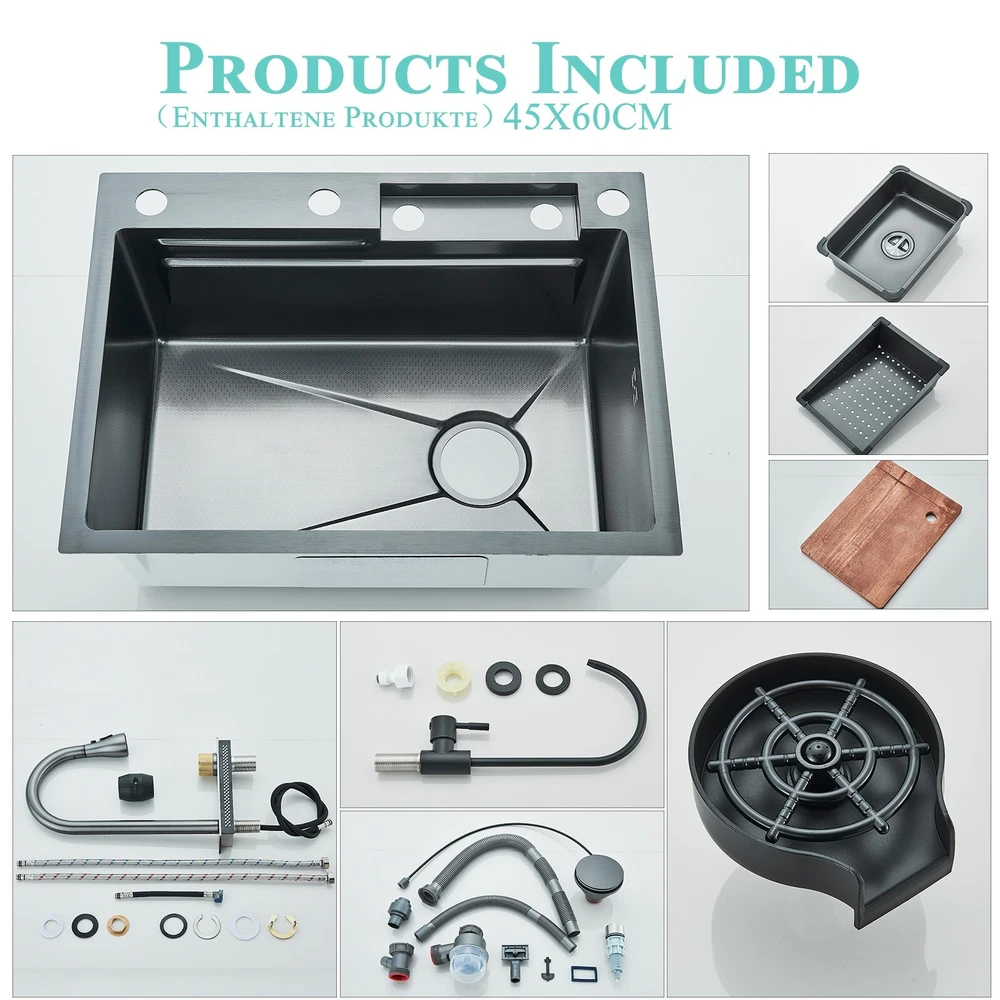 Store Categories Store Categories China Warehouse Shipment CN-Accessories CN-Basin Faucet CN-Bathtub Faucet CN-Kitchen Faucet CN-Shower Faucet CN-Shower Panel CN-Shower Set CN-Shower Head U.S. warehouse shipment Accessories Basin Faucet Bathtub Faucet Kitchen Faucet Shower Faucet Shower Head Shower Panel Shower Set Kitchen Faucet 2 UK warehouse shipment Accessories Basin Taps Bathtub Taps Kitchen Taps Shower Taps Shower Head Shower Panel Shower Set Shipment from German warehouse Other Product Certification Details Function: Kitchen sink with Kitchen Sink Faucet Feature: Pull Down faucet Finish: Matte Gray Sink Length: 600 mm Sink width: 450 mm Sink height: 210 mm Faucet Body Material: Stainless steel Faucet Spout Material: ABS Plastics Sink Material: 201 Stainless steel Shipment & conditions Payment Method Contact us Feedback Shipment & conditions Usually shipment can be arranged within 2working days after receiving payment. Each item can be shipped out if payment received before 17:00 each day. We usually ship via Fedex , UPS, USPS. We have warehouses in many locations in the United States, and will use the warehouse closest to you for shipment. We ship to the address in the order.Therefore, please make sure that the address you fill in when purchasing is correct. After the product ships, the estimated delivery time in the order is the best-case scenario. We cannot guarantee delivery within the estimated delivery time. Because logistics and transportation have great uncertainty. The buyer is responsible for returning the product if it is not a quality problem. Payment Method Paypal, Google Pay, VISA, AMEX, etc. Contact us Shipping damage has to be reported within 5 business days of which the product was delivered. If you have any questions, please be free to contact with us,we will answer your questions ASAP. We will answer your question via email, please check your email for the answers. Feedback I describe items as well as I can. If I have missed something, please let me know. Please e-mail me before leaving feedback if you are unhappy with your item, so we can work it out. International Buyers – Please Note: Import duties, taxes, and charges are not included in the item price or shipping cost. Urheberrecht©Xifumixertaps