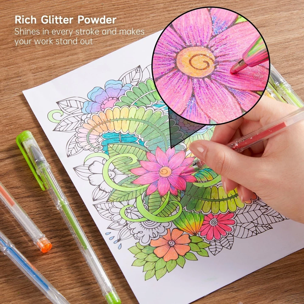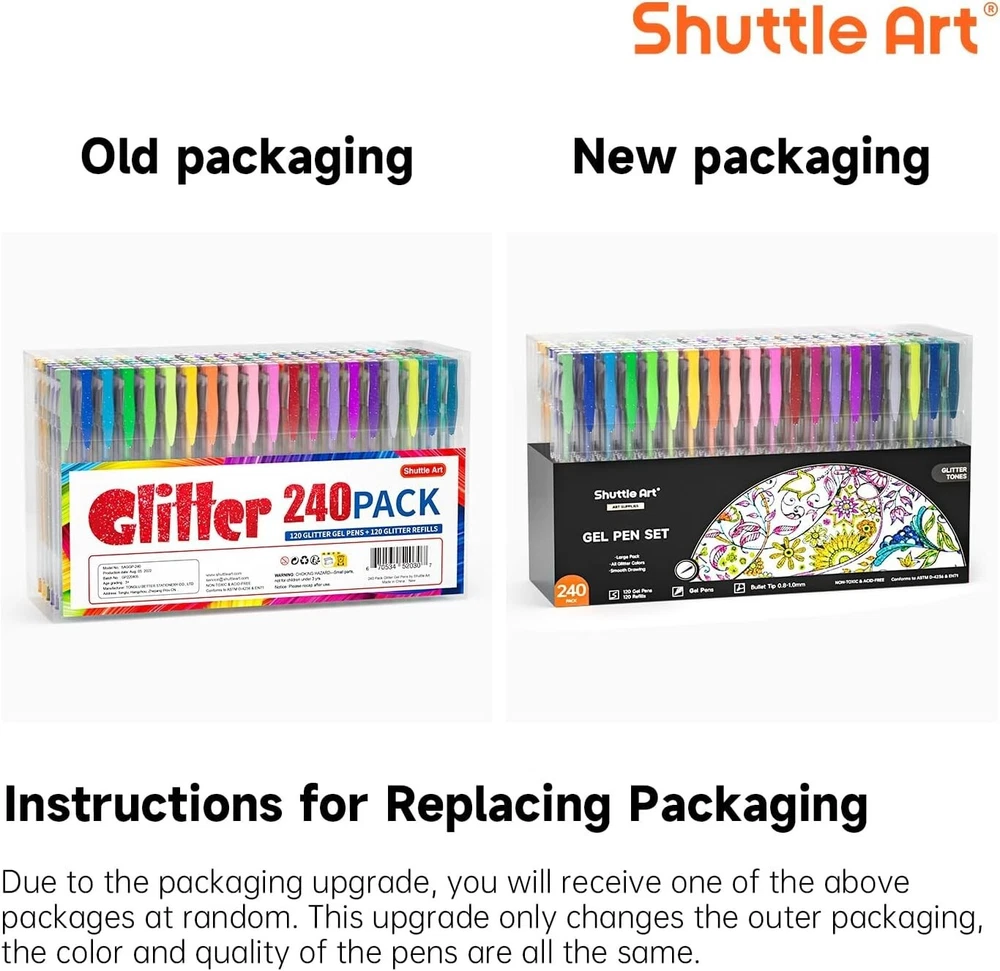 240 Pack Glitter Gel Pens, 120 Colors Glitter Gel Pen Set with 120 Refills for Adult Coloring Books Craft Doodling Description: 240 GLITTER PACK: Shuttle Art 120 Colors Glitter Gel Pens contains 120 INDIVIDUAL glitter + neon glitter colors, plus 120 matched refills. Enjoy the fun of coloring! Each pen enjoys a unique color, which brings much more fun for Adult book Coloring, Scrap booking, Sketching, Doodling, Drawing, Writing, and all the other art designs. GLITTER ONLY: All the pens are with glitter powder that meets the special requirement for glitter fans. Makes you lost in the glitter world! NICE PACKING: Convenient and easy taking. SUPERIOR QUALITY: Long lasting, durable tips, smooth writing, non-toxic, acid free. Conforms to ASTM-D4236.