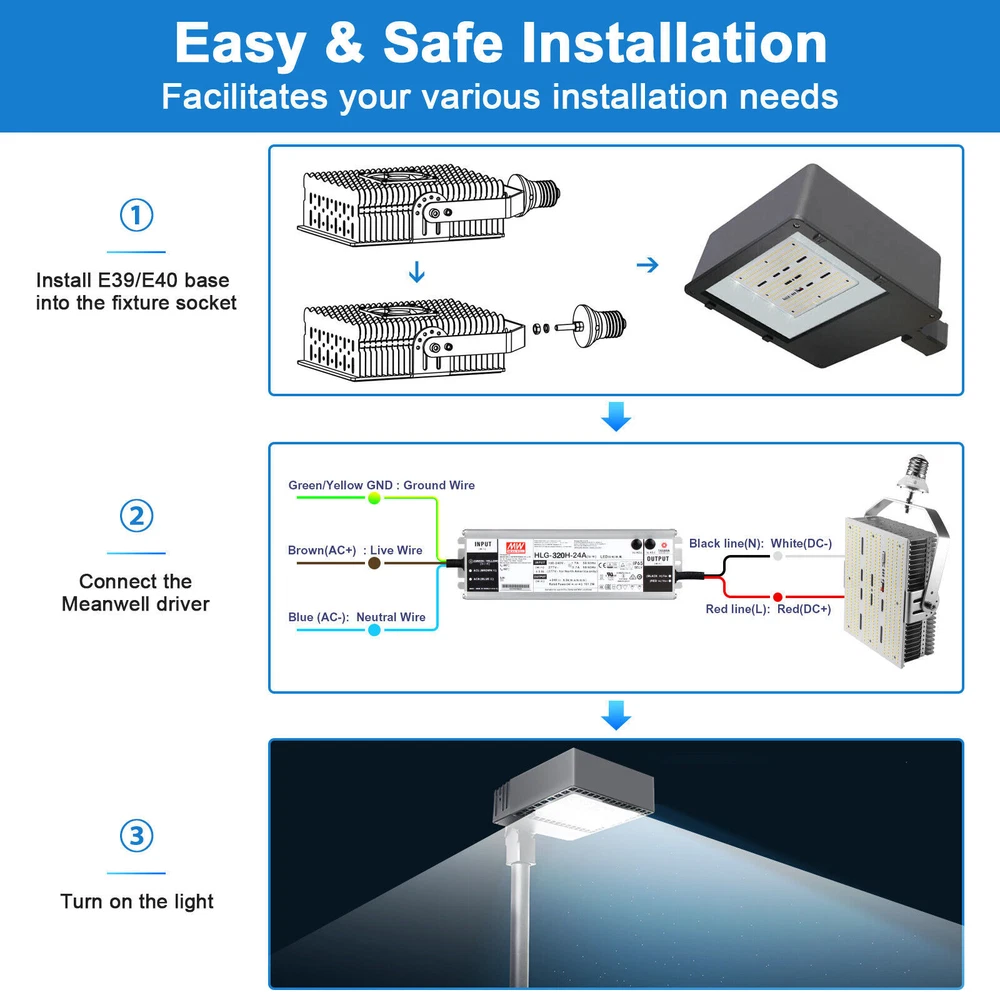 Product Description 240Watt LED Retrofit lIT fOR Parking Lights Replace 1000W HID MH Fixture 5000K The LED Light Retrofit Kits are commercial and industrial grade LED lighting solutions for area post top lights, shoe box parking lot lights and high mast lighting for large area lighting solutions. It's an ideal option for updating your parking lot lighting. Super Bright Shoexbox LED Retrofit Kits - With outstanding 145 lumens per watt, the led retrofit kit provides 34,800 lumen output. This 240 watt led light is a perfect replacement for a 1000W MH/HPS/HID bulb ,typically appearing brighter and also providing more than 90% in energy savings.80+ CRI Rating and 5000K for super bright outdoor large area lighting Maintenance Saving - Advanced SMD3030 LEDs and Meanwhile Driver for superior performance and longer lifespan.Excellent heat dissipation system with overheat protection sensor, aluminum heat sink and high speed fan to protect leds at lower operating temperature. Longer lifespan of 500,00 hours, that's about 23 years of 6 hours per day,which will reduce maintenance cost dramatically. Quick Installation - The led retrofit kits come with E39 Mogul Base - Just screw in. Replace the ballast with the LED Driver and old bulb with the LED light. No need to replace existing fixtures. Adjustable U bracket for horizontal and vertical mounting. Please check retrofit kit picture and dimensions to ensure fitment. Wide Application - High Bay led retrofit kit is perfect for retrofitting existing high bay,low bay, wall pack, led parking lot pole lights,led tennis court lights,led shoebox light, and many other types of fixtures. Great solution for commercial electrical contractor or project managers! 5 Year Warranty - ETL DLC listed, which ensures Rebate Eligible and lowest maintenance. We also offer 5 years warranty for the 1200 watt metal halide led replacement retrofit kits. Specification Rated Power: 240W Power Supply: MEANWELL Driver Input Voltage: 100V-277V 50/60Hz CCT: 5000K Operating Temperature:-31ºF-131ºF LED Chip: SMD 3030 Lifespan: > 50,000 Hours Materials: Aluminum Equivalent:500-1000W HID 240W Shoebox LED Retrofit Kit Equivalent up to 1000W led parking lot pole lighting with 34,800 lumens @ 240 watt parking lot led retrofit kits,typically appearing brighter and also providing more than 90% in energy savings. You can reduce a tremendous amount of energy consumption. Adjustable LED Retrofit Kit Comes with adjustable U bracket designed for horizontal and vertical mounting, you can adjust the light according to your needs. Please check the retrofit kit pictures and dimensions to ensure fitment. Better Cooling System The advanced cooling system uses a specially designed fan, heatsink and automatic thermal sensor which can protect the light from burning out and achieve 50,000+ hours lifespan. Great Solution for Contractor E39 Mogul Socket Mount Adapter Included. Reduce energy costs and maintenance costs dramatically Save money for your business or organization. Keep your old Light Fixture Retrofitting to retain your property’s existing aesthetics, especially when it already matches your desired architectural design. Lower your energy bills, often with government or utility rebates and no more maintenance. Superior MEANWELL Driver We use high quality components for long lifespan. Long will reduce maintenance cost dramatically. The power supply is separate from the light source, which is a big plus! Installation Steps: 1.Caution: Please remove Ballast, Capacitors and Ignitor. 2. Please fix the retrofit kit in fixture socket with screws(Recommended) Or E39 E40 install in fixture socket 3. Output of LED Power Supply: Red Wire (L) to connect Red Wire(DC+) of the light panel;Black Wire (N) to connect White Wire(DC-) of the light panel; Input of LED Power Supply(AC 100-277V): Green/Yellow Wire(GND) to connect Ground Wire; Brown Wire(AC+) connect Live Wire; Blue Wire (AC-) connect Neutral Wire 4.Turn on the light About Us Payment Shipping Returns Contact Us SHENZHEN NUOGUAN TECHNOLOGY CO. LTD founded in 2010. We are high-technology comany specialized in manufacture Commercial and industrial LED light. Advanced production equipment and excellend R&D ability help us to combining service ,production sell together provide top-level products to our customers. 1. Payment is expected within 7 days of auction close. Or Unpaid Items will be forfeited per eBay . 2. Taxes may be applicable at checkout as states adopt new laws and regulations regarding sales tax collection. 1. We ONLY ship to USA . 2. Orders processed within 1-2 business day of payment verification. There’s no Delivery service or courier service on Saturdays, Sundays or Public Holidays. 3. We have 3 different warehouse in US,so due to stock status and time differences, we will choose to ship your item from our first available warehouse for fast delivery. 4. We offer Free Shipping within the Lower 48 states! All packages are sent via UPS or USPS.The delivery time for UPS Ground is typically 2-5 business days. We strive to ensure 100% satisfaction for each and every one of our customers. we offer a 30-day 100% money-back guarantee on all eBay orders. If your item isn't just as you wished, simply send it back to us and we'll refund or replace your item. Please note that all returns must be authorized by our Customer Service department. please contact us though message first if you have any problem. USA Warehouse. Fast shipping! We are appreciated your purchasing form our eBay store. Office Time: 9:30 - 18:30, Monday - Saturday (UTC+8) Please contact us with eBay Message. We will respond you within 24 hours on business day. About Us SHENZHEN NUOGUAN TECHNOLOGY CO. LTD founded in 2010. We are high-technology comany specialized in manufacture Commercial and industrial LED light. Advanced production equipment and excellend R&D ability help us to combining service ,production sell together provide top-level products to our customers. Payment 1. Paym