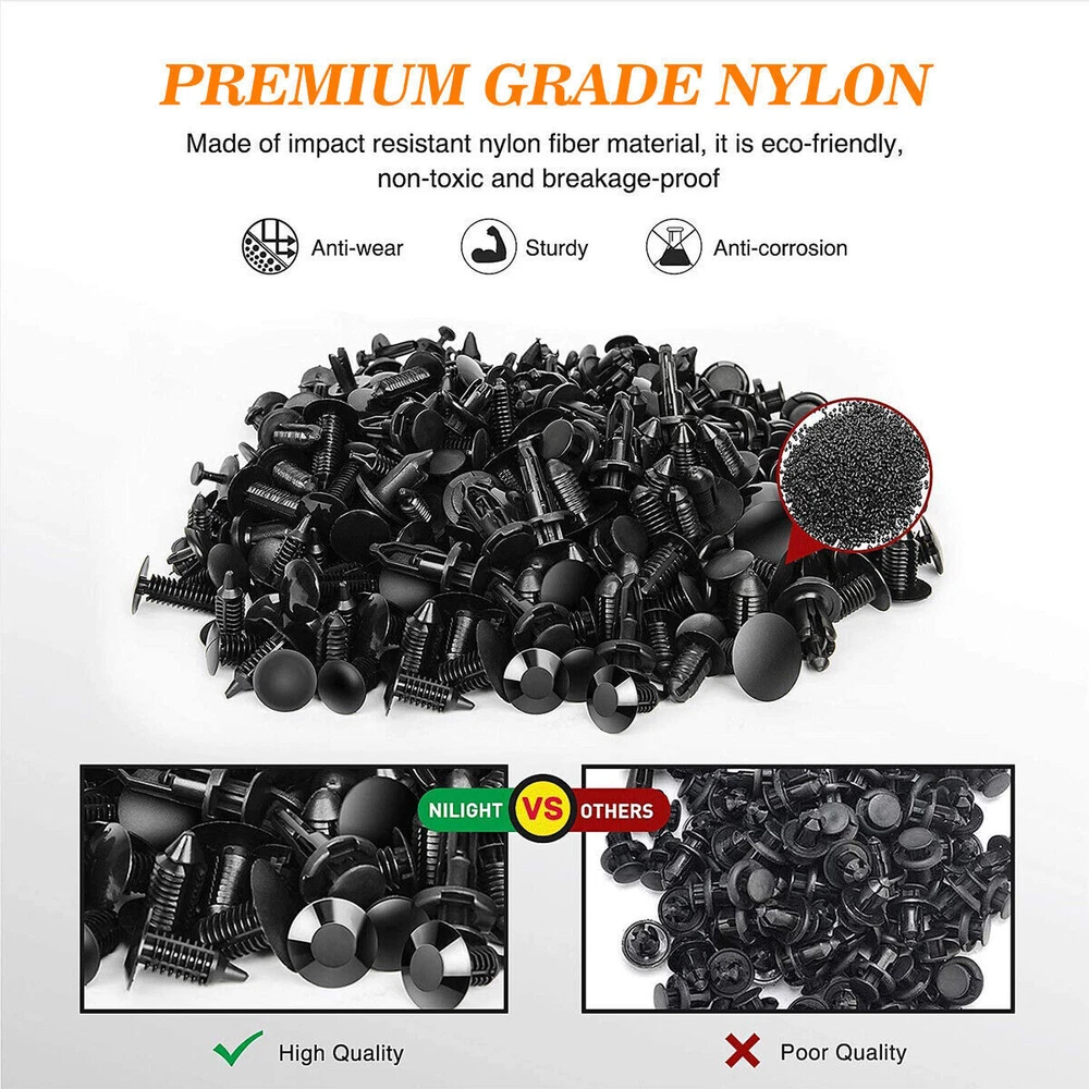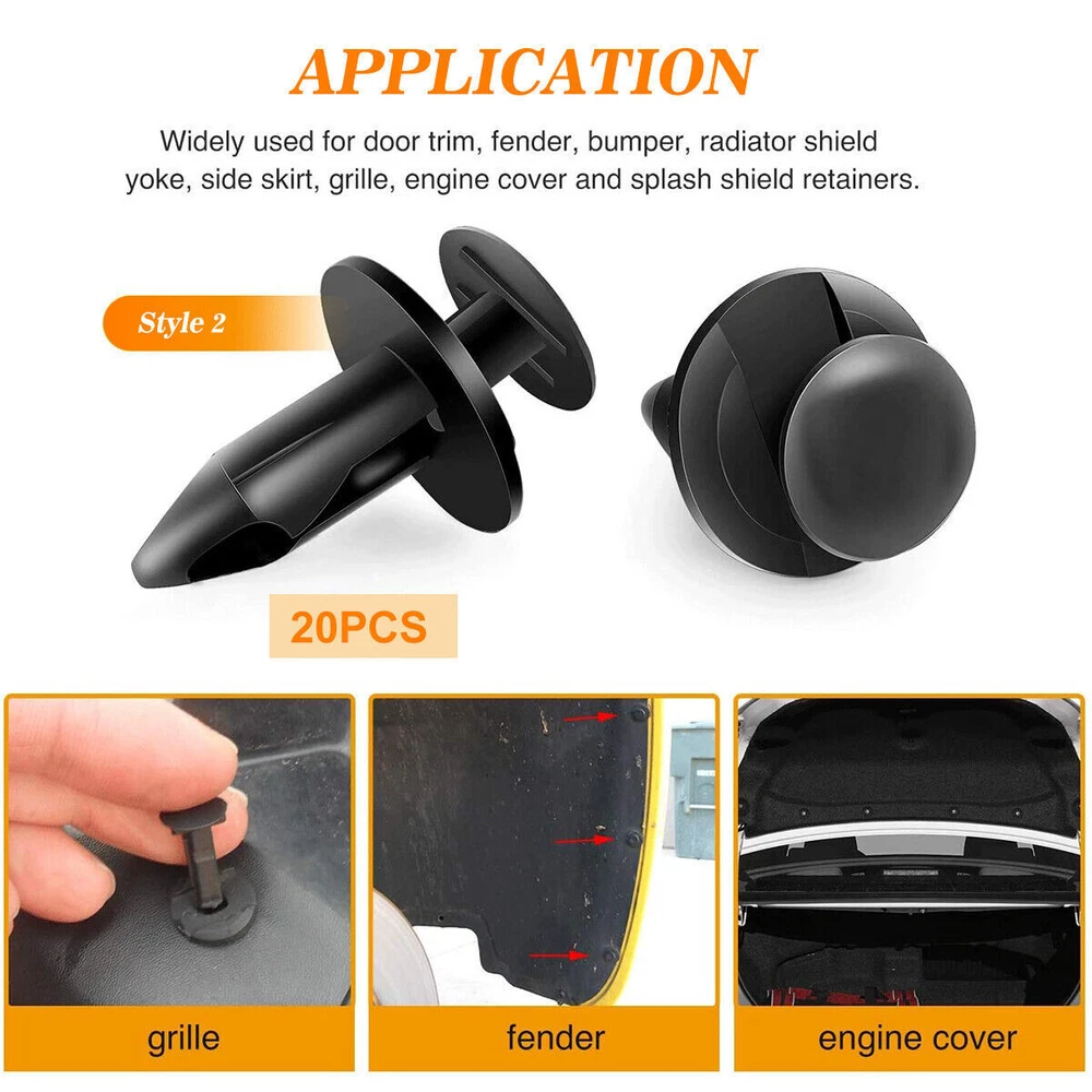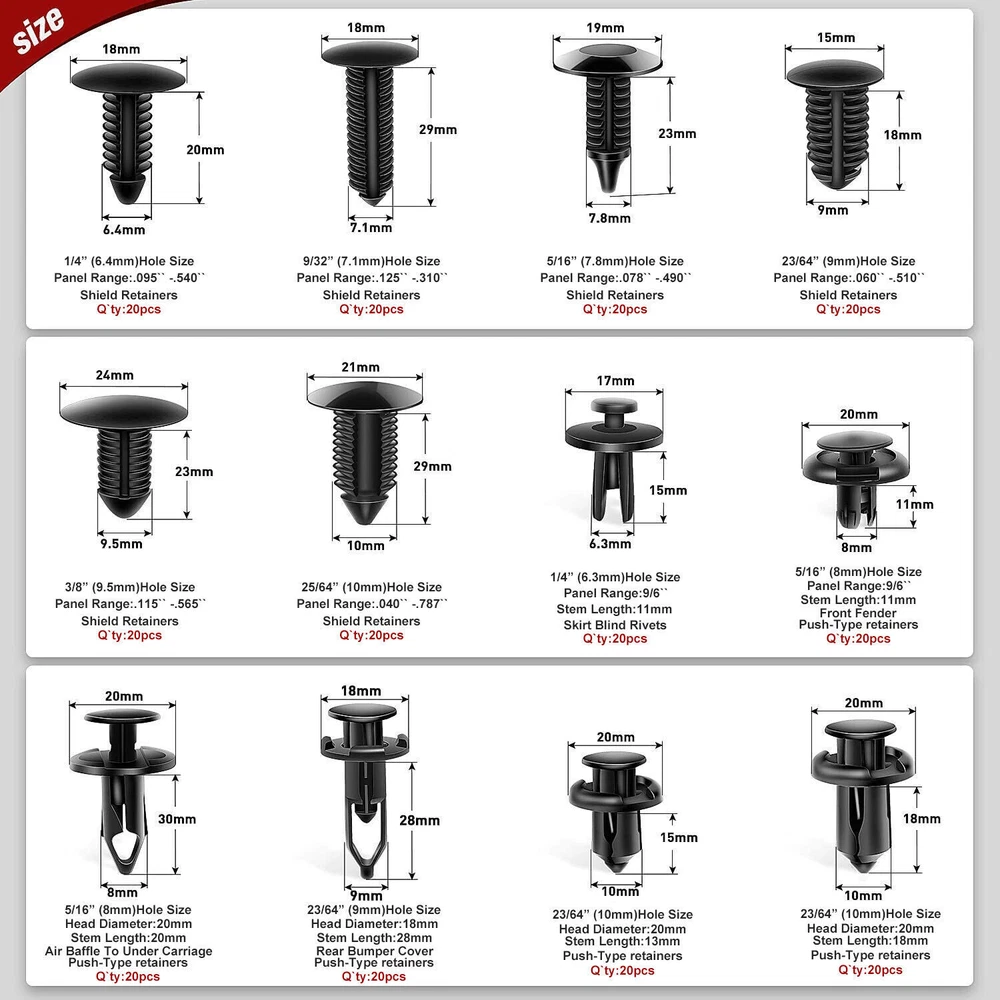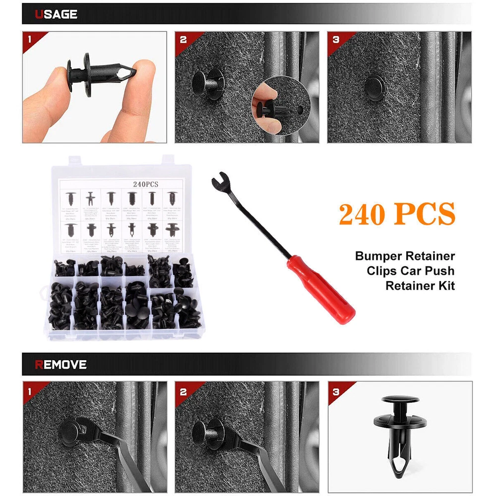 Product Description Features: A great Push Retainer Kit including 12 popular size. You can find 240pcs of automotive push type retainers in the small box instead of going to an auto parts store for different fasteners. These push clips are widely used in the replacement of body clips, decorative panel clips, door decorative fasteners, door panel clips, bumper clips, fender clips, engine hoods and fender clips, and can cover telecommunications Equipment, automobiles, household appliances, furniture and electrical equipment. With fastener remover, so that you can quickly and easily remove and install car door trim panels and interior trim clips. The car fastener clip is made of high-quality nylon, wear-resistant and corrosion-resistant, will not crack or break in use. Commonly used for cars' side skirts, bumpers, automobile fenders, engine hoods, door trims, interior trims and various trims of auto parts. Also Can be used in cars, trucks, motorcycles, buses, trains, airplanes, caravans, etc. Package: 240x Retainers Clips 4x Plastic remover 1x Metal remover 3X Replacement Gas Can Spout Nozzle Vent Kit For Plastic Gas Cans Old Style Cap· 7.99 USD Free shipping Portable Hat storage Hat Organizer Baseball Caps Hat Storage Bag Cap Holder New 8.99 USD Free shipping Snow Foam Washer Gun Car Wash Soap Lance Cannon Spray Pressure Jet Bottle Nozzle 9.99 USD Free shipping Solid Brass Garden Spray Nozzle 4" Adjustable Twist Water Hose USA Stock 2 PACK 9.49 USD Free shipping Wireless Driveway Alarm Infrared Motion Sensor Home Garage Alert Security System 13.4 USD Free shipping Folding Stool Portable Telescopic Chair Camping Retractable Outdoor Fishing 13.99 USD Free shipping