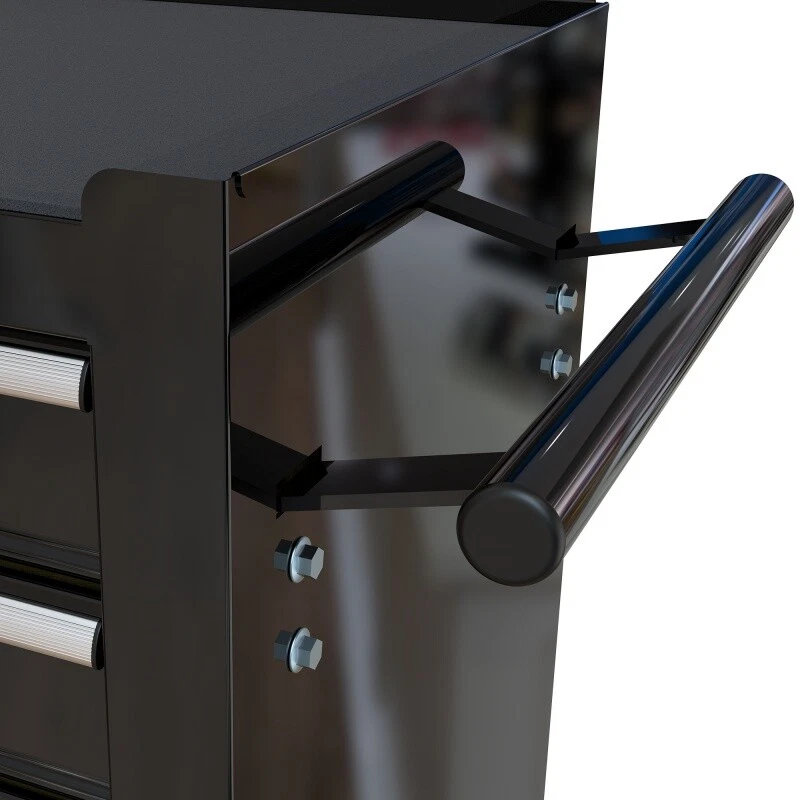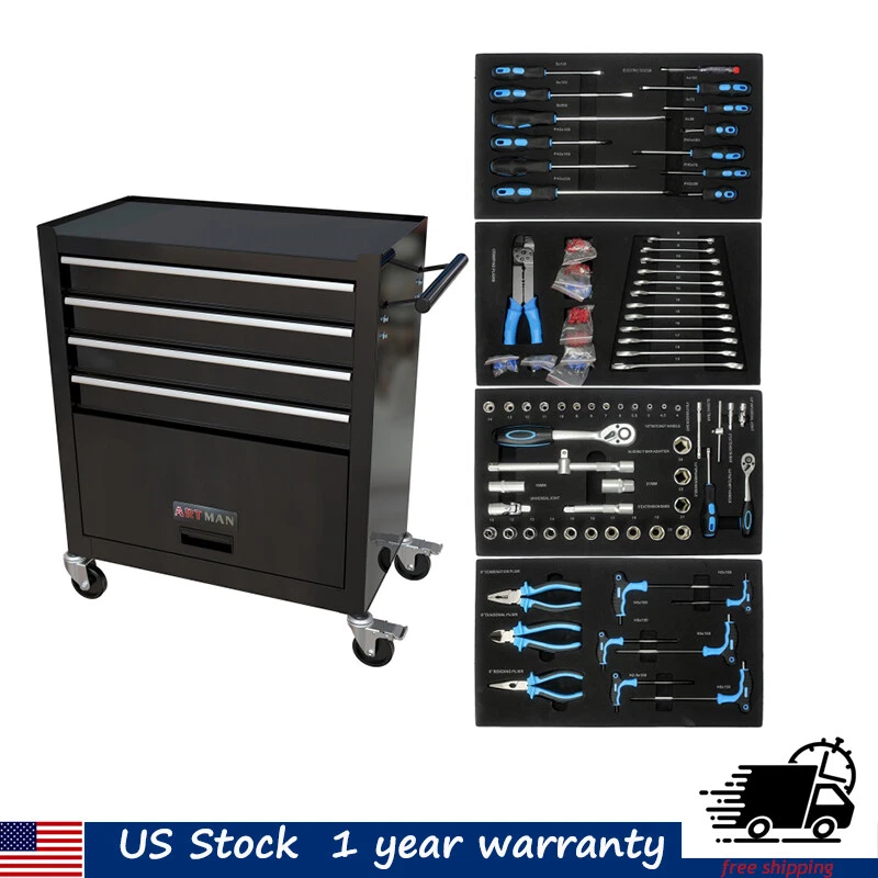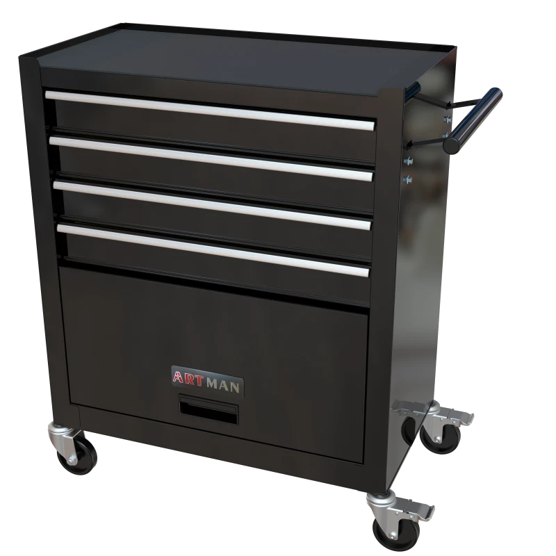 Product Features The metal storage cabinet comes with four wheels, two of which have parking brakes, so you can move the cabinet around freely or park in one place. The opening and closing of the drawers of the tool cabinet is very gentle thanks to the ball-bearing drawers. The storage surface provides additional space for storing and arranging tools you often need. The robust and powder-coated steel construction is used for high wear resistance. Description One Side with Pull Handle This product comes with a handle on one side, which not only helps to push and pull it more, but allows you to move it more freely 4 Drawers with Wheels Drawers can easily accommodate needed items such as folders, notebooks, tools, etc. 2PCS with Brake and 2PCS without Brake With swivel casters could maneuver easily around work area. The wheels have locking mechanisms to prevent the tool cabinet from moving around on its own while in use. Tool Set Four drawers with assorted tool sets Product Information Product Name 4 Drawers Tool Cabinet with Tool Sets Material Cold Rolled Steel Surface Finish Powder Coating Casters 4" Casters (2PCS with brake and 2PCS without brake) Size 24.25*13*29.33 Package Size 28.86*27*15.18 Color Black Net Weight 19KG Gross Weight 21KG