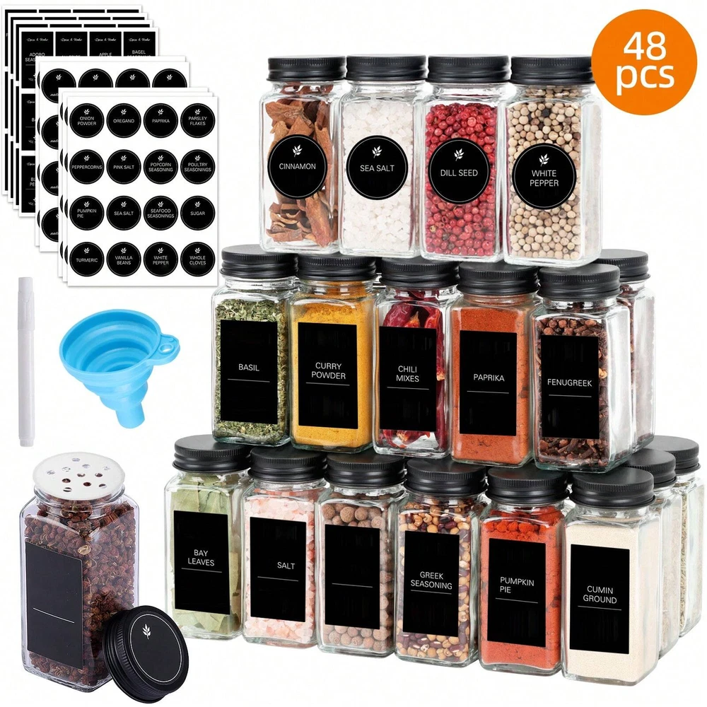 24/48pcs Spice Jars, 4oz Glass Spice Jars With Labels - Shaker Lids, Collapsible Funnel And Brush, Seasoning Bottles For Spice Rack Drawer Cabinet