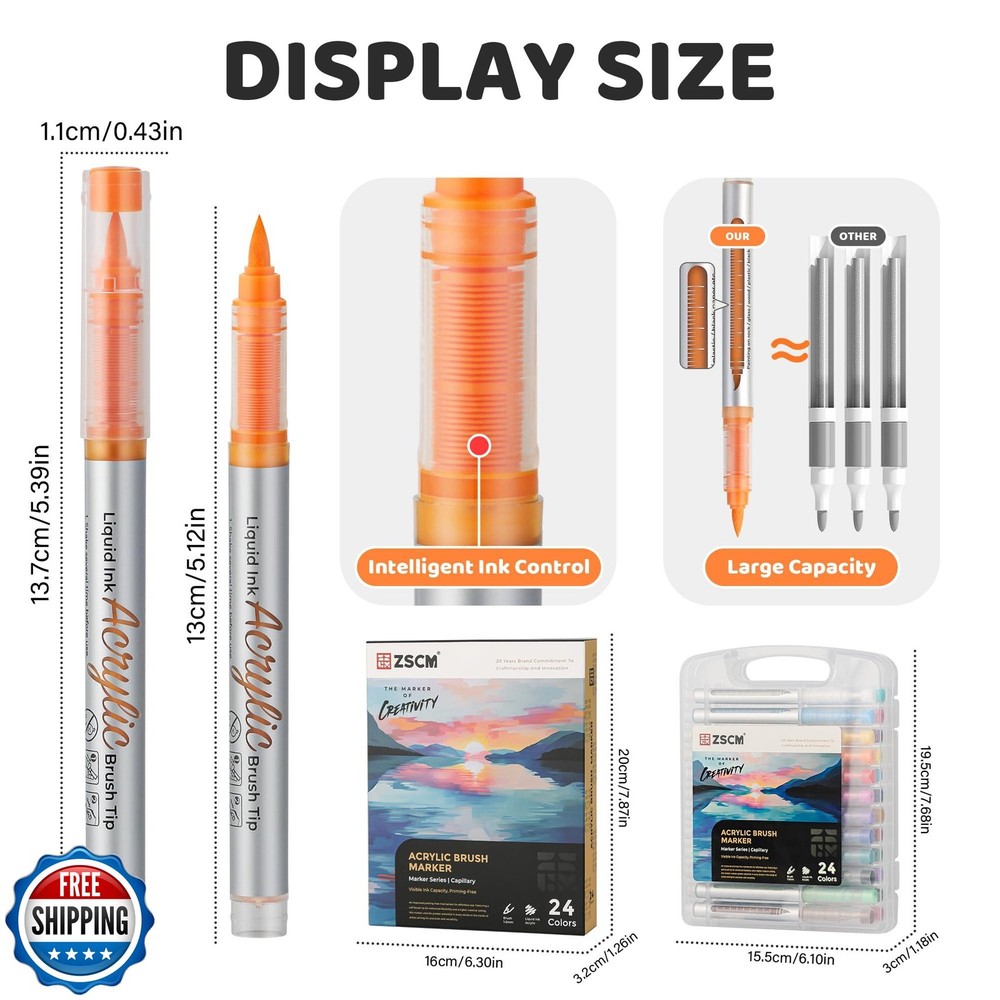 Direct Liquid Acrylic Paint Markers, 24 Colors Brush Tip Permanent Acrylic Paint Kit, Water-Based Free-Ink System Art Marker, for Adults Card Making, Rocks Painting, Wood Slices, Christmas Supplies Features Direct Liquid design -ZSCM new generation acrylic markers can be used directly, which is very convenient, and has higher pigmented acrylic ink. Our acrylic paint pen is designed with a transparent barrel, showing your remaining ink. The lasting and fast drying is to produce a very permanent opaque effect on almost all surfaces, high coverage. You can even mix color. The ideal choice for indoor and outdoor use. Excellent Ink Control System - ZSCM Direct Liquid Acrylic Market uses a new generation of intelligent ink control system to make the ink flow more smoothly. Part of the design of the upper ink control system can prevent ink break and ink, and the lower part of the design eliminates the vacuum of the pen tube. The new generation of acrylic marks is worthy of anyone! Halloween Carnival -Let's turn into a master of art together. How about turning those pumpkin into cute and horrible art? Use your superb painting skills to decorate our pumpkin lights and walls, and enjoy this fun holiday time together Non-Toxic and Safe - PERFECT DIY ART CRAFTS - Strictly quality-tested and conforming to ASTM D-4236, Not only environmental friendly, but also vivid and quick-dry, Suitable for creating DIY projects on a variety of surfaces like porcelain, ceramic, glass, treated wood, leather, canvas, fabric, metal, to plastic. SERVICE PROMISE:Customer is our top priority. Please keep caps tight after every use. If you are not satisfied for any reason, please let us know and we will respond to you within 24 hours. Shipping Free & Fast Shipping: We offer free shipping to most of the USA with a normal delivery time of 3-7 days. However, due to the current situation, additional delivery time (up to 3 weeks) may be required for some items. Alternative Carriers: We may use alternative carriers (e.g., USPS, FedEx, UPS) to ensure your package arrives safely and on time. Due to the use of multiple carriers, we are unable to provide a tracking number automatically. Handling Time: Orders are processed and shipped within 1-2 business days of receiving cleared payment. Shipping Restrictions: Shipping to Alaska, Hawaii, Puerto Rico, Guam, and other US territories may incur shipping charges or delivery restrictions. Please contact us before ordering, or your order can be refunded/cancelled. State Restrictions: Certain items may not be shipped to California due to state regulations. Contact for Tracking Updates: If you require tracking updates or have any concerns about the delivery of your order, please feel free to contact us, and we will be happy to assist you. Return Policy 30-Day Hassle-Free Returns: If you are not completely satisfied with your purchase, you can return the item for free within 30 days of receiving it for a full refund or exchange. Easy Return Process: Contact us, and we will provide you with a prepaid return shipping label and detailed instructions. No Restocking Fee: There are no restocking fees for returns. However, the buyer is responsible for return shipping costs if the return is not due to a seller"s error. Refund Processing: Refunds will be processed within 1 business day of receiving the returned item in its original condition. Feedback Your feedback is extremely important to us. We strive to provide the best products and customer service possible. If you are satisfied with your purchase, please take a moment to leave us a positive review. If you have any concerns or issues with your order, please contact us before leaving negative feedback. We are committed to resolving any problems and ensuring your satisfaction. Contact Us If you have any questions or concerns, please feel free to reach out to our customer support team. You can contact us through the eBay messaging system. We are available Monday to Friday, 9:00 am to 5:00 pm EST, and we will do our best to respond to your inquiry within 24 hours. Thank you for supporting our small family business!