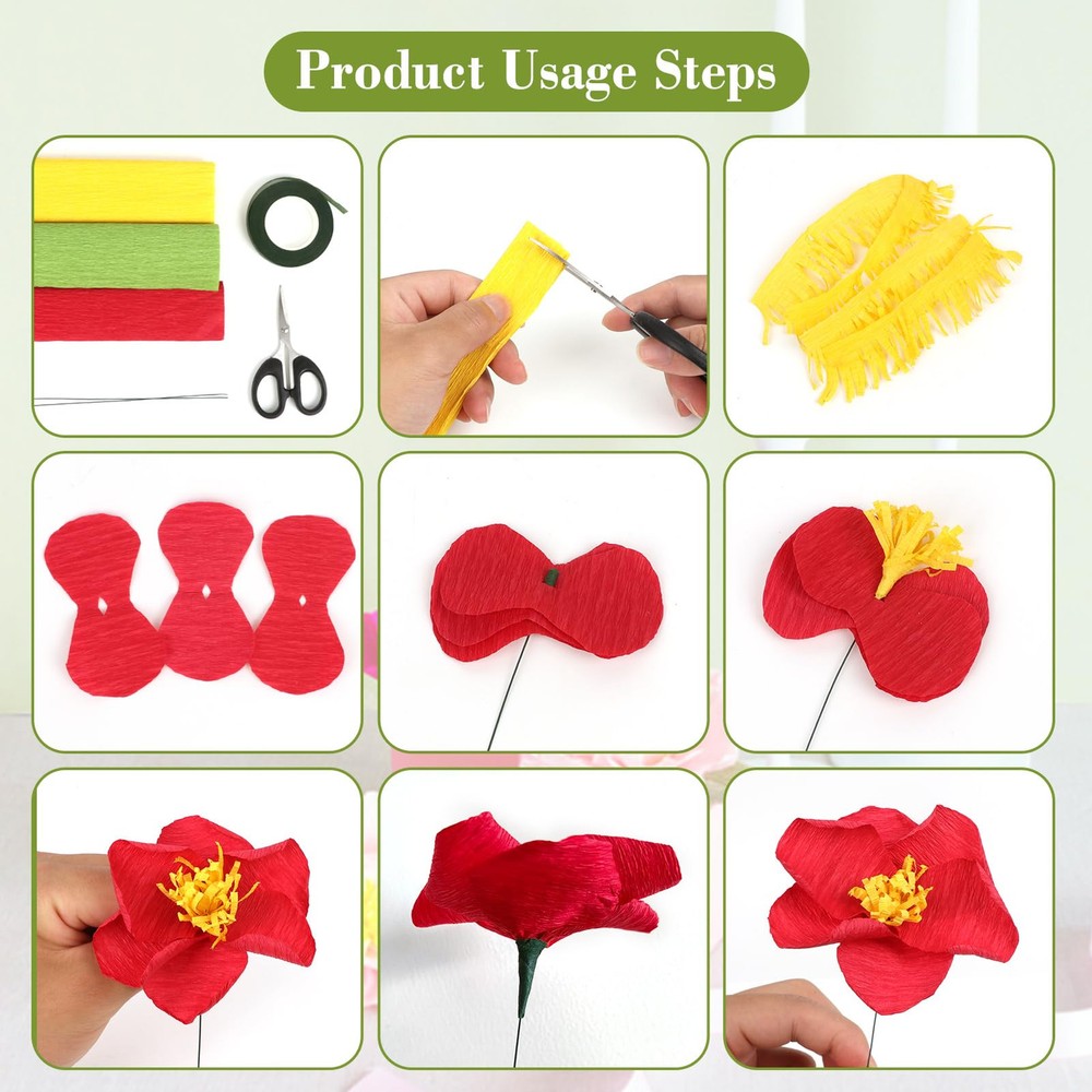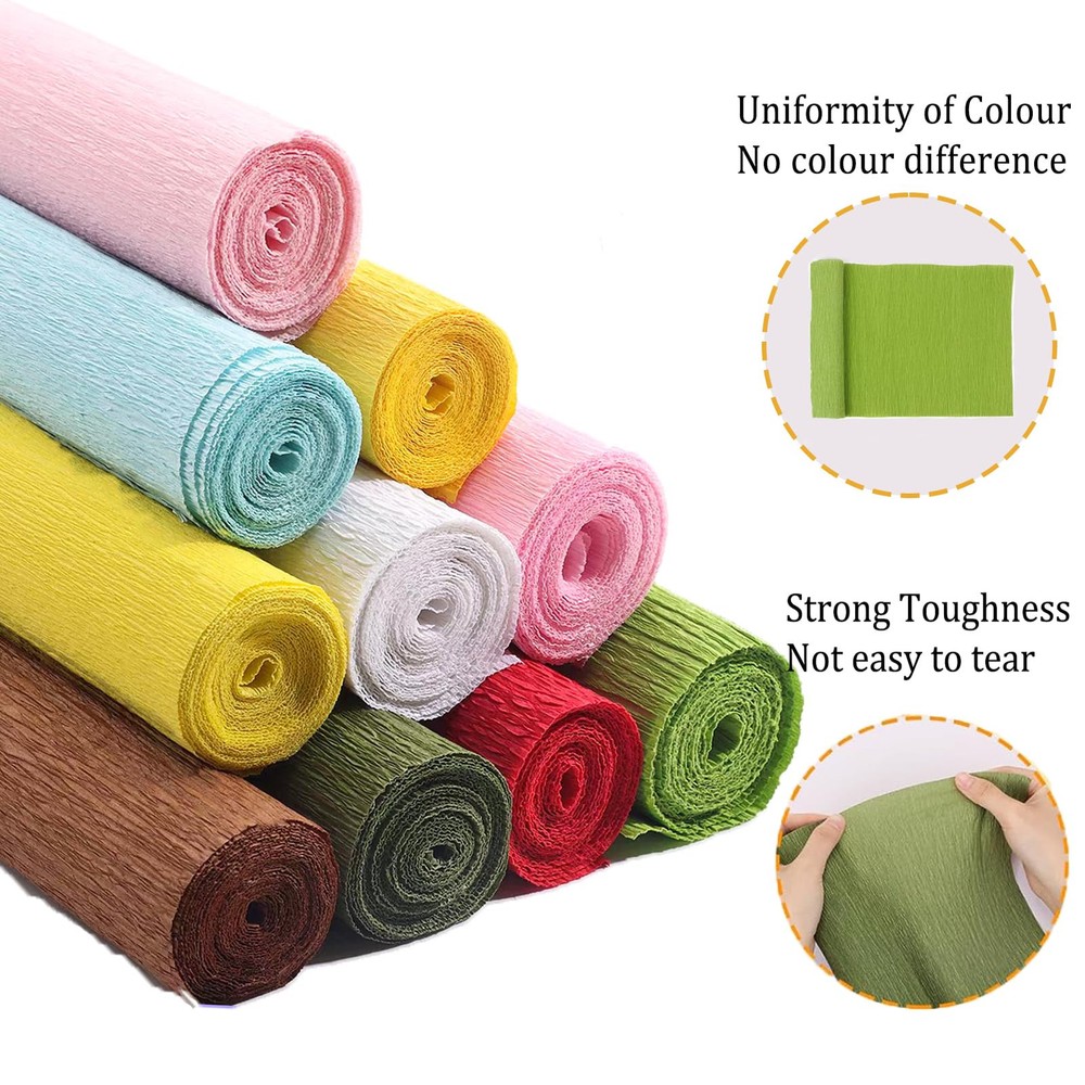 Our 24 color crepe paper is colorful, colorless, clear and tough, comes with scissors, floral tape, double sided tape, wire and other accessories, perfect for handmade origami flowers and other DIY crafts. 24 COLORS CREPE PAPER: You will receive 24 rolls of crepe paper rolls in 24 different colors, each 10 x 98 Inch 100 pieces of floral wire stems and 1 roll of green floral tape. There's also a pair of scissors and a roll of double-sided tape perfect combination matching is enough to meet your various decoration needs, so you can share them with friends and have a great time HIGH QUALITY MATERIAL: Our crepe paper is made of high quality paper pulp, not easy to wrinkle; fade and break; the green wire is soft and flexible, can be easily bent into various shapes INTERESTING DIY: You can share the colorful crepe paper sheets with your children; friends; family; or anyone who likes handicrafts, work on handicraft projects with your family and friends, establish warm relationships, and friendships, and help alleviate stress VIBRANT COLORS: We offer 24-color crepe paper rolls for you to use, and these colored papers can create long-lasting and beautiful bouquets WIDELY USED: Our crepe paper is suitable for various occasions, such as weddings; birthday parties; singles parties; anniversaries; and other important occasions; so you can use it to decorate the place you need