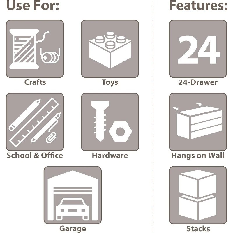 Metal Storage Cabinet with Doors and Shelves 5 Tier Metal Pantry Closet Cupboard 168.97 USD Free shipping 118" Wide Baby Gate Metal Safety Playpen Fireplace Fence for Toddler/Pet/Dog 122.17 USD Free shipping Ergonomic Gaming Recliner Adjustable Footrest PU Leather Comfortable Sofa Chair 220.96 USD Free shipping 10 Gallon Glass Aquarium Starter Kit LED Lighting Filtration System Fish Tank US 65.54 USD 69.72 USD Free shipping 6% off Ergonomic Gaming Chair w/ Footrest Reclining Video Game High Back Computer Chair 142.97 USD Free shipping Outdoor Storage Shed Galvanized Steel Tool Storage Water Resistant Lockable Door 122.19 USD 129.99 USD Free shipping 6% off 150 Piece Tool Set General Household Hand Home Repair DIY Project Maintenance 62.03 USD 65.99 USD Free shipping 6% off Mallard Floaters Decoy 12 Pack Rugged One-piece Design 73.32 USD 78.0 USD Free shipping 6% off Pink Cute Kawaii Gaming Chair for Girl Ergonomic Desk Racing Office Adjustable 135.82 USD Free shipping TV Stand for 65 Inch TV Entertainment Center with Storage Cabinets Console Table 158.85 USD 168.99 USD Free shipping 6% off Portable Training Kit for 9mm Dry Fire Laser Training System for Target Practice 121.72 USD 129.49 USD Free shipping 6% off Mini Fridge with Freezer 2.9 Cu.Ft Fridge Energy Saving Adjustable Thermostat 189.79 USD Free shipping About this item HEAVY DUTY CABINET WITH 24 DRAWERS: The 24-drawer small storage cabinet is made in the U.S.A. from rugged, high-impact plastic and measures 20" W x 6" D x 16" H; Organizer drawers - 6" x 4-1/2" x 2-3/16" GARAGE ORGANIZATION: The small parts organizer is great for garages and workshops for both homeowners and businesses; The plastic storage drawers can be used as tool box, screw organizer or for battery storage; Keep nails and other small parts accessible CLASSROOM ESSENTIALS: Teachers can use the stackable storage drawers for classroom organization; Use it as a teacher toolbox, art supply storage organizer, craft storage cabinet for scrapbook supplies, and more HOME STORAGE AND ORGANIZATION: This plastic storage cabinet offers many uses around the home; It can be a lego storage organizer, craft organizer, or sticker organizer; Use it for makeup storage and organization or for medicine and first aid supplies FEATURES: Stack cabinets securely or use keyhole slots to mount for wall storage; Finger-grip drawer pulls provide easy access; Rear stop tabs prevent contents from spilling; Drawer dividers are included and molded into the back of the cabinet Adult Oversized Mesh Camp Chair W/ Cooler Universal Sporting Camping Picnic New 33.72 USD Free shipping 1 Gallon Exterior Deck Resurfacer and Primer with Sealant Snowflake 49.91 USD Free shipping 22-Gauge 3/8 in. Pneumatic Upholstery Stapler Staple Guns Extended Nose NEW 50.04 USD Free shipping Foldable Flexi-Step Pet Steps w/ 4-Step Design and Non-Slip Treads Dog Ramps NEW 52.61 USD Free shipping Workshops Garages12-Inch 300-Pound Capacity Furniture Moving Tri-Dolly Set 33.16 USD Free shipping Mega Smart Cat Cove Enclosed Litterbox Pets Bathroom Laundry Room Durable New 49.37 USD Free shipping 18 inch 2 Claw Log Lifting Tongs Heavy Duty Steel Lumber Skidding Tongs 772 lbs 44.21 USD Free shipping 20" Indoor Rustic Metal Arabic Wall Clock Moving Analog Industrial Steampunk New 44.47 USD Free shipping PVC / Rubber Hybrid Air Hose Industrial Fitting Universal Connect Coupler Tools 27.41 USD Free shipping 31"H Extra-Wide Walk Through Metal Dog Pet Gate, with Additional Small Door 53.96 USD Free shipping Slipcover Furniture Protector Great Pets Children Sofa Stain Resistant Comfort 35.46 USD Free shipping Task Chair with Adjustable Height & Swivel 225 lb. Capacity Office Chairs 2024 51.85 USD Free shipping