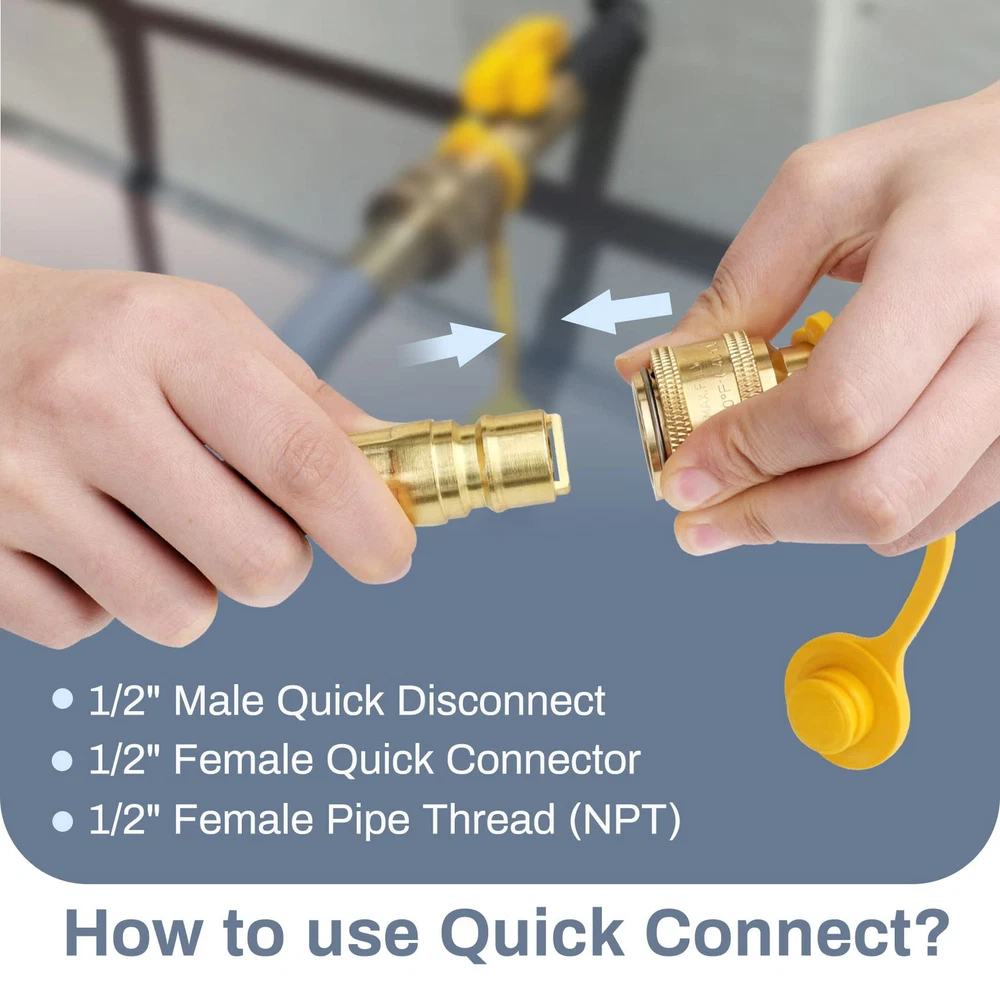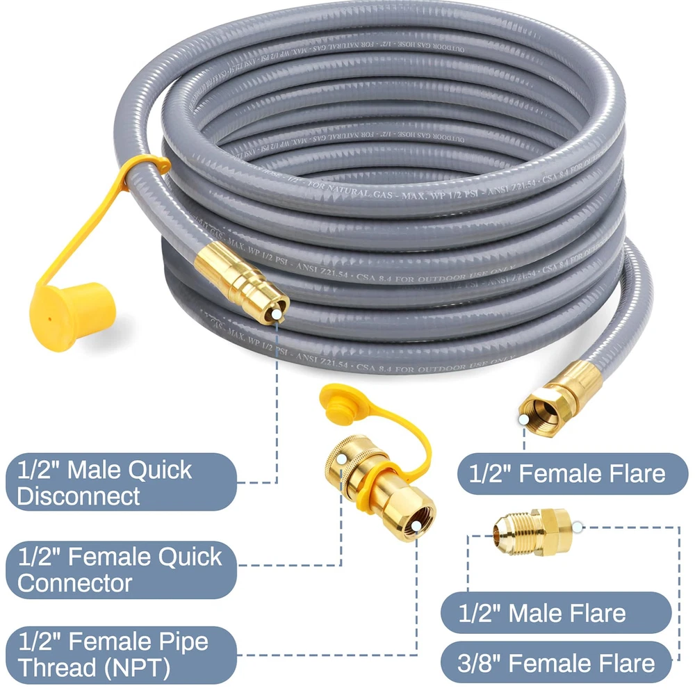 Specifications —— ①24 feet 1/2“ natural gas hose (1/2” male quick connect x 1/2“ Female Flare), ②1/2” quick connect adaper (1/2“ female NPT x 1/2” female quick connect). ③1/2 Male Flare to 3/8 Female Flare Adapter, ④3/8 Male Flare to 1/2 Male NPT Adapter. Used For Natural Gas Appliances —— Max BTU: 100000 btu/H. The 1/2 quick connect natural gas hose is used for portable generators, Weber Genesis E-435, 38400001 Genesis S-435, Summit E-470, S-670, and 7270001 Summit S-470. By using the 3/8“ female x 1/2” male flare adapter,Also for Weber Spirit S-315, E-310, Spirit II E-310, Genesis S-325S, EX-325S, E-325S, E-335, S-335, Smart SX-325S, Smart EX-335, SX-335, EPX-335, SPX-435 and Weber 57067001 Q3200. It is also suitable for , patio heaters, fireplaces, pizza ovens and many other gas appliances. Safe and High Quality —— 1/2 quick disconnect gas hose is made of natural rubber on the outer layer and flexible stainless steel structure on the inner layer, which has excellent weather resistance, crack resistance and rust resistance, etc., durable. CSA Certified —— 1/2 natural gas line hose is CSA certified for better safety, the material used is 100% high quality brass to provide good air tightness for connection, you can rest assured of use. Warm Tips—— Before purchasing, please measure the distance between the gas equipment and the gas source, and reserve space for moving the equipment to ensure that the purchase size meets your needs. After installation, please be sure to use soapy water to test for leaks to prevent accidents.