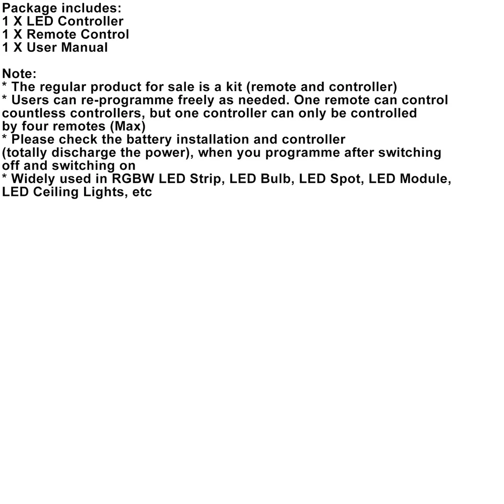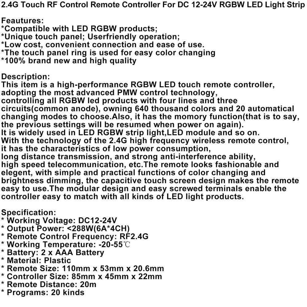 Product Description 2.4G Touch RF Control Remote Controller For DC 12-24V RGBW LED Light Strip UE U4 2.4G Touch RF Control Remote Controller For DC 12-24V RGBW LED Light Strip Feautures: *Compatible with LED RGBW products; *Unique touch panel; Userfriendly operation; *Low cost, convenient connection and ease of use. *The touch panel ring is used for easy color changing *100% brand new and high quality Description: This item is a high-performance RGBW LED touch remote controller, adopting the most advanced PMW control technology, controlling all RGBW led products with four lines and three circuits(common anode), owning 640 thousand colors and 20 automatical changing modes to choose.Also, it has the momory function(that is to say, the previous settings will be resumed when power on again). It is widely used in LED RGBW strip light,LED module and so on.With the technology of the 2.4G high frequency wireless remote control, it has the characteristics of low power consumption, long distance transmission, and strong anti-interference ability, high speed telecommunication, etc.The remote looks fashionable and elegent, with simple and practical functions of color changing and brightness dimming, the capacitive touch screen design makes the remote easy to use.The modular design and easy screwed terminals enable the controller easy to match with all kinds of LED light products. Specification: * Working Voltage: DC12-24V * Output Power: <288W(6A*4CH) * Remote Control Frequency: RF2.4G * Working Temperature: -20-55℃ * Battery: 2 x AAA Battery * Material: Plastic * Remote Size: 110mm x 53mm x 20.6mm * Controller Size: 85mm x 45mm x 22mm * Remote Distance: 20m * Programs: 20 kinds Package includes: 1 X LED Controller 1 X Remote Control 1 X User Manual Note: * The regular product for sale is a kit (remote and controller) * Users can re-programme freely as needed. One remote can control countless controllers, but one controller can only be controlled by four remotes (Max) * Please check the battery installation and controller(totally discharge the power), when you programme after switching off and switching on * Widely used in RGBW LED Strip, LED Bulb, LED Spot, LED Module, LED Ceiling Lights, etc About Us Bruce & Shark is a company Focus on Motorcycle parts more than 11 years. The design inspiration comes from the awe of the vast sea and worship of the fighting sharks, therefore Bruce & Shark takes a shark as brand logo. Since its inception, we have always put the "customer first" and "top quality" as our principle. We specialized in selling Motorcycle parts and providing customers with various types of high-quality products. Our brand Bruce & Shark has enjoyed good reputation in America, Europe, Japan, Canada and Africa, covering more than 30 countries. Our vision is to deliver high-quality Motorcycle parts products and sincere services to the world. Our main products are motorcycle mounted, fuel pump, stator, windshield, Seat Cover, motorcycle fairing. Welcome to our shop to choose products that are worth more for your Motorcycle! Please Add me to your list of favorite sellers and visit often. Thank you for your business. Shipping United States Buyers Parcel will send via USPS or UPS or FedEx from our United States Warehouse. Shipping Time Usually parcel will be delivered 2-7 working days include handling time. Sometimes shipping time may has a little delay, such as Bad weather, Holidays. Terms We stand behind everything that we sell and will do everything possible to assure you are satisfied. When you receive your purchase if you are not 100% satisfied, please sent me ebay message and we will do our best to make you happy. If you still want to return your purchase, simply ship the item(s) back to us and we will refund your original purchase price and the original shipping charge. Buyers are responsible for the postal cost of returning the items. We must be notified of the intent to return your item within 30 days of receiving the item. Items returned must be in the same condition that they were received. How to return 1,Please ask us for return address . 2,Shipping back the package . The RMA#(Return Merchant Authorization Number = Your ebay ID) must be clearly written on the return package ,Otherwise the package will be refused. 3,Sent us the return tracking number. 4,All returns will be inspected prior to a credit being issued. Contact Us Send us ebay message in English If you have any questions, our Customer Service staffs welcome you to sent me ebay message. We strive to answer all questions and resolve any problems as quickly as possible. Business Hours: HongKong Time GMT+8:00 Monday-Saturday 9:00-17:00 WaterProof 24V to 12V 5A 60W Step Down DC/DC Power Converter Regulator U4 13.65 USD Free shipping Archery 20mm Copper Thumb Ring Finger Guard Protector Gear Bow Hunting U4 19.65 USD Free shipping 10000W SCR Digital Voltage Regulator Speed Control Dimmer Thermostat AC 220V U4 23.65 USD Free shipping 4 PCS 10W Uhf 400-470MHz Car Radio Short Rubber Antenna PL259 Male Connector U4 20.65 USD Free shipping 10PC Pneumatic Air Quick Push to Connect Fitting 1/4" OD "T" Tee Tube 6mm NEW U 10.65 USD Free shipping 5mm Urethral Stretching Penis Dilator Hollow Plug For Male Stimulate US U4 9.07 USD 9.65 USD Free shipping 6% off Copyright © Bruce&Shark All rights reserved