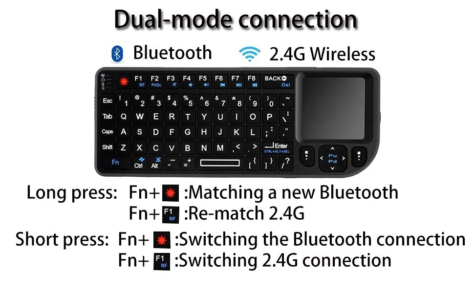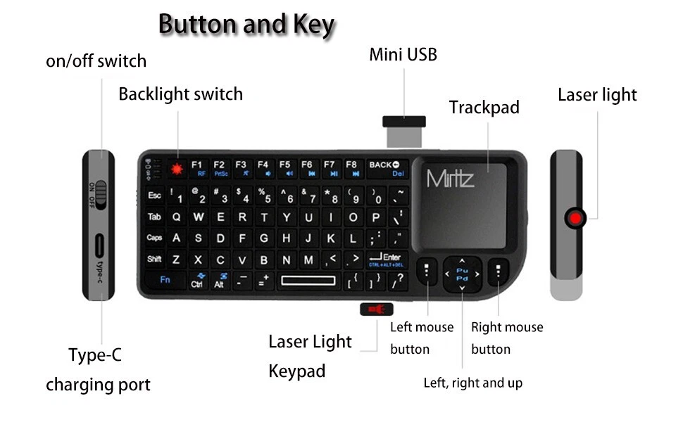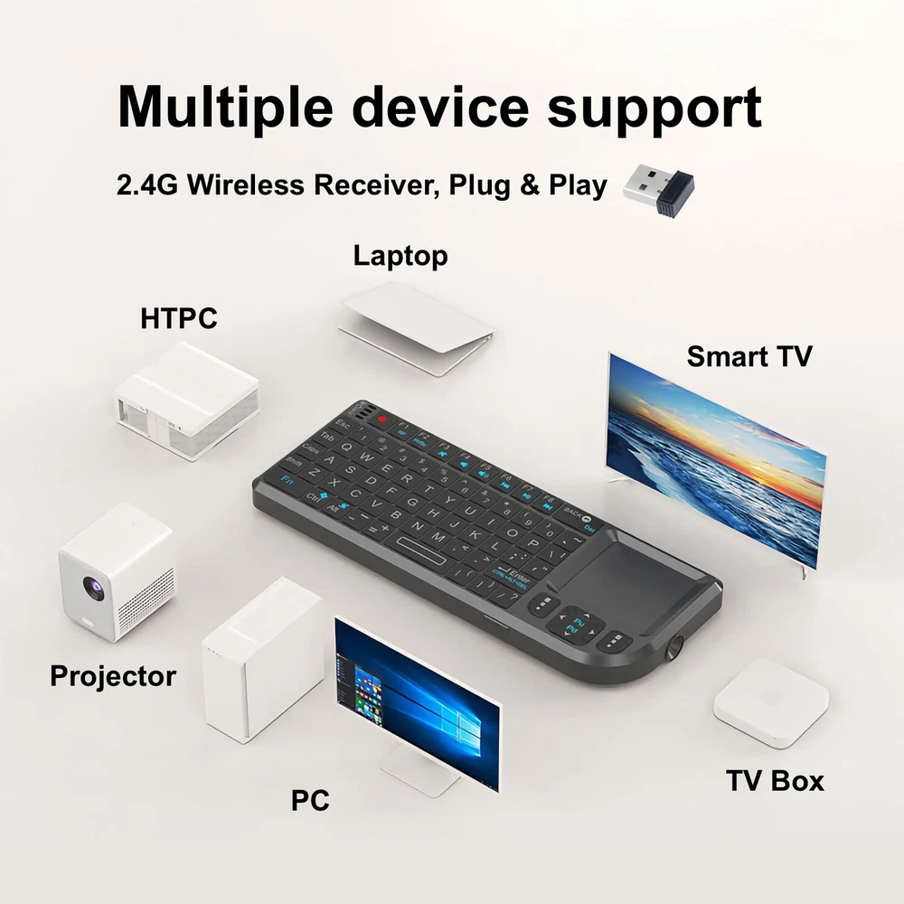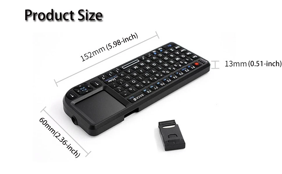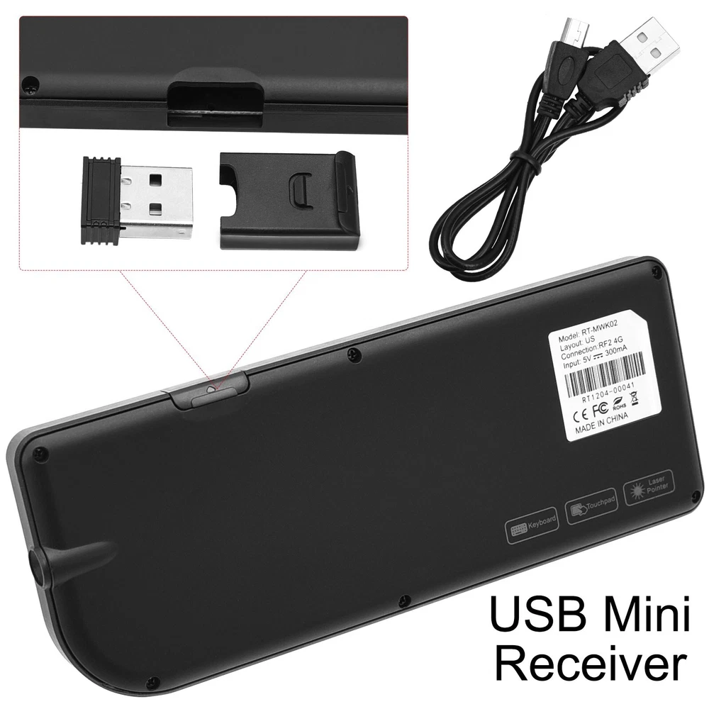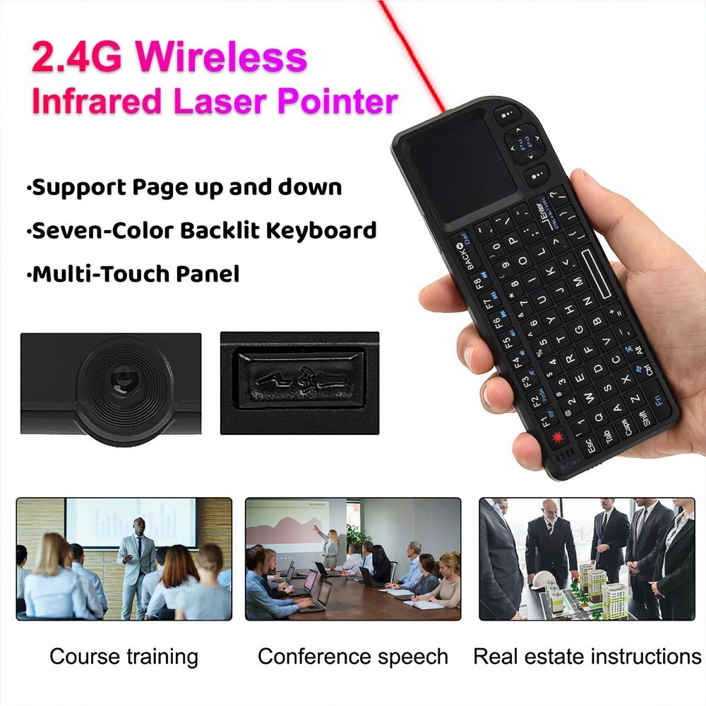 Product Parameter Product Name: Wireless Keyboard Touchpad Laser Pointer Operating distance: 10 meters Connection mode: 2.4GHz Wireless/Bluetooth Weight: 105 g Charging Interface Type: USB Type-C Female Receiver interface Type: USB-A Male Supported Devices Tablets, Laptops, PC,Smart TV,Projector,TV Box About After Sales 1.All products in our store have free shipping ! 2.All orders will be shipped 1-2 business days local time. 3.We offer a 45 day return on all products purchased in our store. 4.Please verify your address at checkout. We are not responsible for any incorrect or undeliverable addresses. 5.If you have any questions, please feel free to contact us and we will be sure to respond within 8 hours . 6.Our products are carefully inspected before they are sent out, if you find any problems with the products you receive, please contact us in time , we will immediately arrange to resend them and give our customers some compensation.
