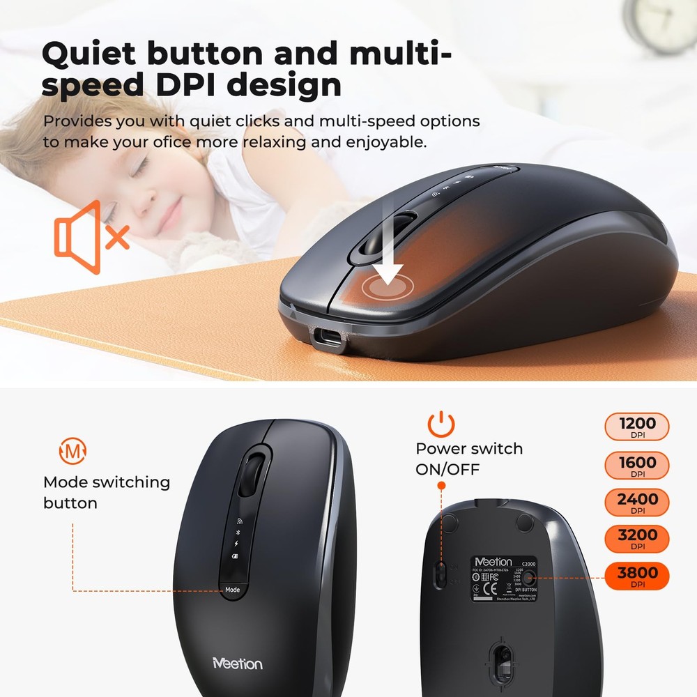 【VERSATILE USAGE】 Perfect for office work, home office setups, and various computing needs, our combo works seamlessly with computers, laptops, Macs, and more. Enjoy efficient and comfortable typing and navigation across multiple devices. 【Elegant and Practical】The C2000 keyboard features a simple three-zone layout, adding a touch of elegance to your workspace. The quick-access smiley face key lets you easily insert emojis for more fun. It works with both Windows and Mac, and the FN+Q/W switching makes it easy to move between your PC, laptop, tablet, and phone. (Please note that this keyboard is not backlit) 【Easy Connection Anytime, Anywhere】The C2000 keyboard and mouse set supports both USB wireless and Bluetooth connections. Both the keyboard and mouse have mode-switching keys, allowing you to switch between devices effortlessly. Whether your device has a USB port or not, the C2000 keeps you connected and ready to work. 【Quiet and Precise】The C2000 mouse is designed to be silent and features five DPI settings (1200/1600/2400/3200/3800) to suit different screen resolutions and environments. Whether at home, in the office, or on the go, you’ll enjoy smooth and precise cursor control for better productivity. 【Long-Lasting Power】No more frequent charging interruptions. The C2000 keyboard and mouse are USB-C rechargeable, giving you up to 300 hours of keyboard use and 150 hours of mouse use with just a 2-hour charge, so you can stay powered up throughout the day. 【Comfortable Design】The C2000 keyboard is built with comfort in mind. Dual kickstands offer two adjustable angles (4° and 7°) so you can find the best typing position. Enjoy a more ergonomic setup that reduces strain and supports better posture during long typing sessions. 【Boost Productivity with Special Keys】Increase your efficiency with the C2000’s dedicated Copilot key for instant access to AI tools that help you work faster. The smiley face key also makes inserting emojis simple, adding a personal touch to your messages.