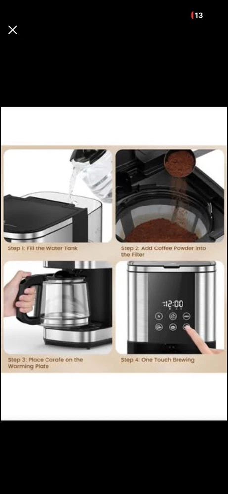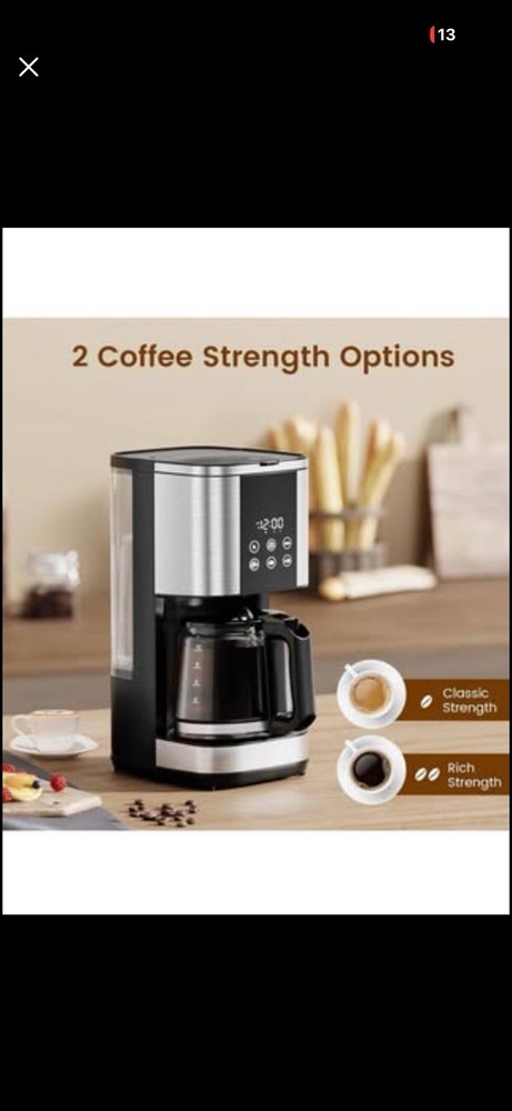 Electactic 10-Cup Drip Coffee Maker, 24-Hour Programmable, Touch Screen, 2 Strength Levels, Reusable Filter, 55oz, Black