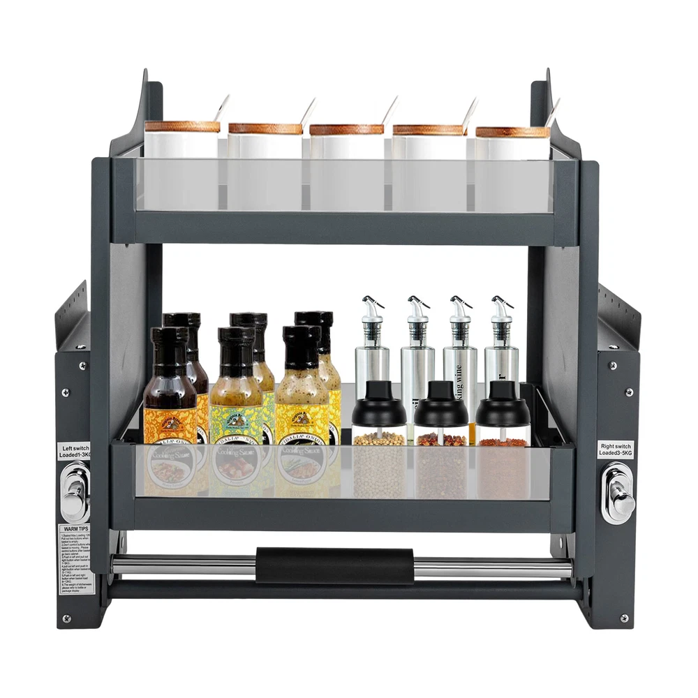 Specifications Model: 600Frame Color: Black Style: ‎Modern, Pull-out Shape: ‎Rectangular Room Type: ‎Kitchen Shelf Type: Sliding Shelf Age Range: Adult Mounting Type: Wall Mount Material: Tempered Glass, Aluminum Alloy, Steel Process: Cutting, Nano Coating, Plastic Spraying Special Feature: Damping Hydraulic Rod Applicable Cabinet: Width: 60cm/24inch; Depth: ≥27cm/10.6inch; Height: ≥56cm/22.04inch; Load-bearing Capacity: ≥20kg/44 lbs Three-gear Adjustment: 1-5kg/2.2-11.02 lbs, 5-7kg/11.02-15.4 lbs, 6-12kg/13.22-26.4 lbs Max. Load-bearing Capacity: 12kg/26.4 lbs Right Switch Loaded: 3-5kg/ 6.6-11.02 lbs Left Switch Loaded: 1-3kg/2.2-6.6 lbs Minimum Distance from Cabinet: 5.5cm/2.16inch Double-lever Lever Thickness: 5.5cm/2.16inch 2-Tire 24" Pull Down Shelf Upper Kitchen Wall Cabinet Storage Organizer Cabinet Description Installing a 2-tier pull-down shelf in your cabinet can effectively make full use of your upper cabinets and keep your kitchen tidy, bringing a comfortable cooking environment to you. Our shelf, adopting an advanced pneumatic damper system with a sturdy structure, is a space saver, stylish decor, and a good helper that helps you to get items to higher places with less effort. Key Features Build to Last: This pull-down cabinet shelf mainly adopts tempered glass and aluminum alloy with cutting and nano-coating processes, making it anti-rust , crush-resistant , and high-strength. Smooth Pulling: Advanced pneumatic damper system with strong tension spring ensures easy pull-down and stable push-back even for teenagers and elderly people. You can press the adjusting button inwards and lock/unlock it clockwise/counterclockwise to strengthen/reset the pull-down resistance , thus balancing resistance to prevent falling too fast. Adjustable Bearing: The three-gear assistance adjustment(2.2-11.02 lbs, 11.02-15.4 lbs,13.22-26.4 lbs) through the adjusting button on the right and left sides can meet your different storage needs. Considerate Design: The 1.96" thick wall brackets are thick enough to elude face-frame stile and most types of hinges. Its pull-down design also makes this shelf support suspended installation, sliding doors, upward sliding doors, and double doors. Space-saving: The 2-tier design with each layer 22.2*10.63 inches in size is conducive to making full use of your upper cabinets, offering more space for your kitchen, and avoiding space waste. Sturdy Construction : The 2.16" thickened double-lever levers, 1.96" thick wall brackets, 0.23" thick layer plates, and plastic sprayed steel side plates, along with firm fixing with screws, ensure sturdy construction and strong load-bearing capacity. Stylish Appearance: The rectangular shelf with a curved streamline design and versatile black color, along with the strip pattern that increases its texture, gives this shelf a stylish and modern appearance that fits any room decor. Ready to Use&Install : With the simple structure and an English manual, you can install and use this pull-down cabinet shelf directly without tedious assembly, saving you labor and time. Easy to Clean: Because of the smooth surface with nano-coating treatment, you can wipe the dirt from this shelf with a wet cloth. Protective Package: To prevent the product from being damaged and bumped during transportation, we packed it with foam to protect your products to the maximum extent possible. Buy with Confidence: We have been working hard to provide better service and quality for our customers, which is our goal. If there is any problem with our products, please contact us in time. Details Non-slip Handle: The humanized handle with a silicone wrap gives you a comfortable grip and ensures easy pull-down of this shelf without slipping. Heightened Guardrail: The heightened visual guardrail(3.15") allows for a clear view of the items, makes it convenient to access, and prevents the items from falling off. Round Edge: The burr-free and round edge adds beauty to this shelf and prevents items/your hands from scratching. Application It can be used as a dish rack, spice rack, and food storage rack in kitchen/bar/cafe cabinets, pantries, closets, and other upper cabinets to store snacks, bowls, plates, spices, spice bottles, and other kitchen items. It is made for a cabinet of inner width≥23.6''. The size of the fully installed system is 23.6''W x 10.6'' D x 22.04''H. And the load-bearing capacity of the cabinet should be more than 44 lbs. Specifications Model: 600Frame Color: Black Style: ‎ Modern, Pull-out Shape: ‎Rectangular Room Type: ‎Kitchen Shelf Type: Sliding Shelf Age Range: Adult Mounting Type: Wall Mount Material: Tempered Glass, Aluminum Alloy, Steel Process: Cutting, Nano Coating, Plastic Spraying Special Feature: Damping Hydraulic Rod Applicable Cabinet: Width: 60cm/24inch; Depth: ≥27cm/10.6inch; Height: ≥56cm/22.04inch; Load-bearing Capacity : ≥20kg/44 lbs Three-gear Adjustment: 1-5kg/2.2-11.02 lbs, 5-7kg/11.02-15.4 lbs, 6-12kg/13.22-26.4 lbs Max. Load-bearing Capacity: 12kg/26.4 lbs Right Switch Loaded: 3-5kg/ 6.6-11.02 lbs Left Switch Loaded: 1-3kg/2.2-6.6 lbs Minimum Distance from Cabinet : 5.5cm/2.16inch Double-lever Lever Thickness: 5.5cm/2.16inch Layer Plate Thickness: 6mm/0.23inch Side Plate Thickness: About 1.3mm/0.05inch Guardrail Height: 8cm/3.15inch Wall Bracket Thickness: 5cm/1.96inch Wall Bracket Size(W*H): 21*30.5cm/8.27*12inch Interlayer Spacing: 27cm/10.63inch Product Size: 56.4*27*55cm/22.2*10.63*21.65inch Package Size: 57*57*28cm/22.44*22.44*11.02inch Net Weight: 13kg/28.66 lbs Gross Weight: 15kg/33 lbs Package Included 1* Pull-down Cabinet Shelf 1* English Instruction Notes Please make sure that your cabinet size is suitable before purchasing. Please check the parts and read the instruction carefully before mounting. The maximum load-bearing capacity of the basket is 26.4 lbs. Please pull out the buttons when the basket is empty. Pull in the left and pull out the right button when the basket loads 1-5kg/2.2-