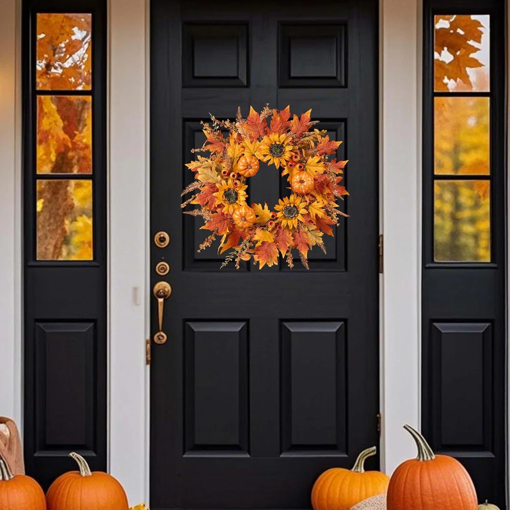 24-Inch Fall Wreath for Front Door with Pumpkins Sunflowers and Maple Leaves