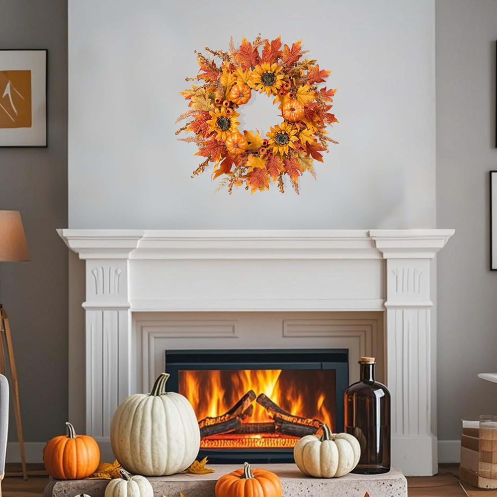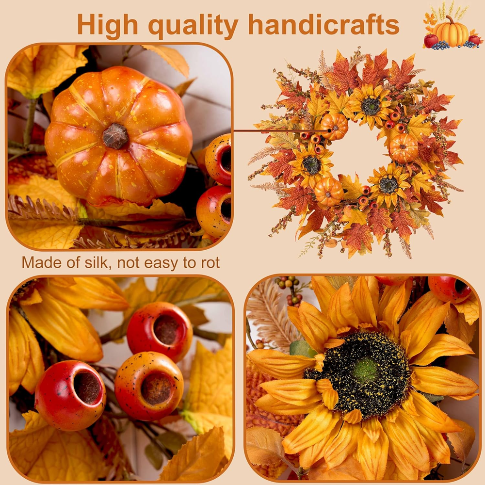 Full of autumn atmosphere: This fall wreaths for front door uses warm orange tones and is decorated with large pumpkins, sunflowers, maple leaves, various autumn leaves and berries, etc., adding bright autumn colors and natural atmosphere to your home. Suitable size: The fall door wreath is about 24 inches long when fluffed. For convenient transportation, packed in a sturdy box approximately 14 inches in size. You only need to adjust the autumn wreath to the best shape according to the instructions in the box to get a complete wreath. Wide range of uses: Hang the fall wreath above the fireplace, door, living room wall, window, porch and farmhouse decoration. Add more fall color to your seasonal celebrations and Thanksgiving. This fall door wreaths is the best gift for Halloween, Harvest Festival,Thanksgiving, and thanking relatives and friends. Easy to maintain: This sunflower pumpkin wreath is easy to clean, just wipe it with a clean towel to make the wreath look brand new. Pumpkins and leaves are not easy to fall off. Comes with a sturdy storage box for your convenience to store until next autumn. Quality service: The maple leaf wreath is purely handmade, and it is normal for petals or leaves to fall off, which will not affect the overall beauty of the wreath. If you have any questions, please feel free to contact us, we will respond in time and give you a satisfactory answer. Product Description