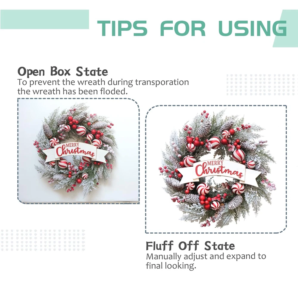 A delicate Christmas wreath adorned with realistic snow-covered pine needles and long pine cones, bright candy and spherical decorations. Suitable for indoor or outdoor Christmas decoration, hang this wreath on any door, window, or entrance, or as the centerpiece for holiday parties and other events, it can also be used all year round. The "Merry Christmas" 3D lettered wooden board is sold separately, with its own rope, please refer to the video for installation instructions. The wreath fully expanded measures 24 inches. Due to transportation reasons, the wreath may be slightly compressed, please adjust the position of the branches and candies to achieve a full effect. We recommend using the wreath indoors or in sheltered outdoor areas to avoid direct sunlight and rain. The wreath requires no special maintenance, if there is dust, simply wipe it gently with a dry cloth to restore it to its original newness. Christmas wreath decoration: Adorned with realistic artificial snow-covered pine needles and long pine cones, the wreath looks lifelike,creating a scene of natural plant growth.Bright candies and spherical decorations of various sizes add a sweet festive touch. Classic Christmas colors evoke the joy of the holiday season Sweet theme: The design features a natural black grass circular base, with branches and candies woven firmly together. High-quality materials are selected to ensure that each candy and decorative ball is plump and exudes an attractive luster. The "Merry Christmas" 3D words wooden board adds more depth and visual focus, creating a piece of art full of love and creativity Versatile uses: The brightly colored wreath is suitable for indoor or outdoor Christmas decoration. Hang this wreath on any door, window, or entrance, or as the centerpiece for holiday parties and other events, adding a festive atmosphere to any area of your home. It can also be used all year round, allowing people to feel the warmth and sweetness of the holiday season in their busy daily lives Size: The fully expanded size of the wreath is 24 inches. Due to transportation reasons, the wreath may be slightly compressed. Please adjust the position of the branches and candies to achieve a full effect. The wooden board comes with easy-to-hang jute rope. You can refer to our video instructions for hanging Tips: Each package includes one wreath and one separate decorative wooden board; we recommend using the wreath indoors or in covered outdoor areas to avoid direct sunlight and rainwater; the wreath requires no special maintenance, just gently wipe with a dry cloth to restore it to new condition; if you have any questions about the wreath, please feel free to contact us, and we will provide you with the best solution