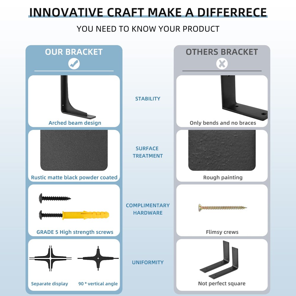 24 INCH x 14.2 INCH shelf brackets,L Shelf Brackets,Rustic Industrial Shelf Brackets with Modern Finish,premium alloy metal heavy duty shelf bracket, Countertop Support Brackets,high strength Mounting Hardware Included, Easy Installation, Pack of 2. 【meaurement】24 x 14.2 inch shelf bracket, apply to 24 inch to 30 inch deep shelf. (board is NOT included) 【perpendicularity】 The brackets are 100% perfect 90-degree vertical angle. 【LOAD 】The Specially made alloy metal material is lighter but stronger than the others on the market. It has greater load- bearing capacity, It can hold up to 320 pounds each pair , 280 pounds is the best weight bearing effect 【powder coating finished】 Matte black coated finish ,durable and sturdiness. L bracket comes with traditional matte black,It fits in perfectly in your farmhouse kitchen, garage, basement storage room, and backyard. 【Complimentary PACK】G5 high strength screws ,screws and anchors are for hard walls. (dry wall anchors not provide) Following the steps properly, put your Pre-prepared lumber board on, you will get your perfect and stable floating shelves.