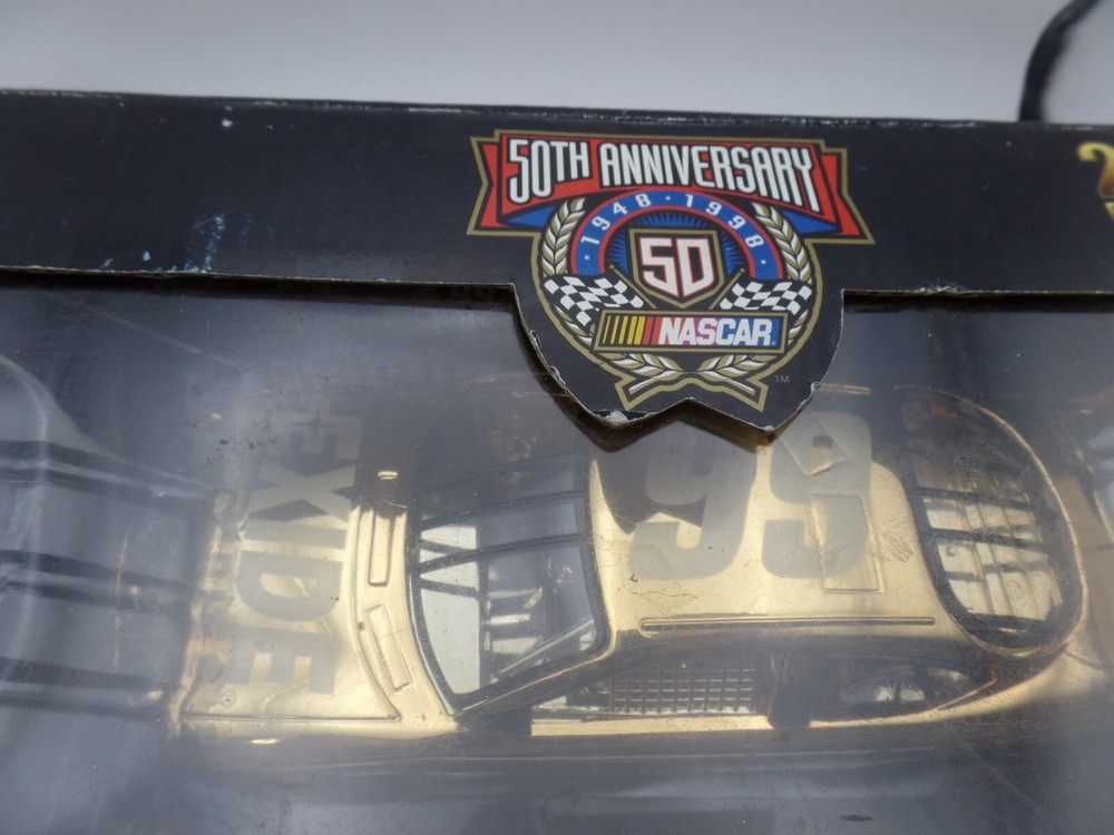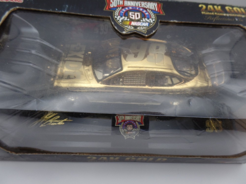The Racing Champions 24K Gold 50th Anniversary 1:24 #99 Jeff Burton Die Cast Nascar is a commemorative die-cast model of a Ford Taurus NASCAR racecar driven by Jeff Burton in 1998. This limited edition collectible features a 24k gold plated finish, making it a unique addition to any NASCAR fan's collection. It comes with a case, sleeve, and box for display purposes and is part of the Commemorative Series by Racing Champions, celebrating the 50th anniversary of NASCAR. Please review all photos.